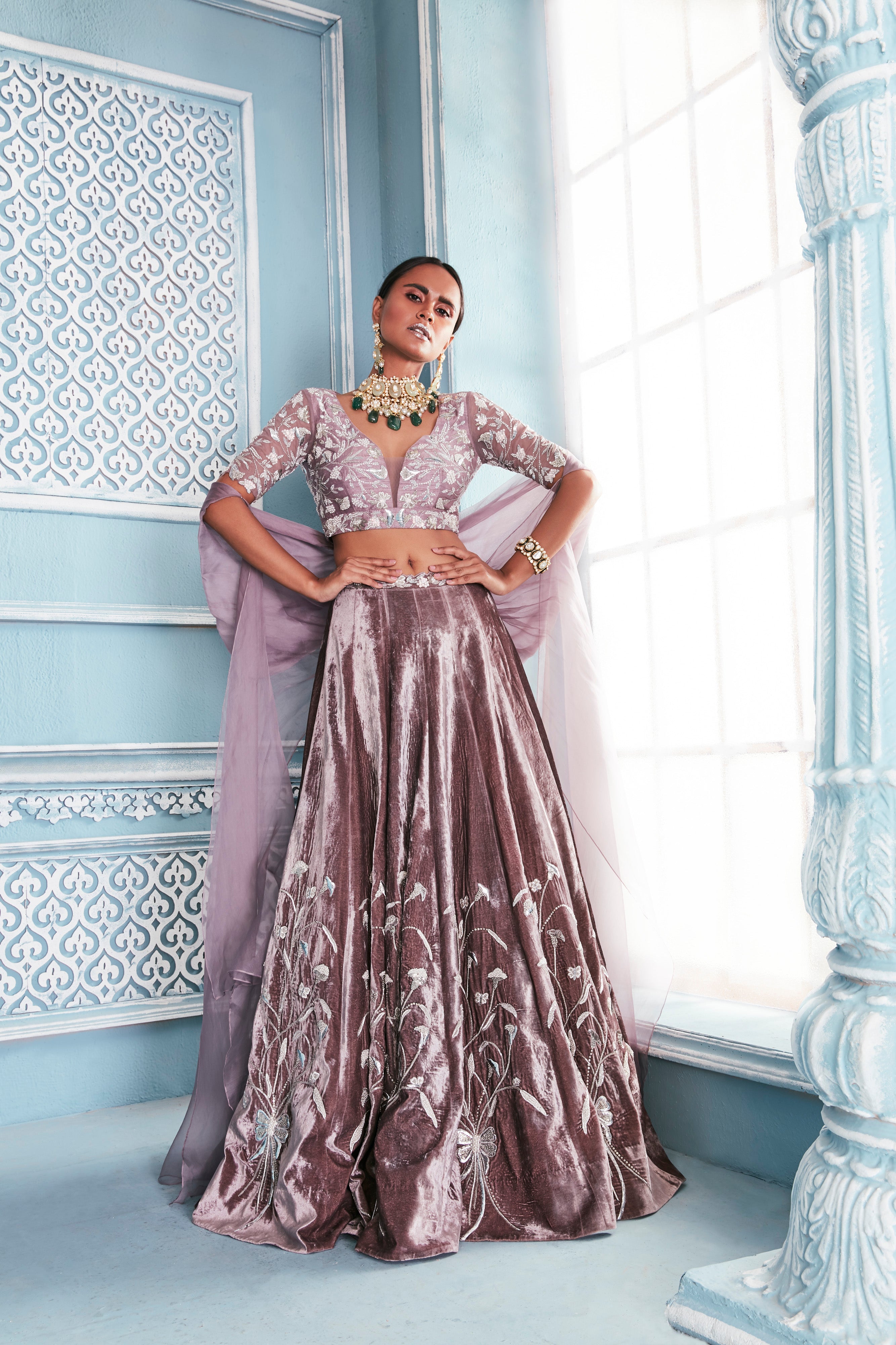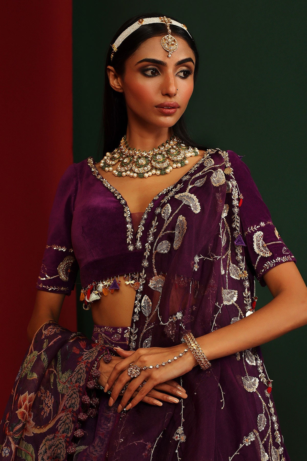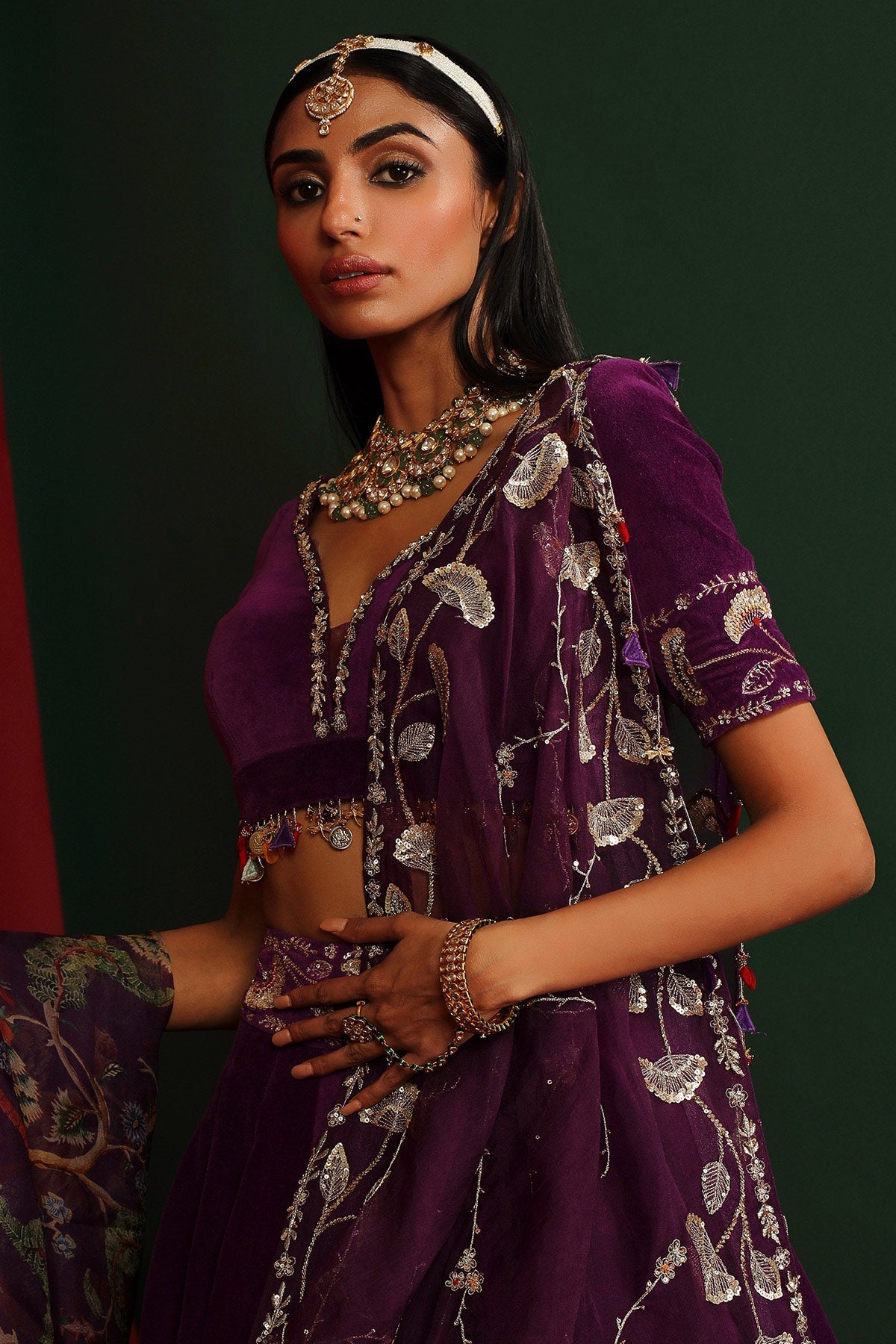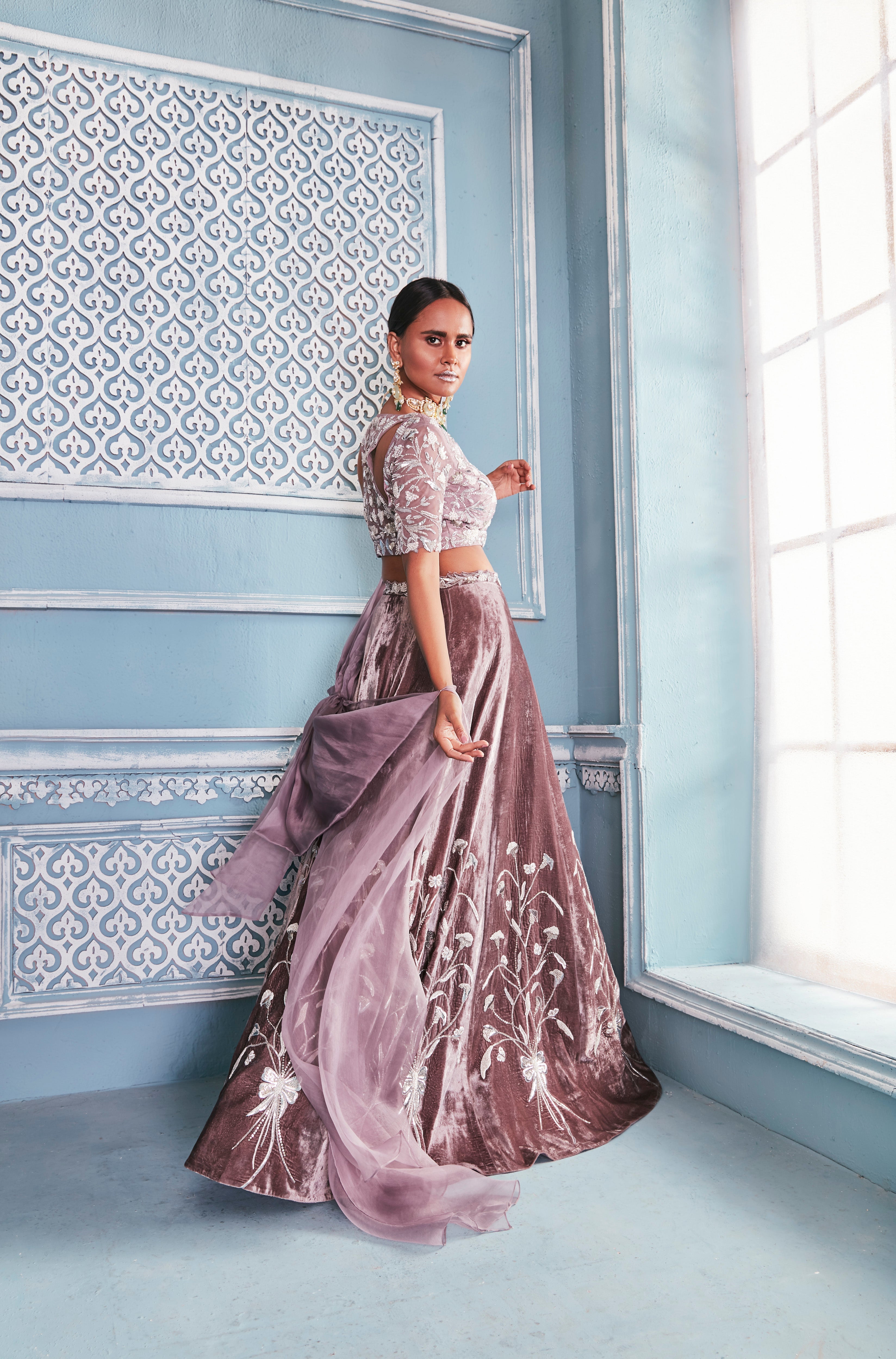 Razer Back Blouse with Velvet Tulip Lehenga Set