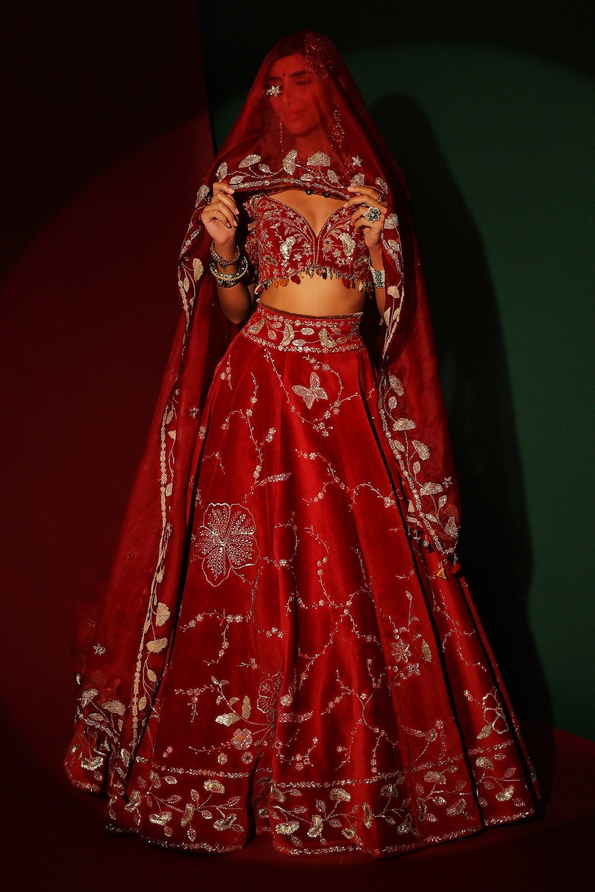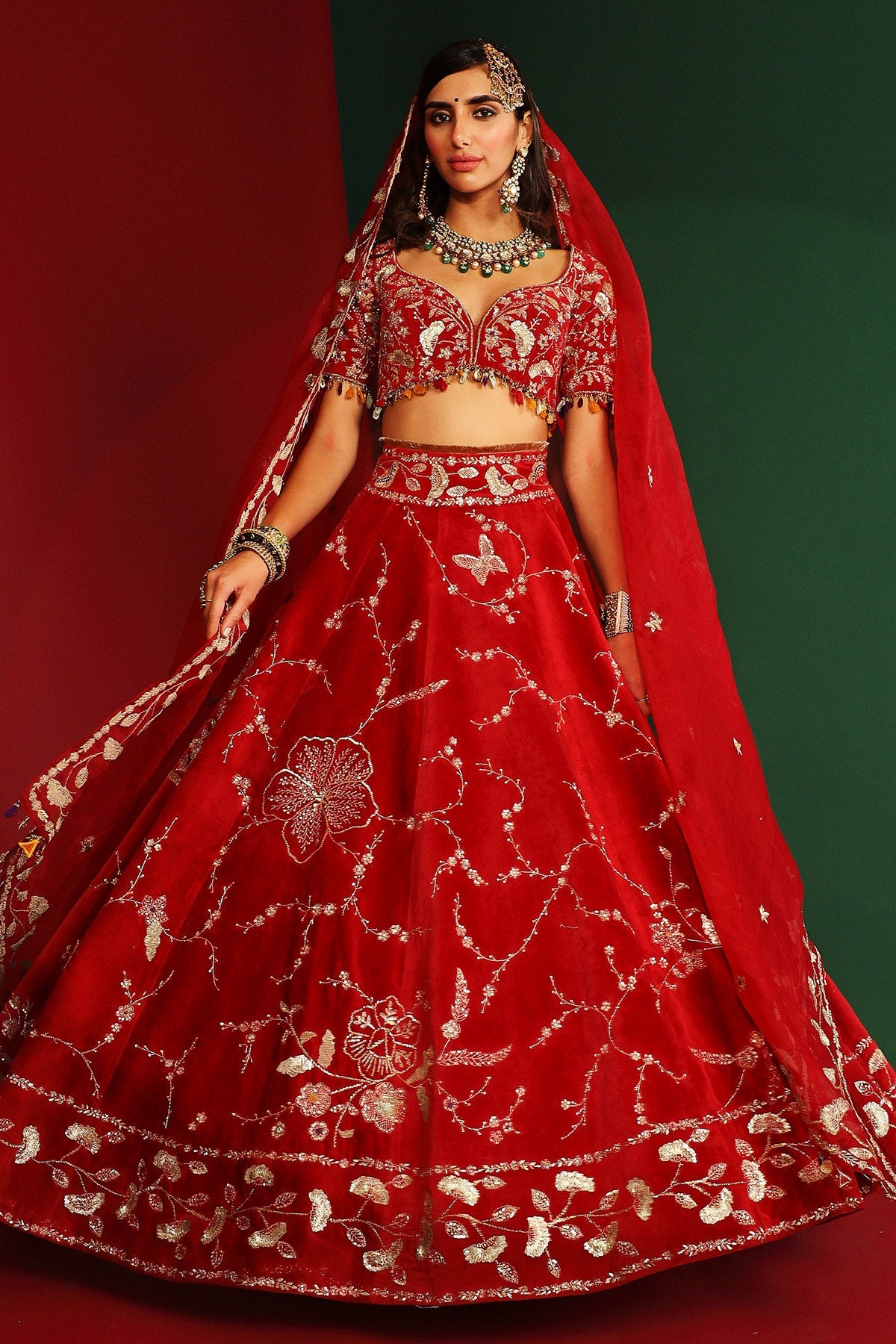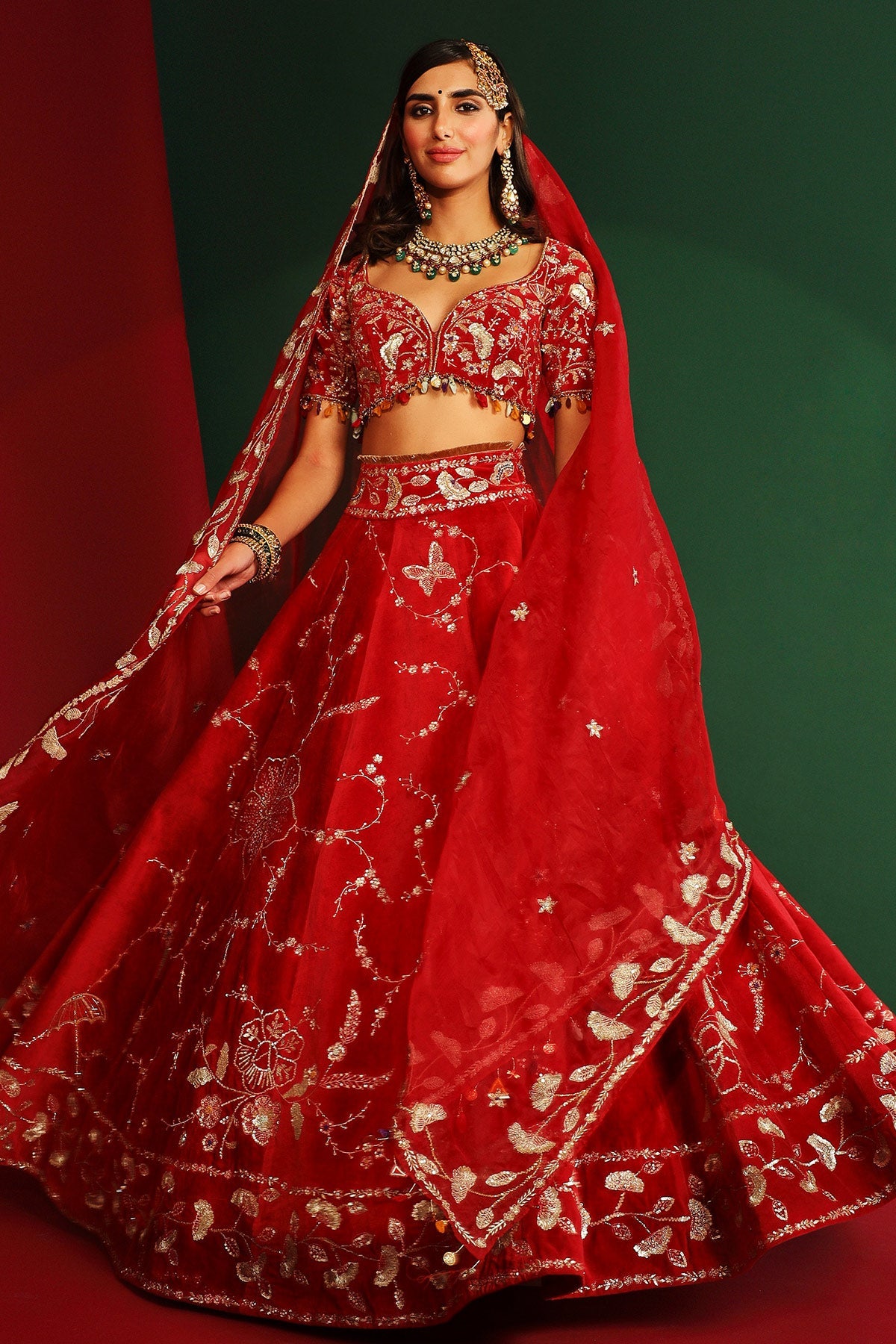 Red Hena Embroidered Lehenga Set By Mahima Mahajan