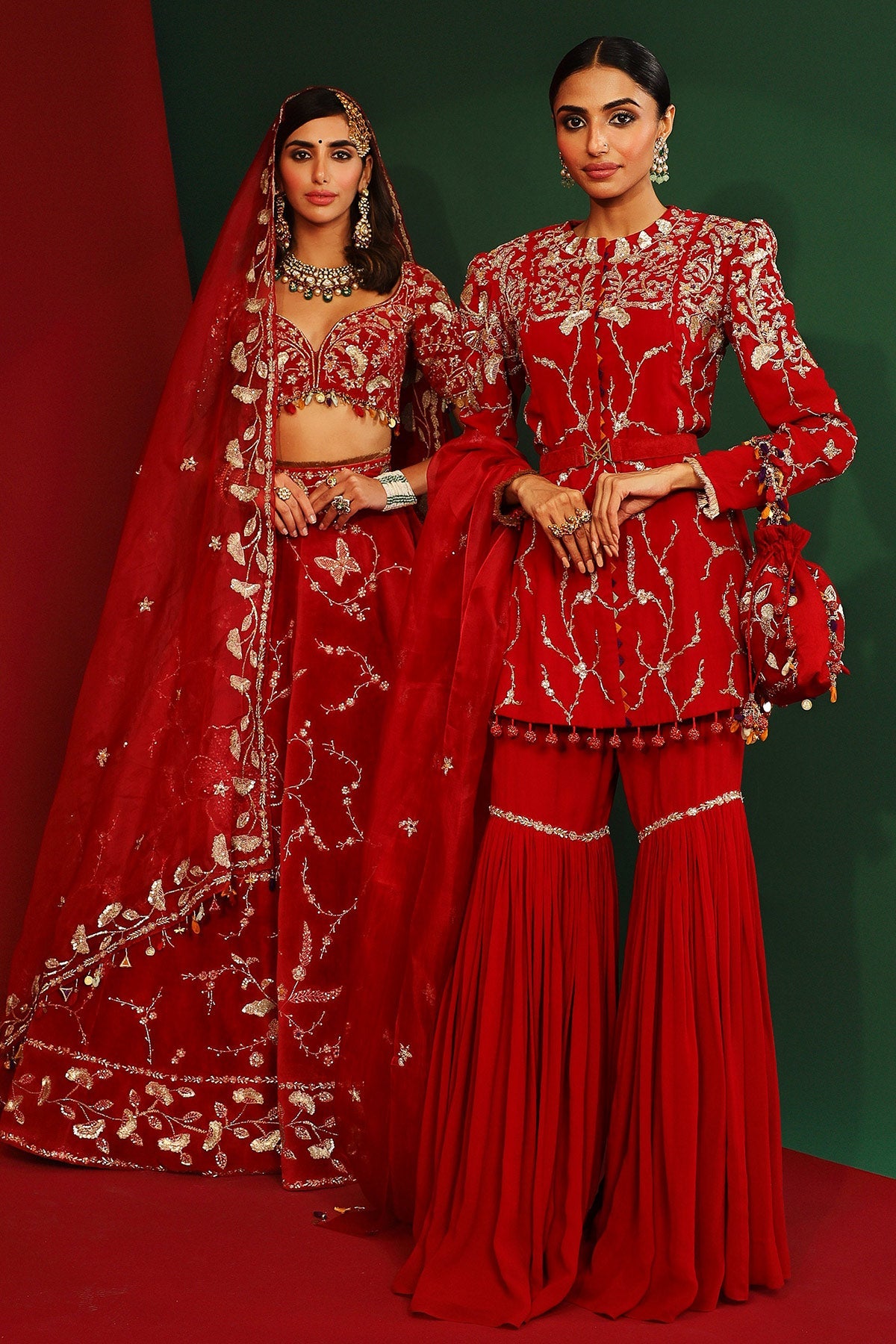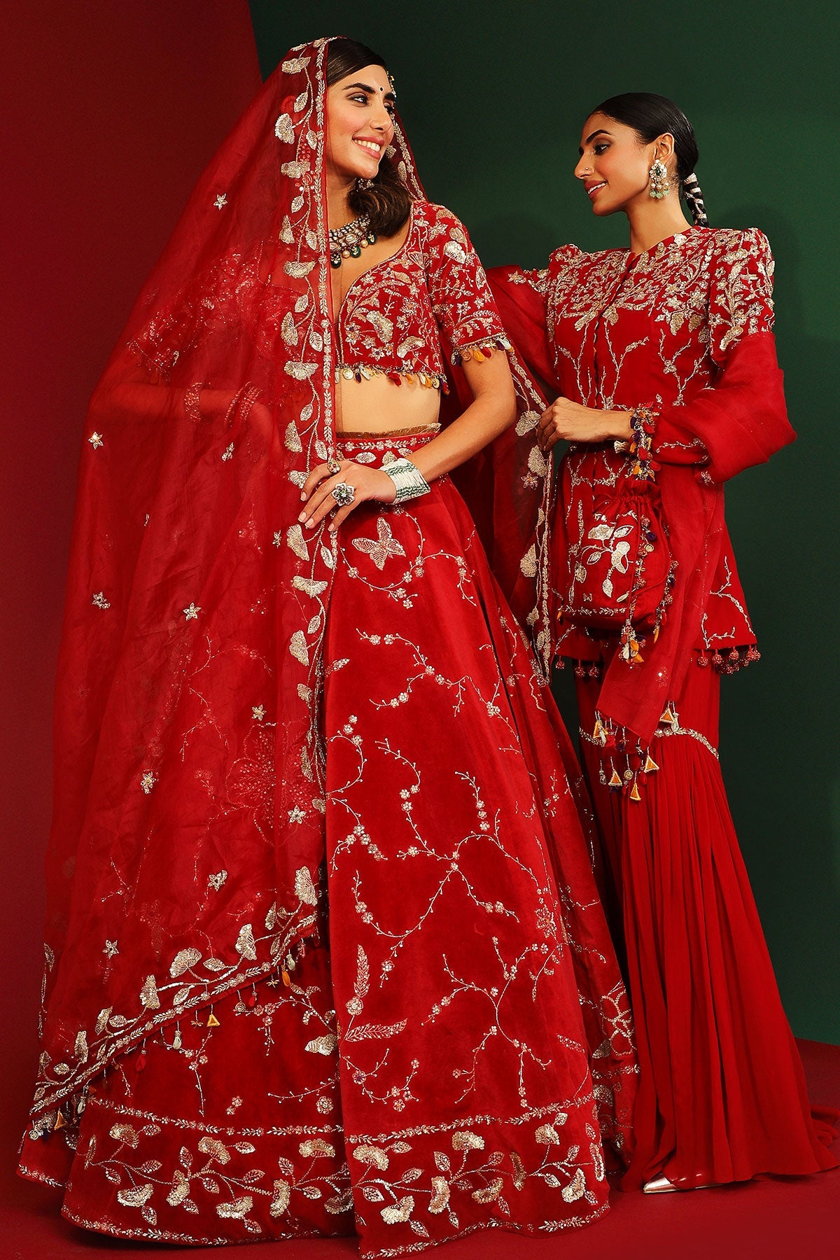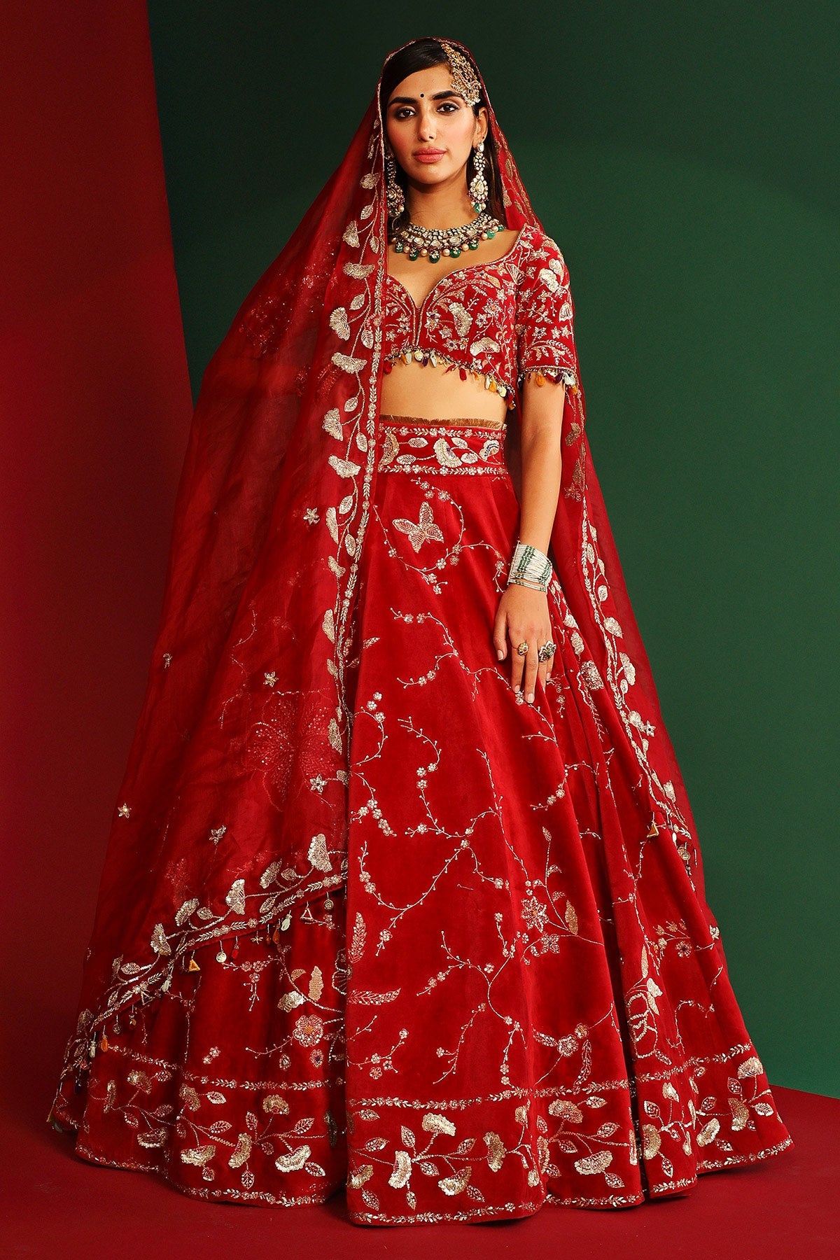 Red Hena Embroidered Lehenga Set By Mahima Mahajan