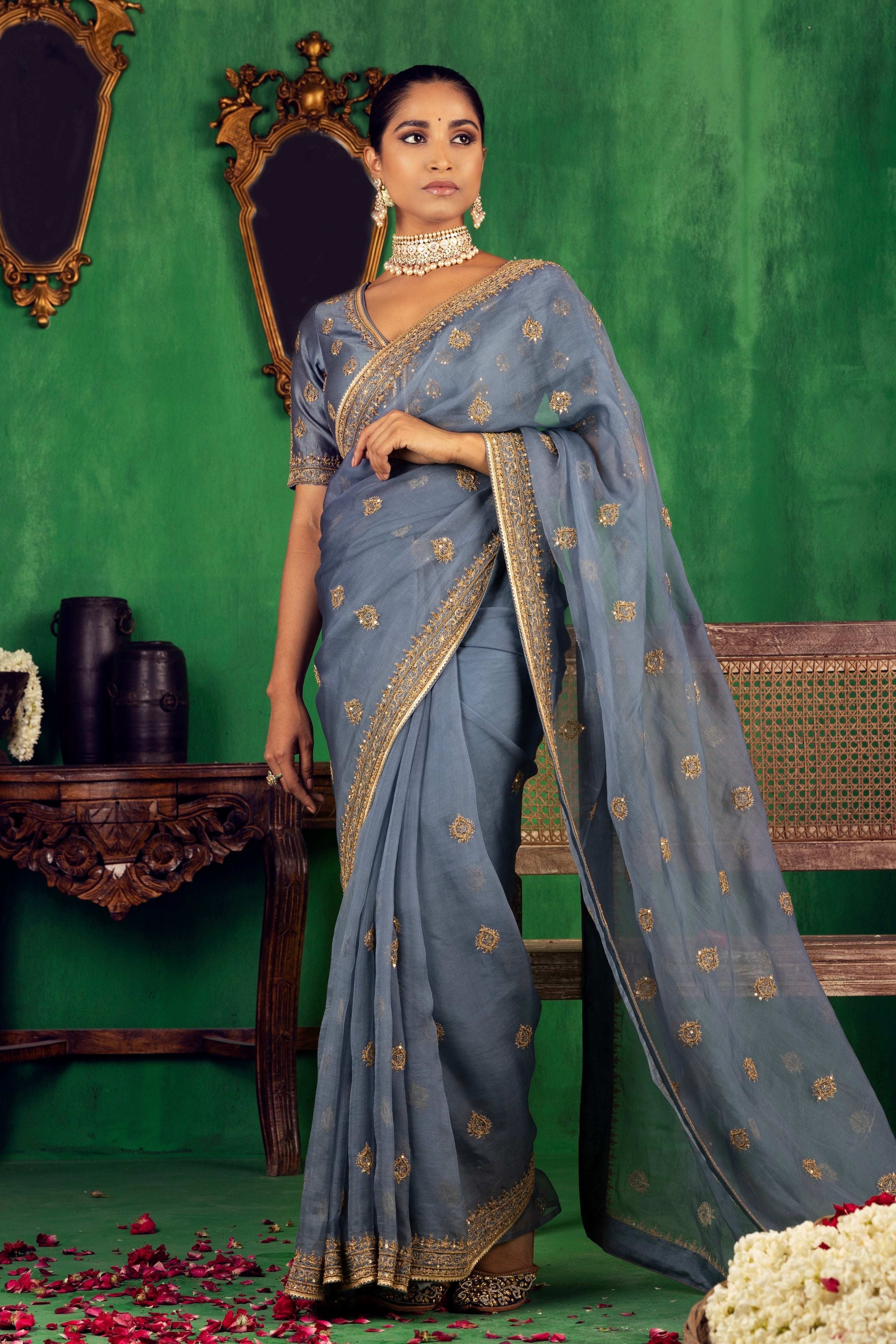 Featuring a dusty blue organza saree paired with a chanderi blouse with gold dori and aari embroidery