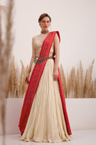 A Red Silk Jamdani saree.Complementing this masterpiece is a premium Banarasi Brocade blouse, exuding elegance, while a flowing cream Habutai Silk crinkled skirt adds a touch of grace, the blouse is adorned with meticulously crafted handmade tassels, elevating the overall aesthetic.
