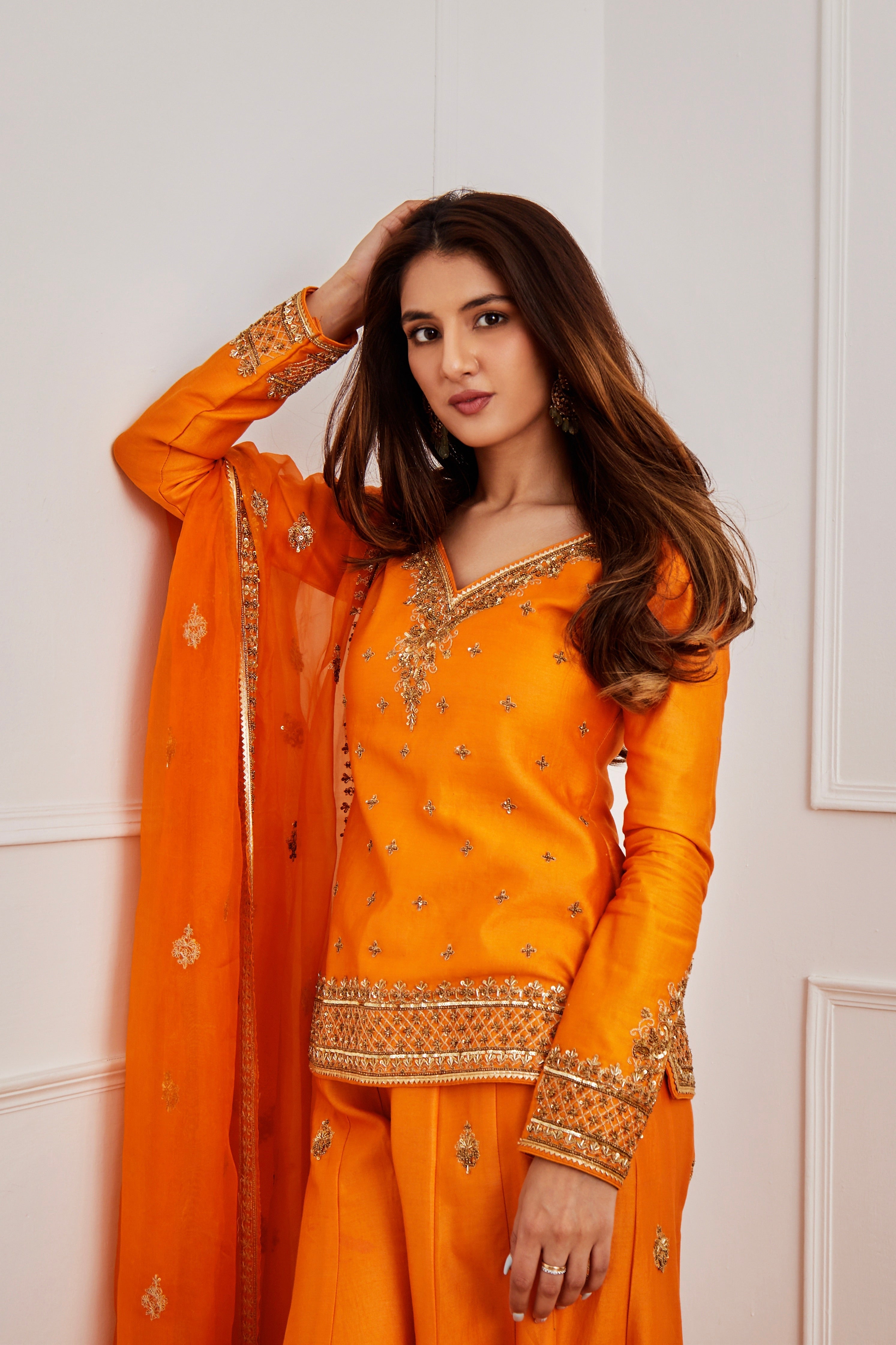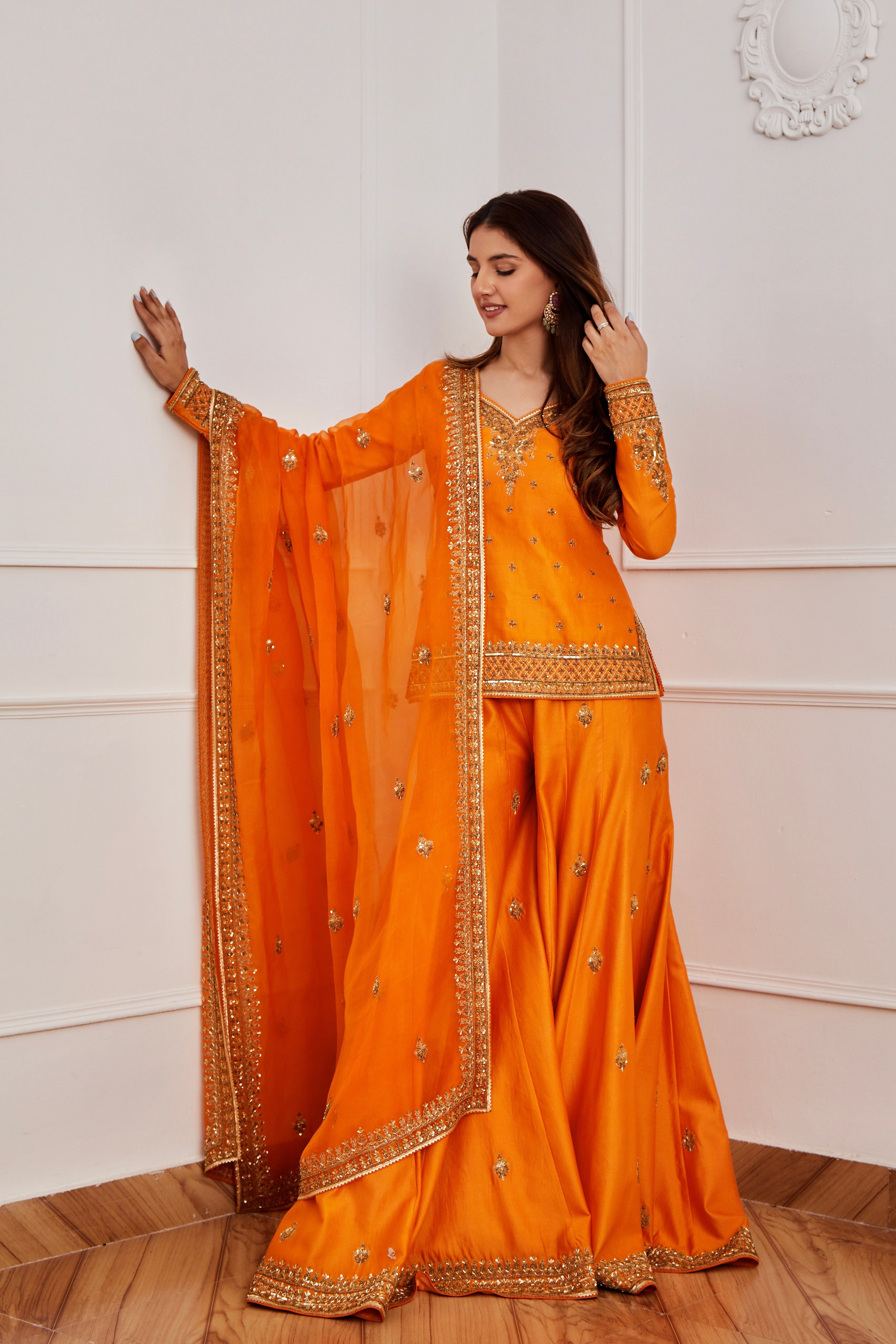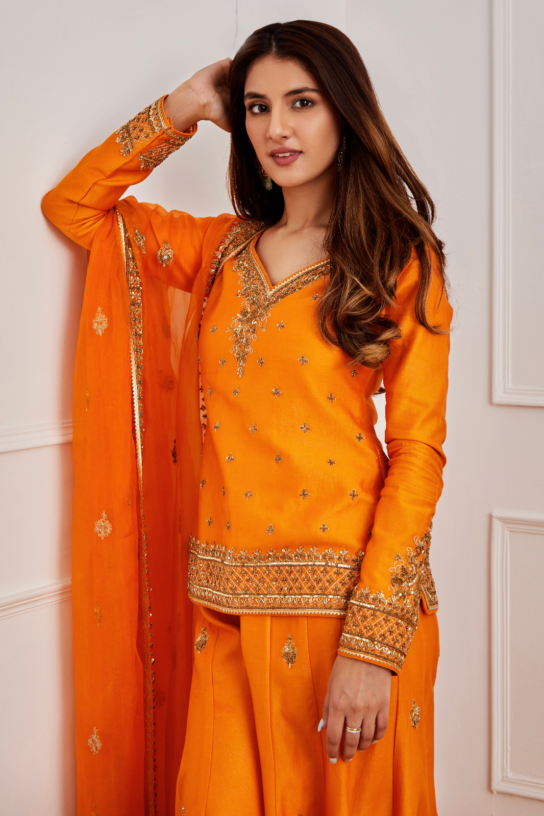 Featuring an orange Chanderi kurta sharara set paired with an Organza base dupatta with antic gold dori and aari embroidery
