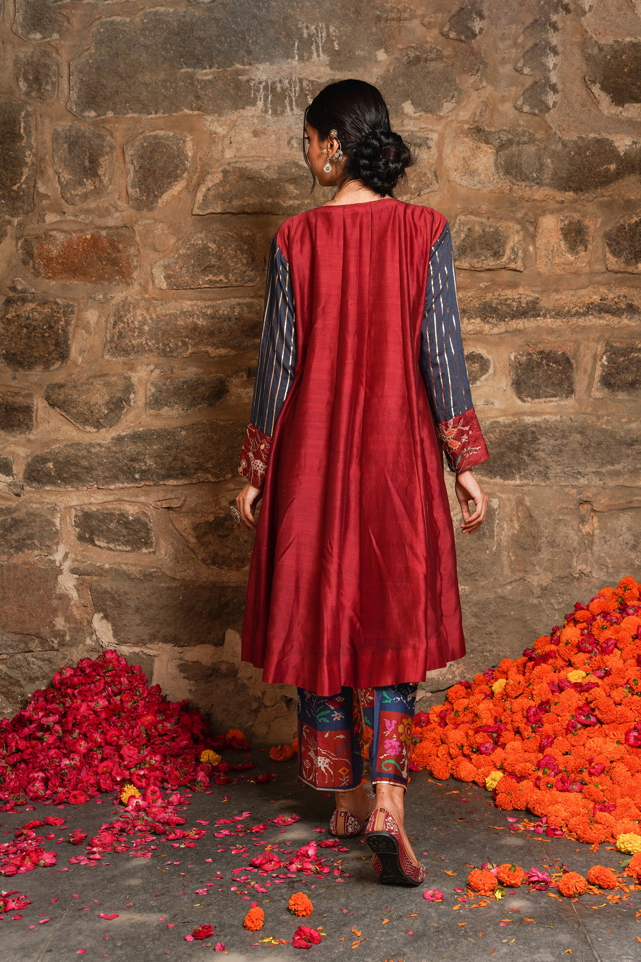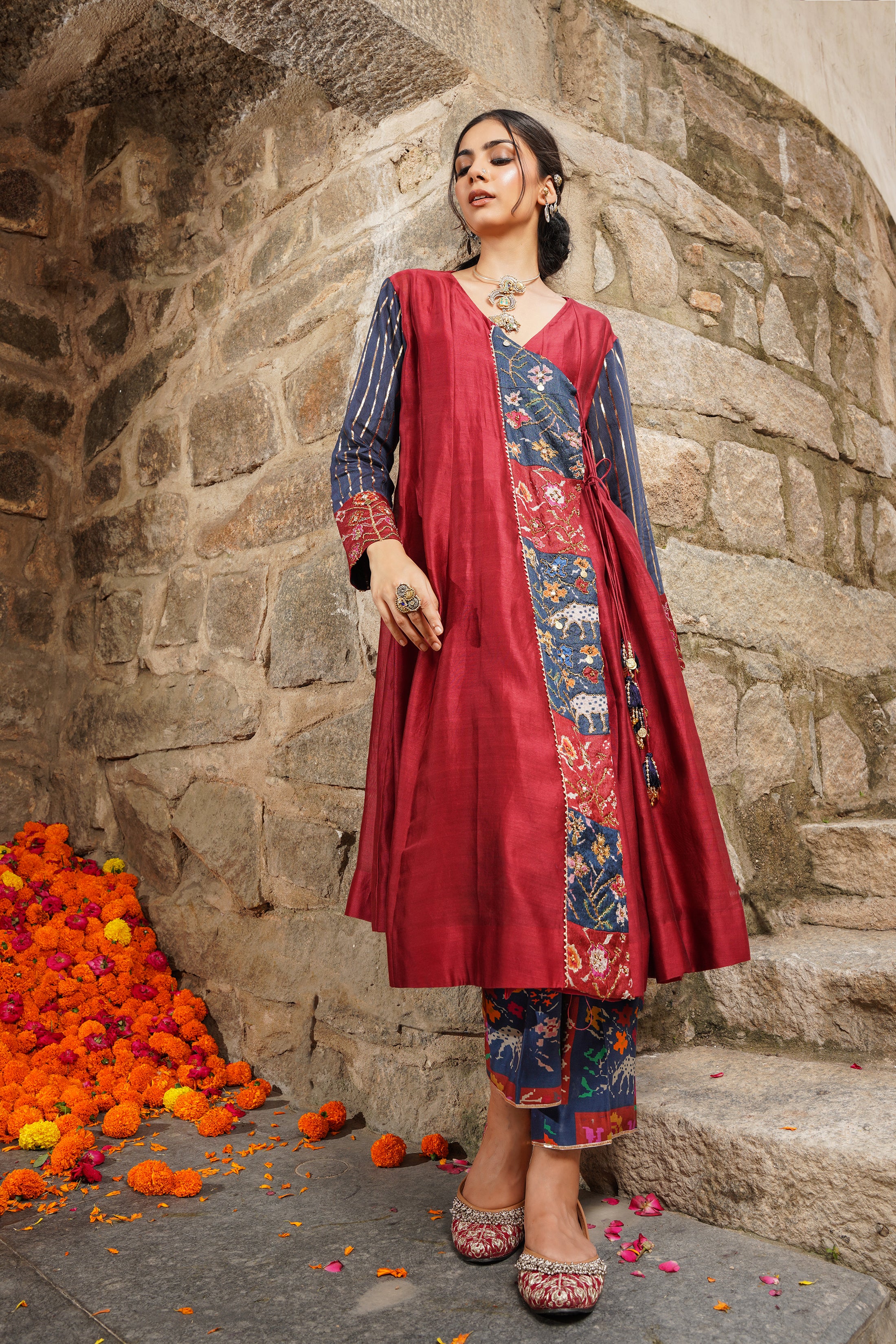 This majestic maroon anghrakha kurti set is a harmonious blend of art and fashion, with meticulous attention to detail. Tailored with precision, exuding an auro of opulence and sophistication. This ensemble is a must have to attend festive celebrations.