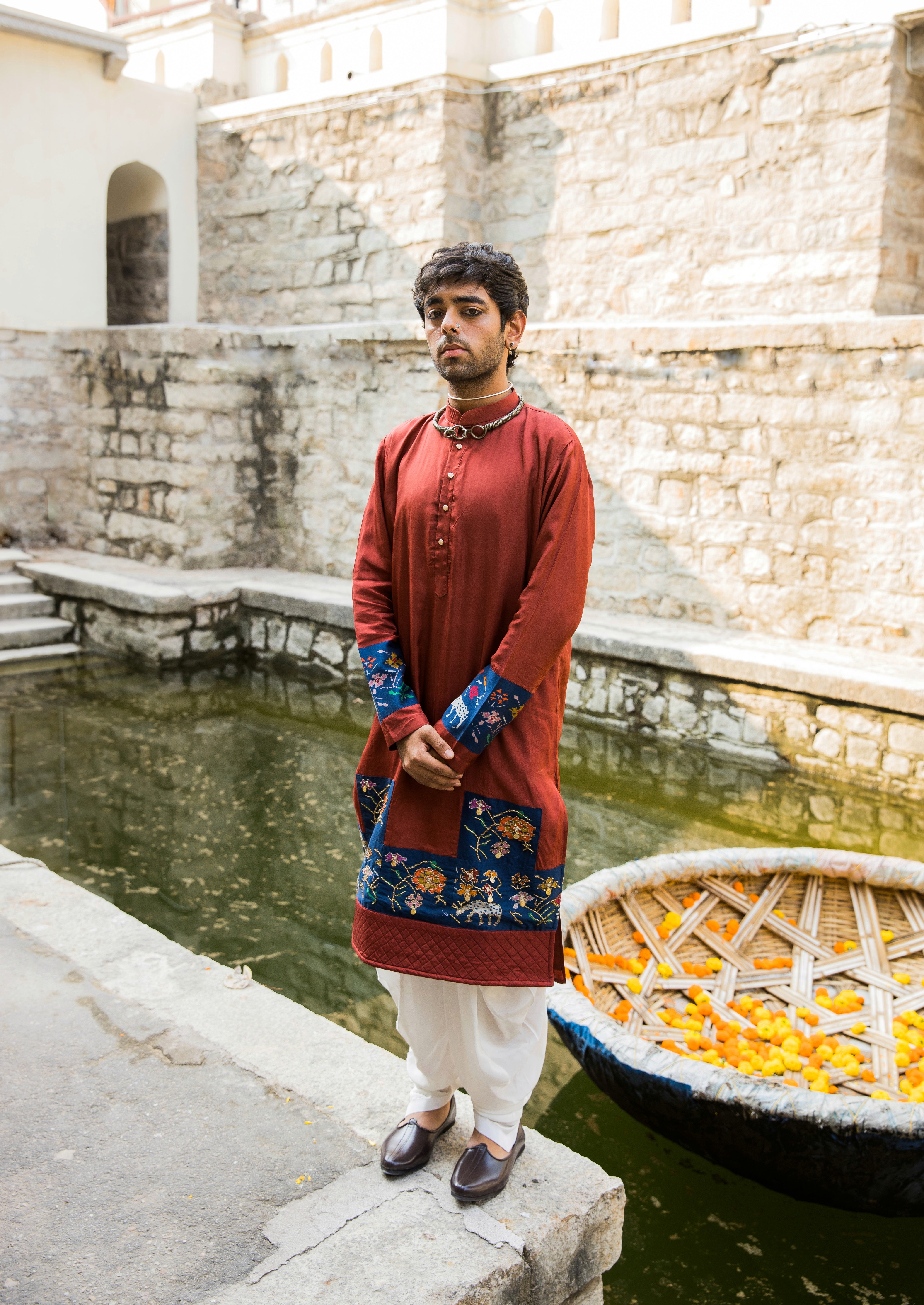 Featuring majestic maroon kurta set, a regal and distinguished attire, materializes as a tasteful fusion of traditional charm and contemporary finesse. Complemented by coordinating pants, this ensemble exudes a dignified opulence. This attire is perfect for festive celebrations.