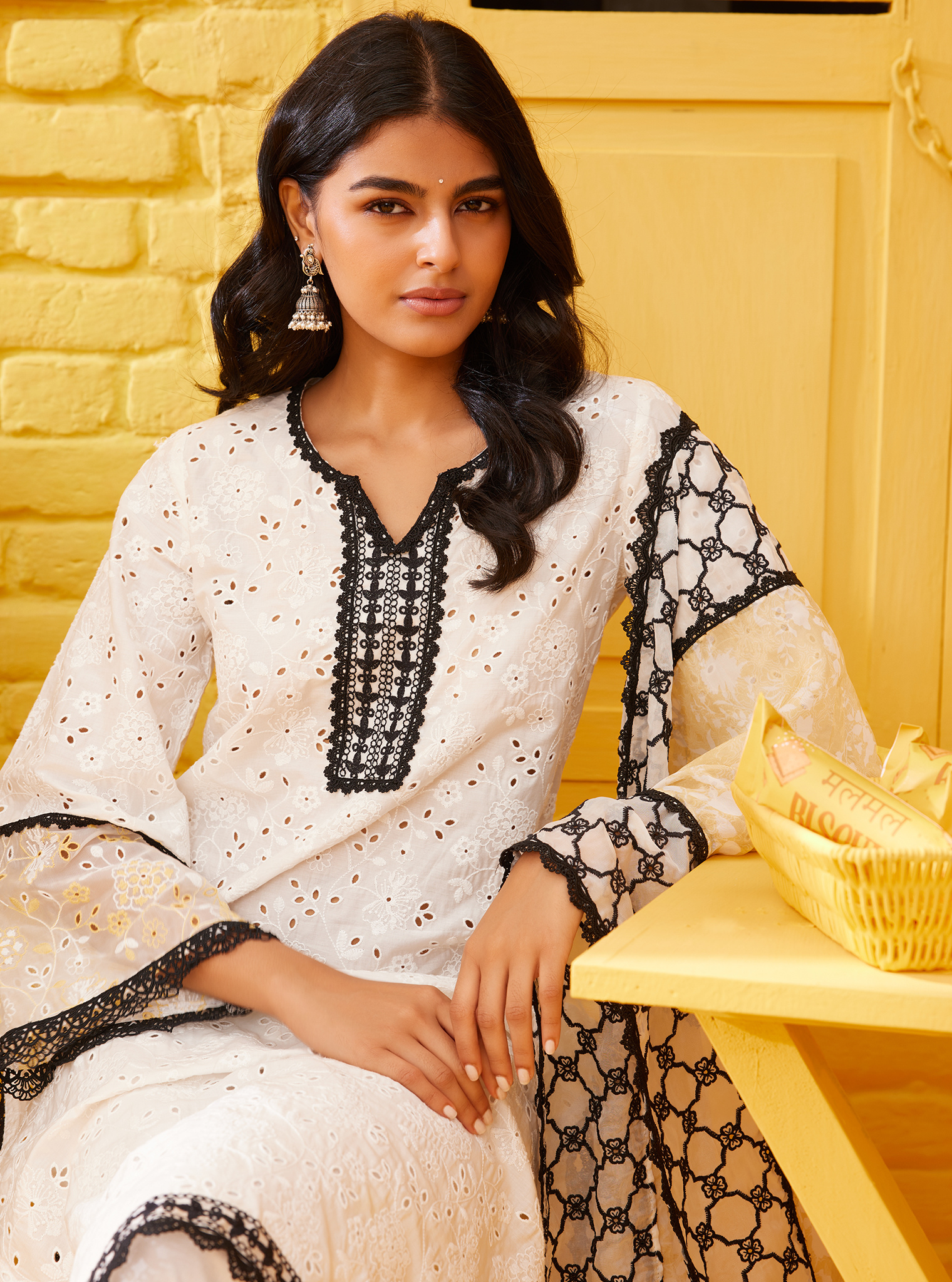 A breath of fresh air to your wardrobe, this kurta set is a delightful blend of elegance and charm. Crafted in pristine white, the kurta features intricate self-embroidery all over. The delicate black lace detailing along the neckline and sleeves adds a touch of vintage romance, making it perfect for any occasion where you want to feel both graceful and effortlessly chic. The accompanying straight trousers mirror the kurta’s exquisite embroidery, creating a harmonious and cohesive look. But the eyecatcher is the dupatta, a sheer beauty adorned with a striking print.