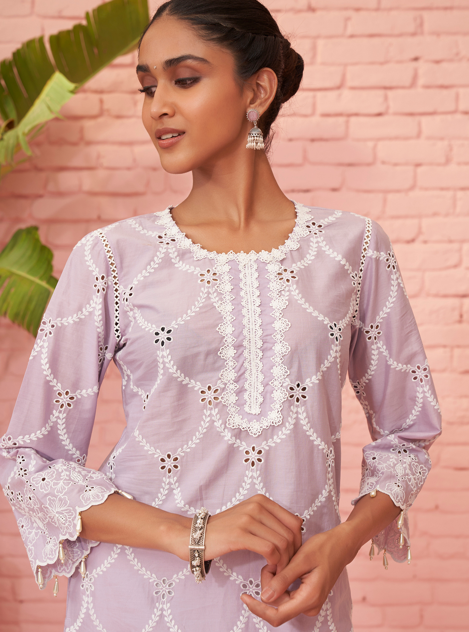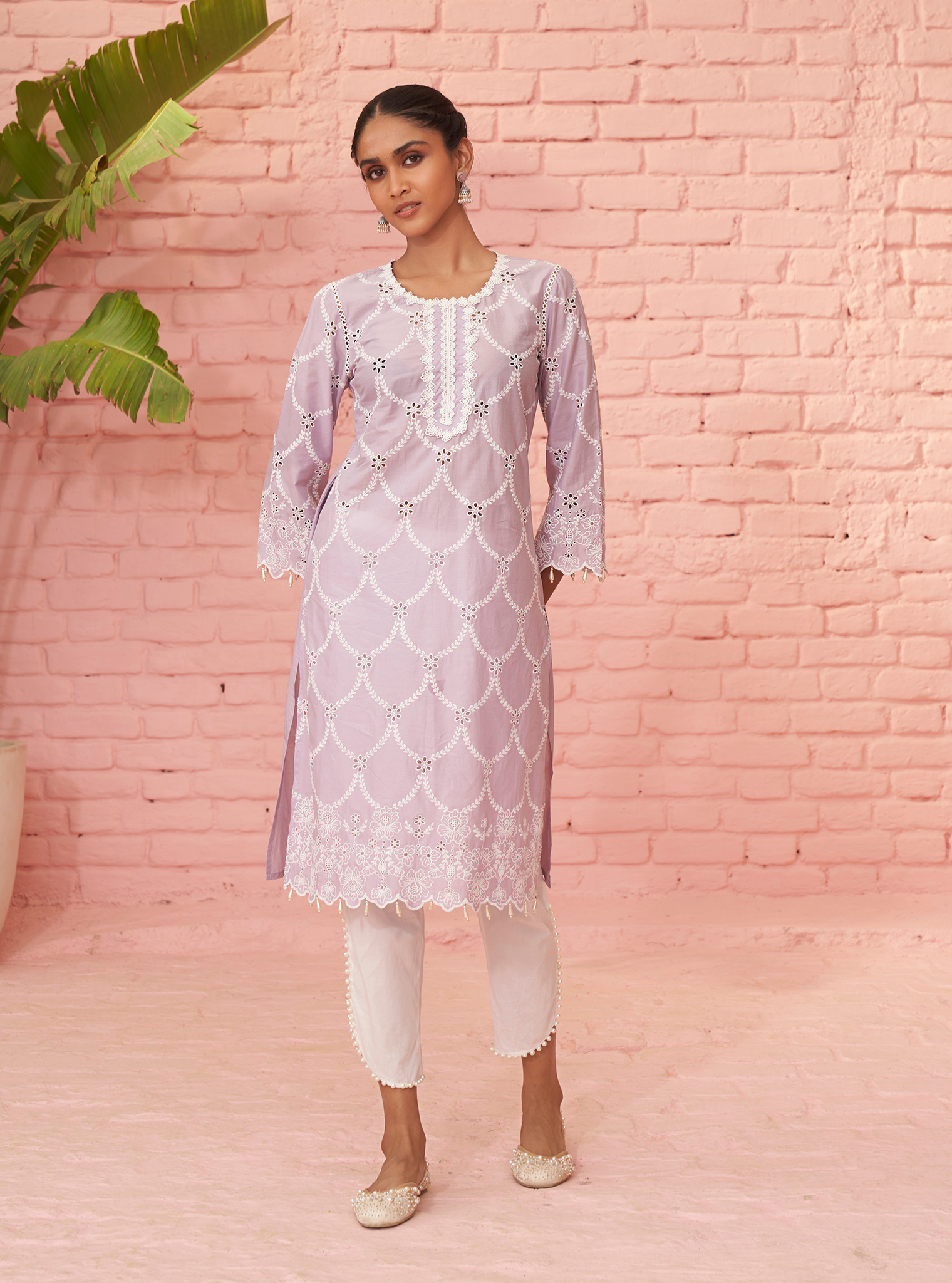 Pair the kurta with the matching lilac dupatta, featuring scalloped edges and delicate embroidery all over.