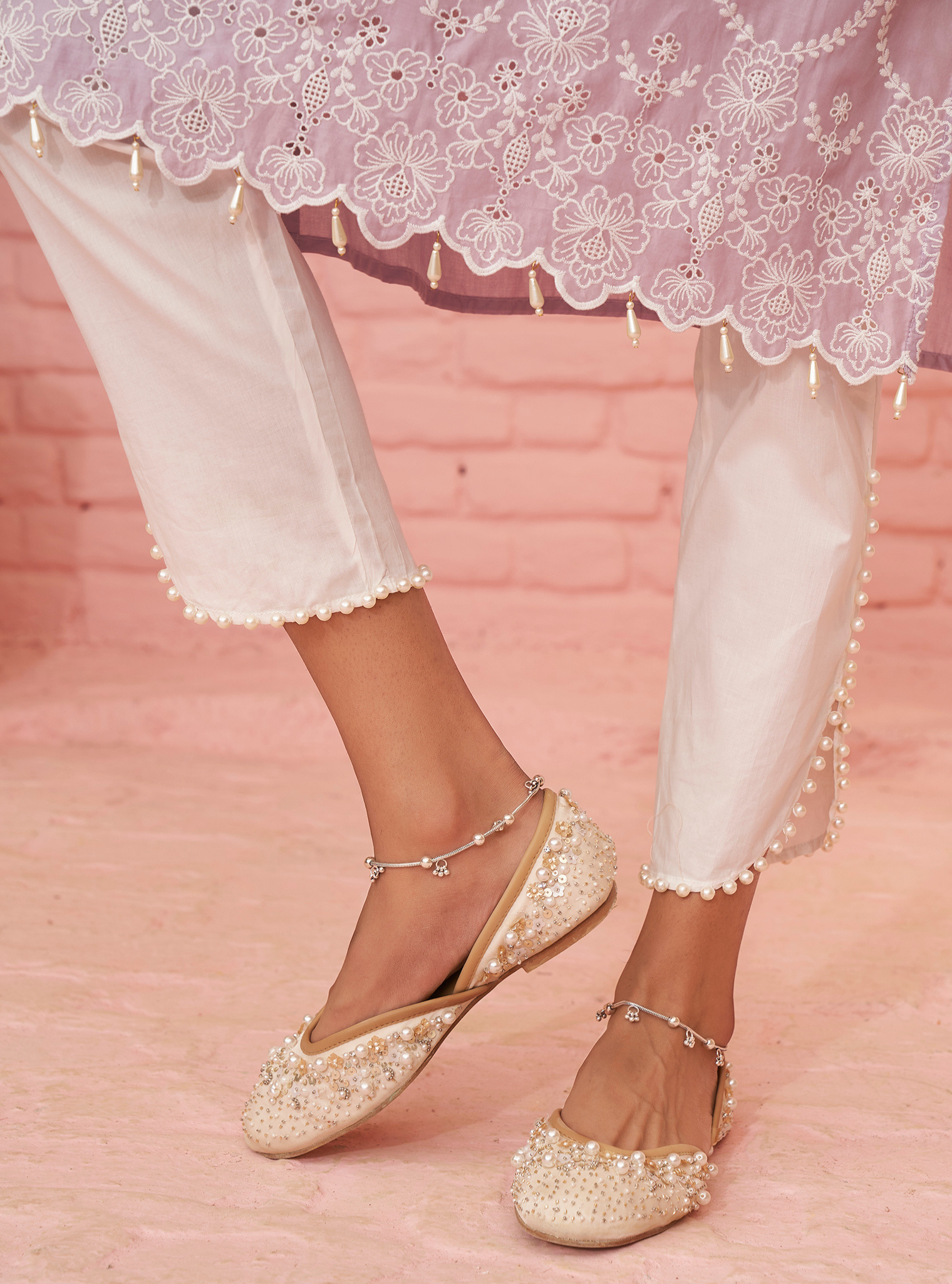 Contact Us For CustomizationInfuse your wardrobe with elegance with this regal lilac kurta set. The kurta is adorned with delicate white thread embroidery that creates a subtle contrast against the delicate base, exuding an aura of freshness. The round neckline is adorned with white lace trim and the sleeves and hemline are scalloped with delicate pearl hangings.
