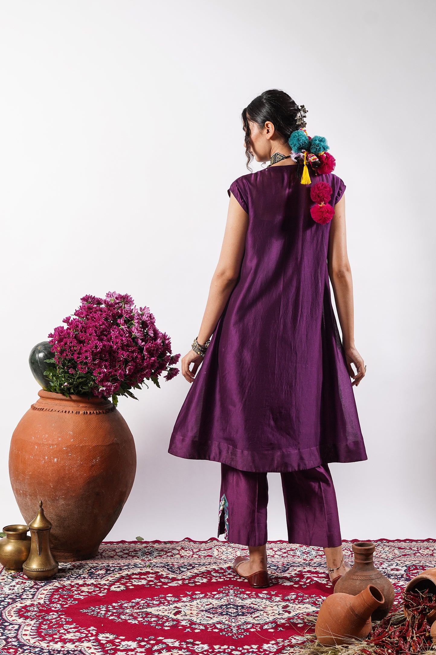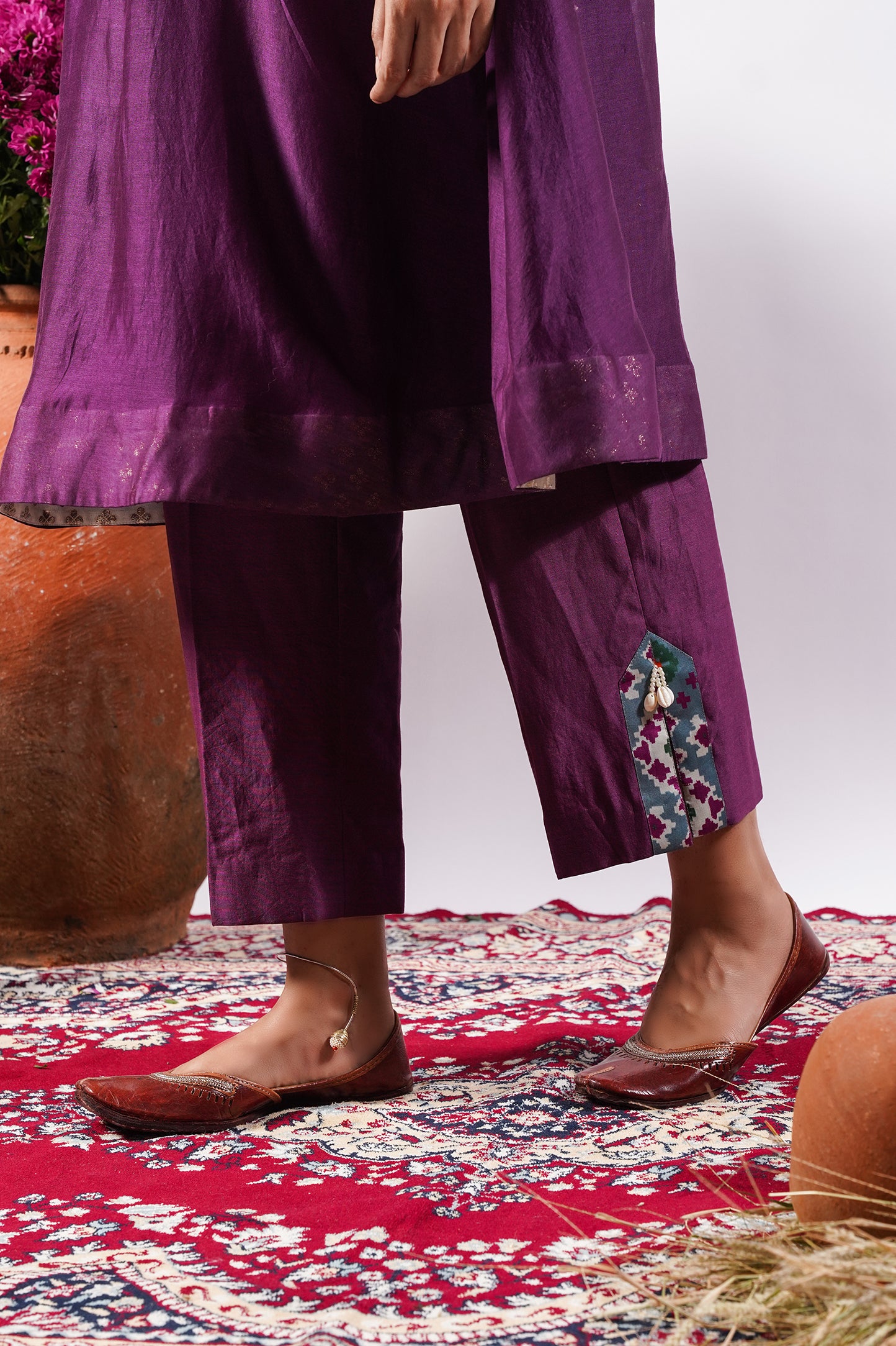 A regal purple chanderi ensemble of the highest sartorial pedigree, meticulously fashioned from luminous ikkat, befitting attire for attending special occassions.