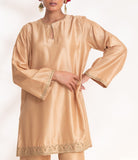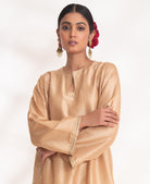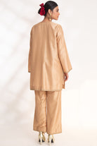 A Beige short kurta set paired with straight pants, embellished with intricate antique gold zardozi embroidery.