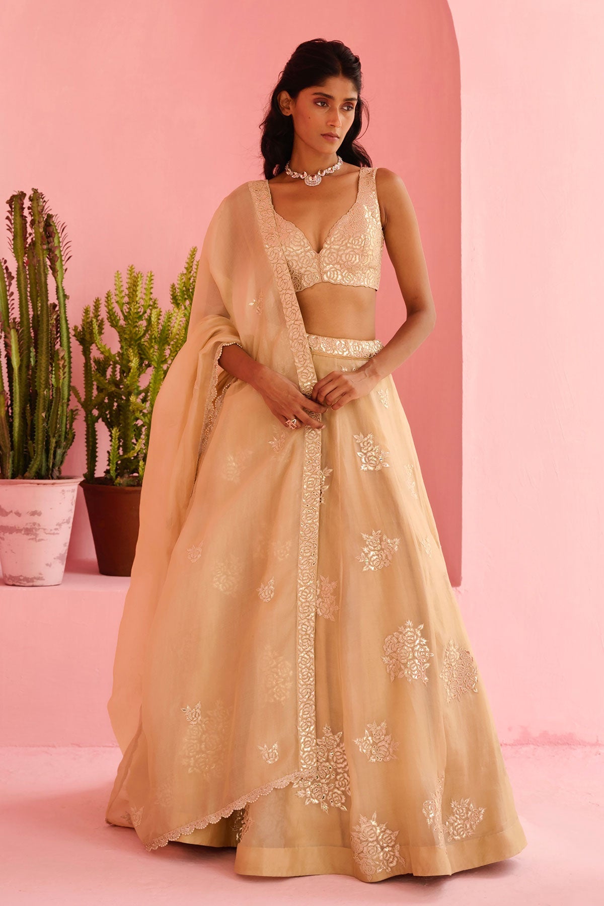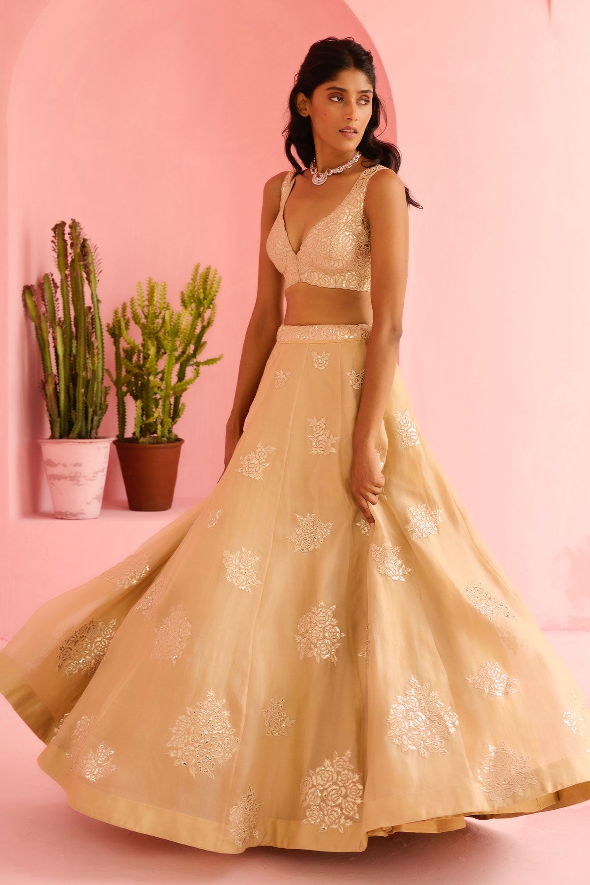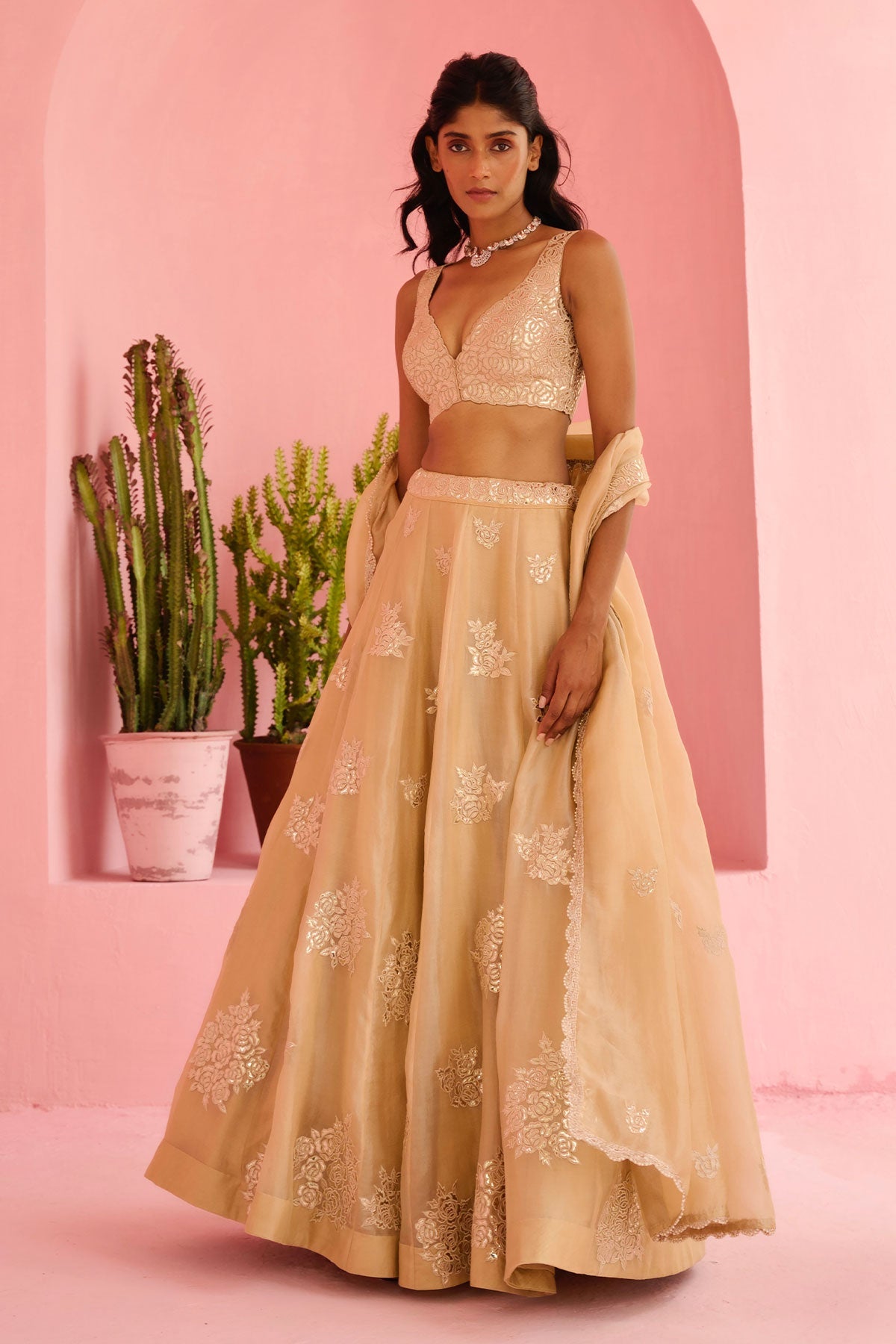 Thread and faux metallic leather embroidered sweetheart neck raw silk blouse paired with faux metallic leather rose embellished organza lehenga and organza dupatta.