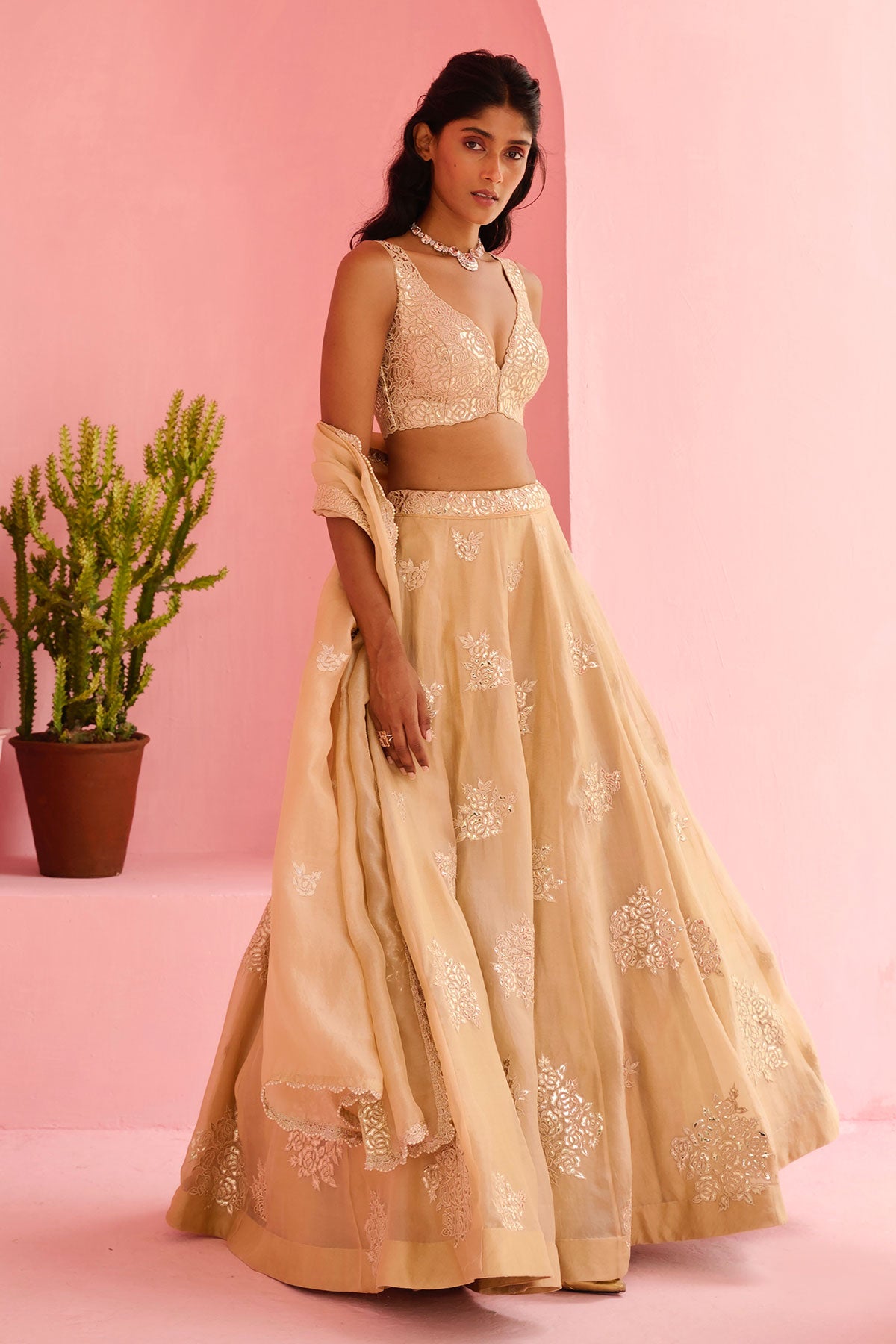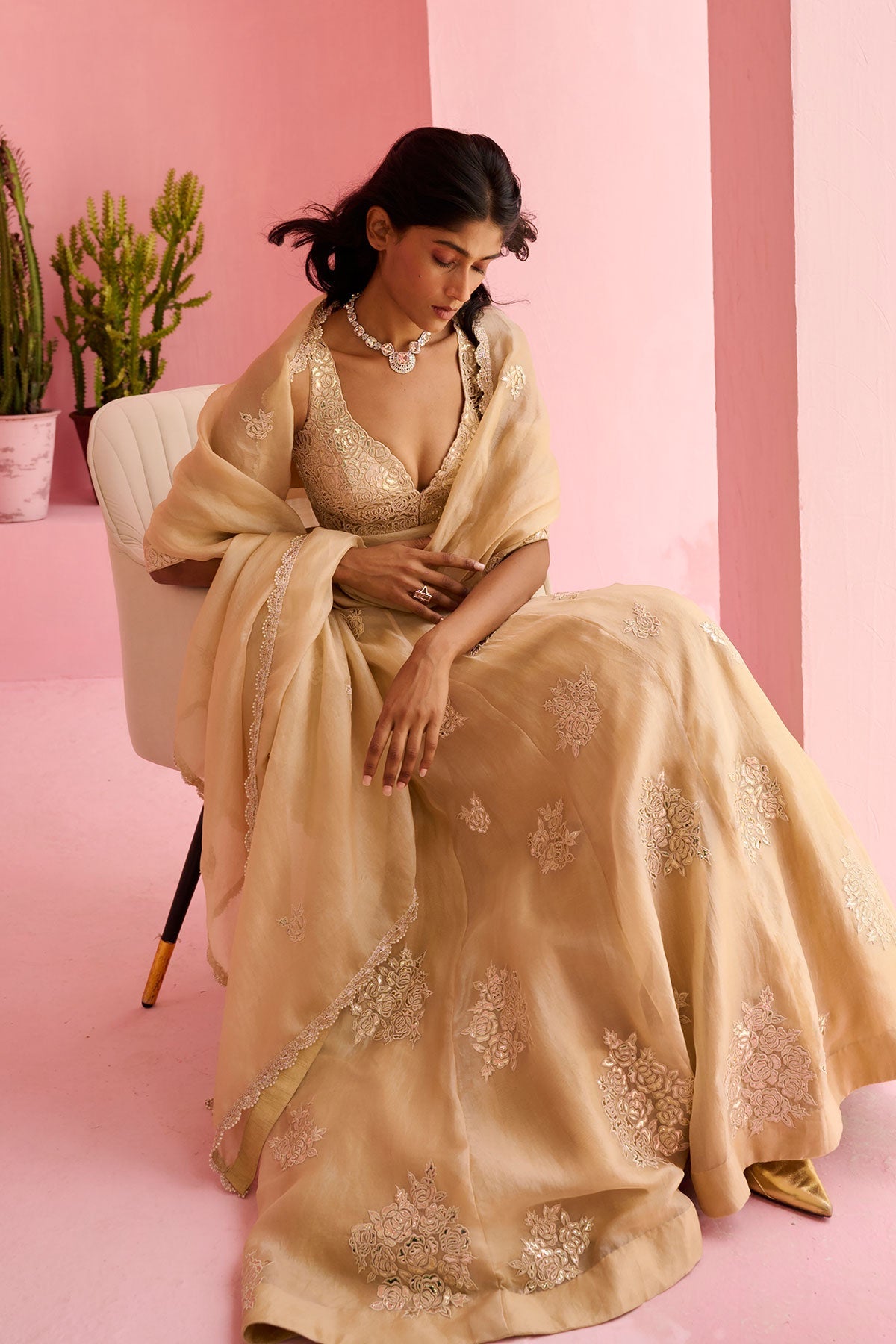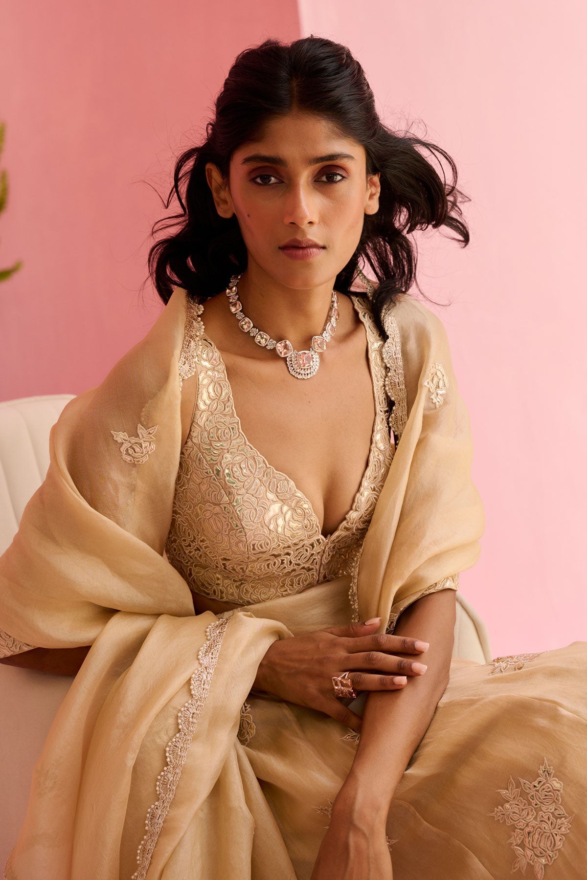 Thread and faux metallic leather embroidered sweetheart neck raw silk blouse paired with faux metallic leather rose embellished organza lehenga and organza dupatta.