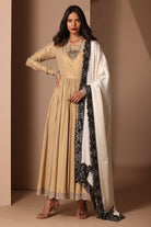 An Anarkali set kurta crafted from Metallic Gold Silk handloom fabric and paired impeccably with a contrast dupatta in Silk Satin, adorned with Rhinestones, creating a harmonious fusion of classic allure and modern opulence.