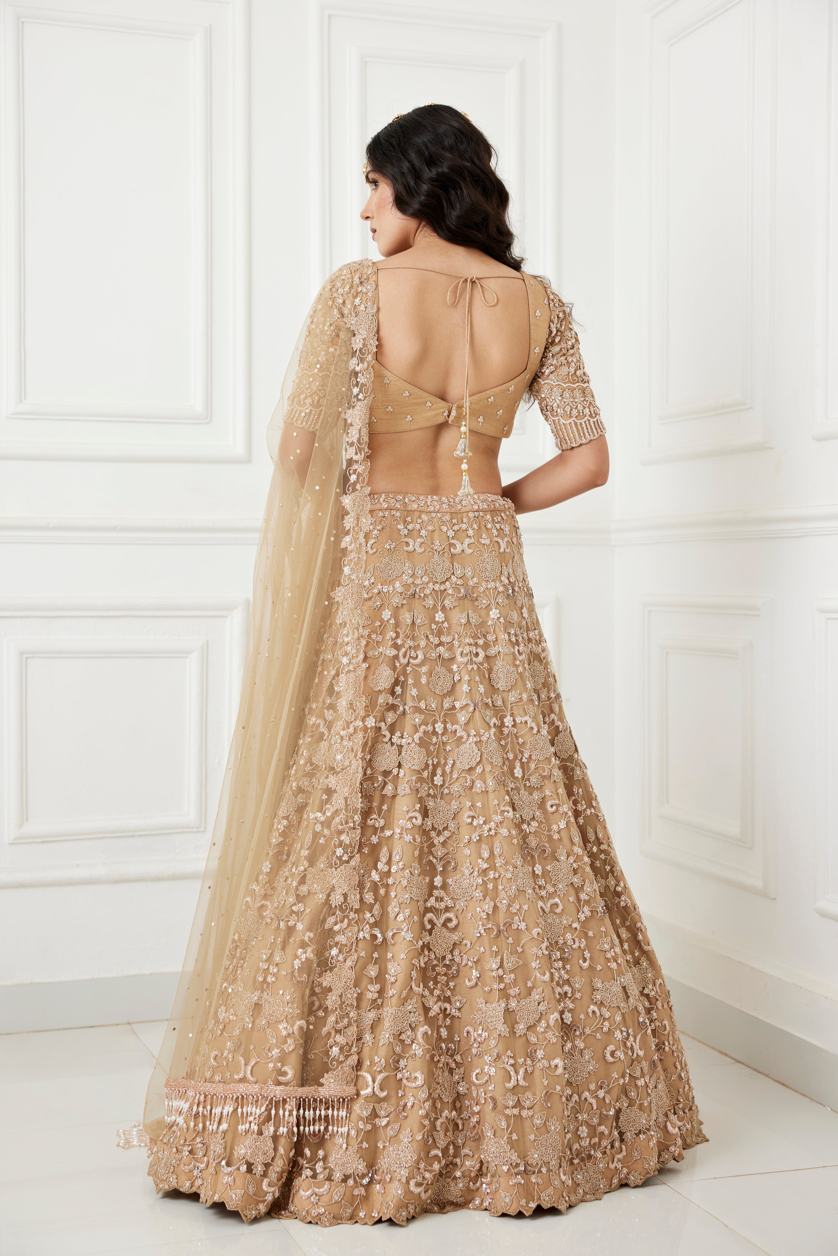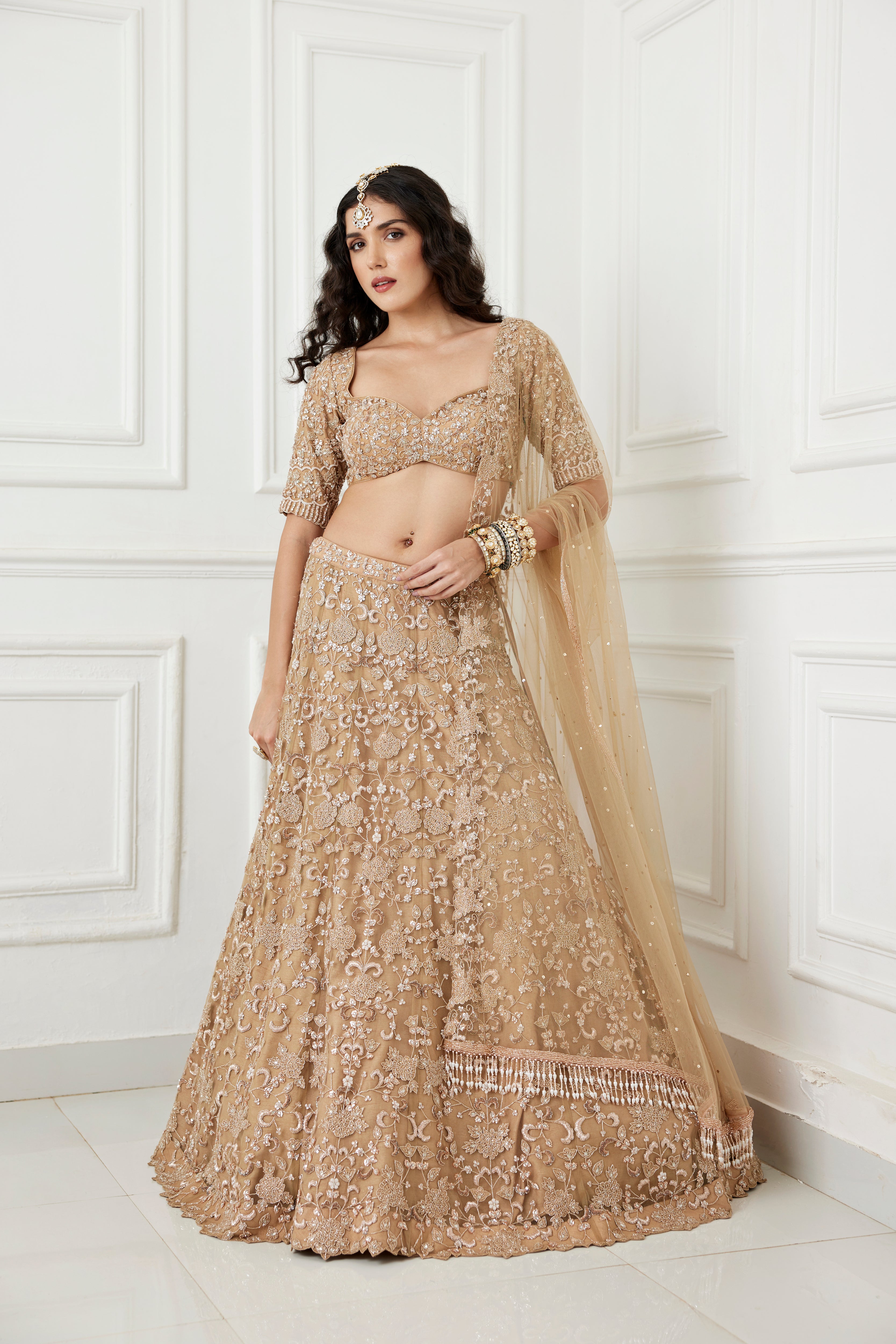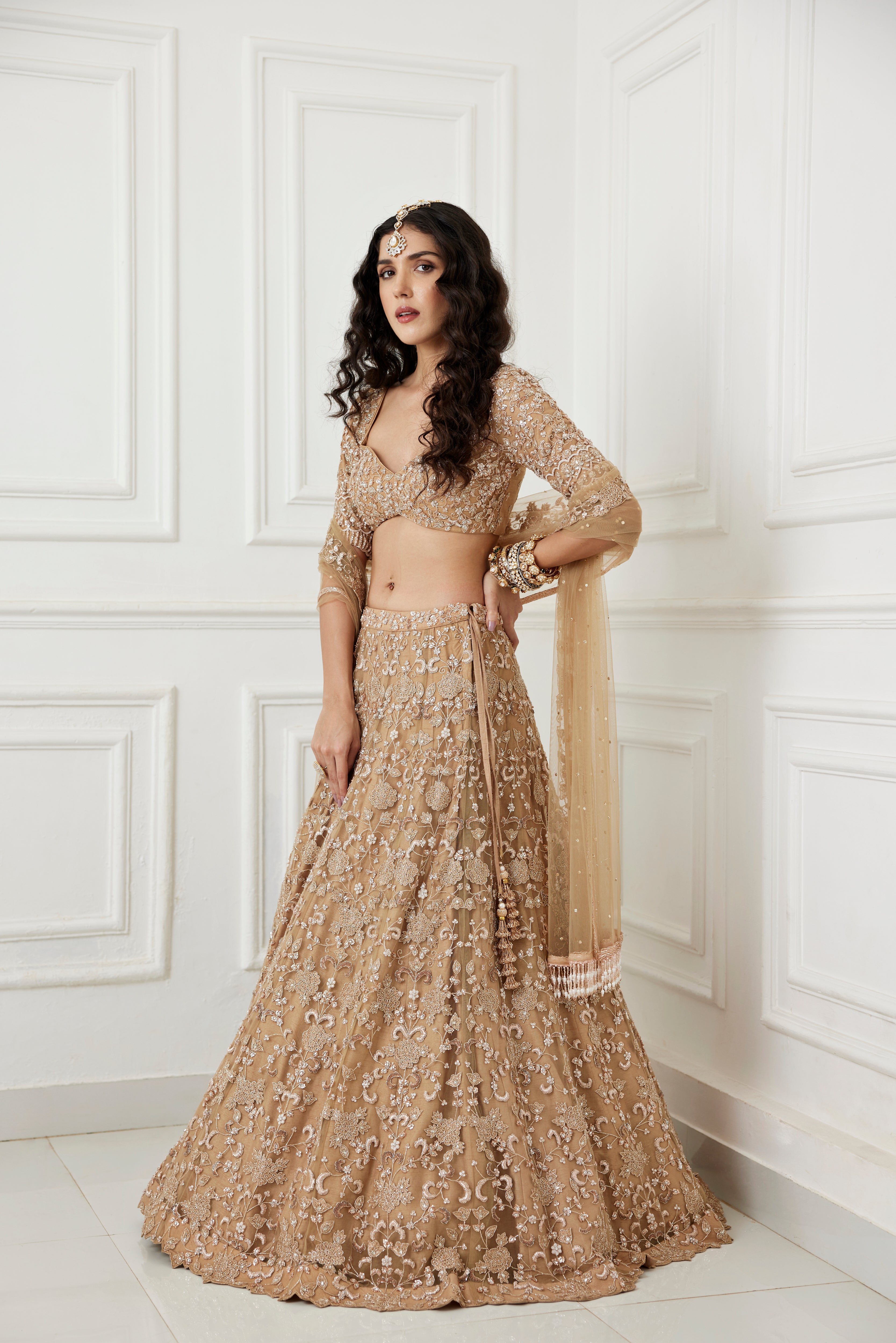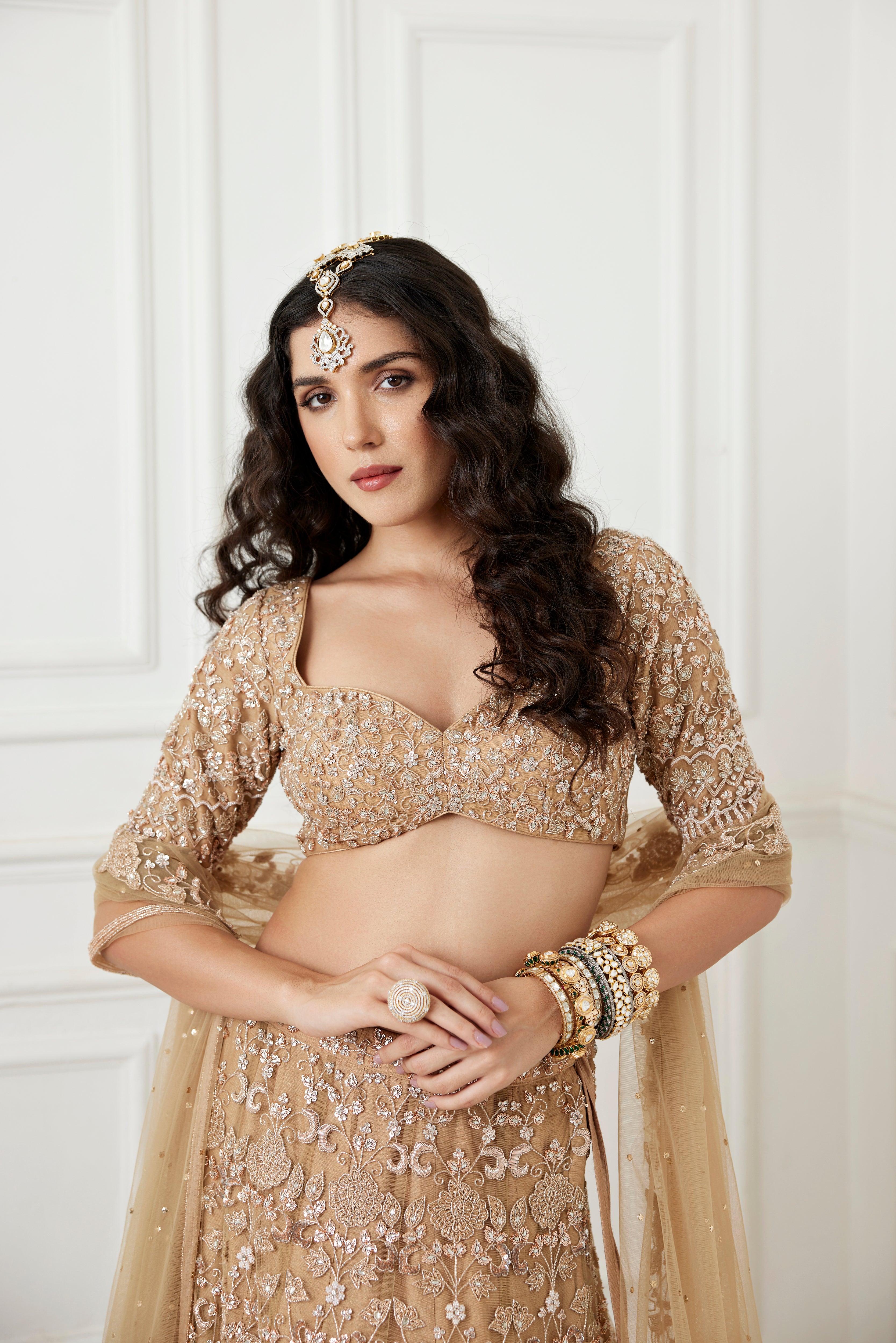 A adeeba gold tulle embroidered lehenga set paired with an elbow sleeve blouse with cutdana, zardozi and sequence work detailing and a matching tulle dupatta having glass beads and pearl tassel edges.