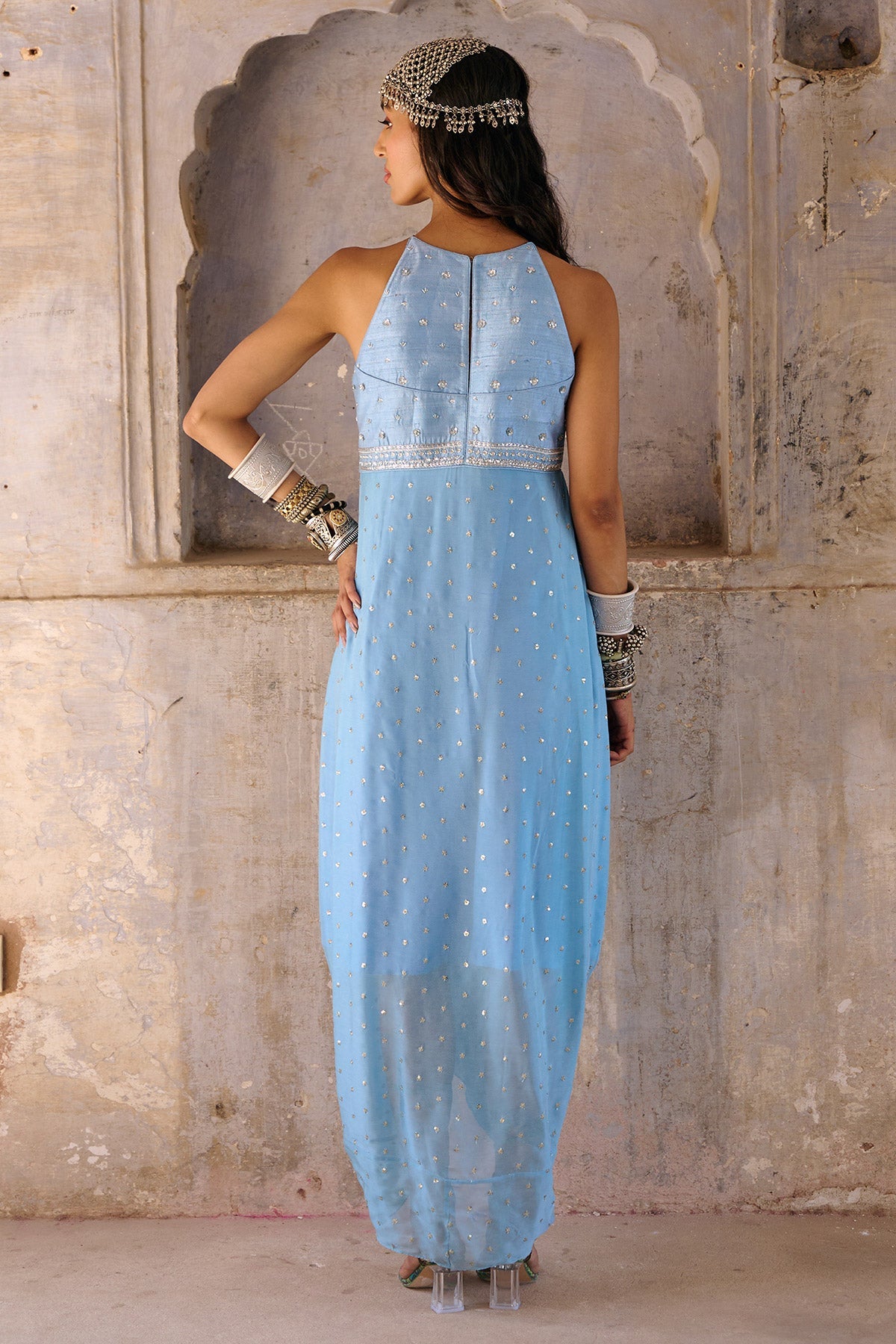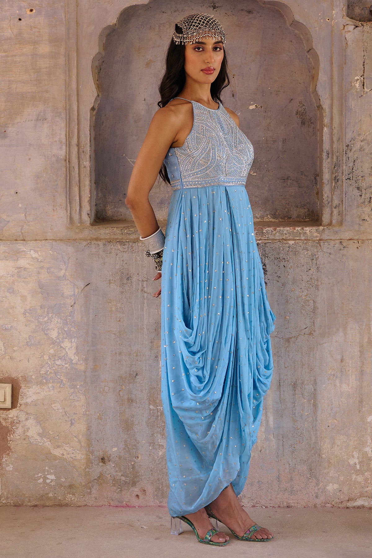 Glass beads and pearl embroidered bodice with georgette cowl.