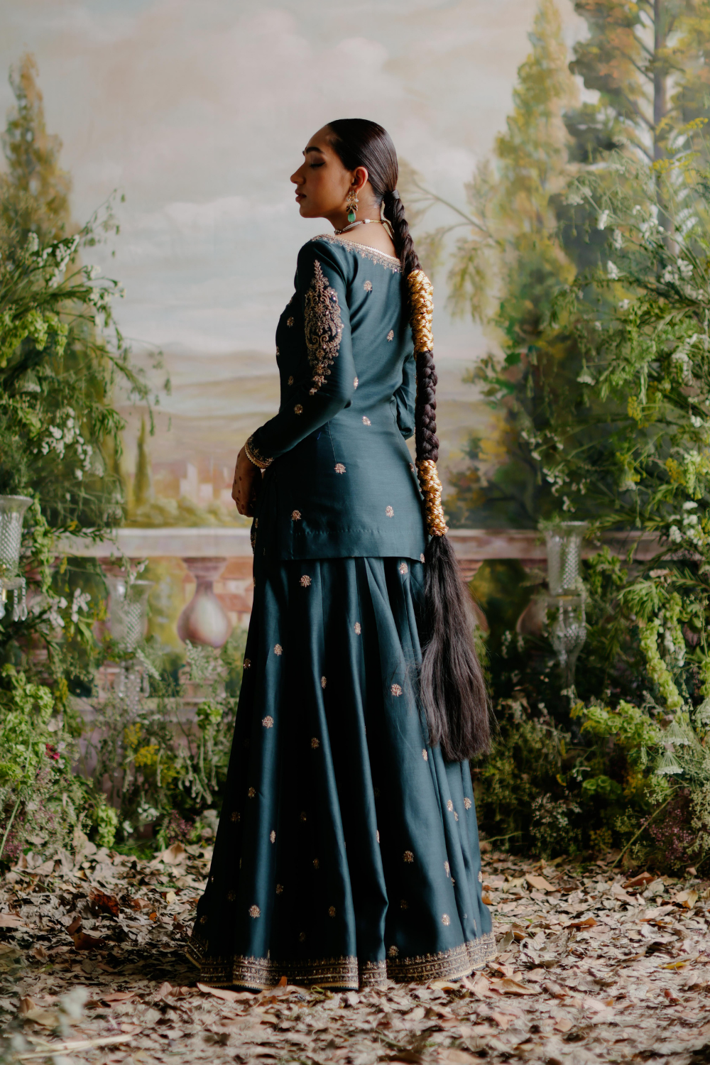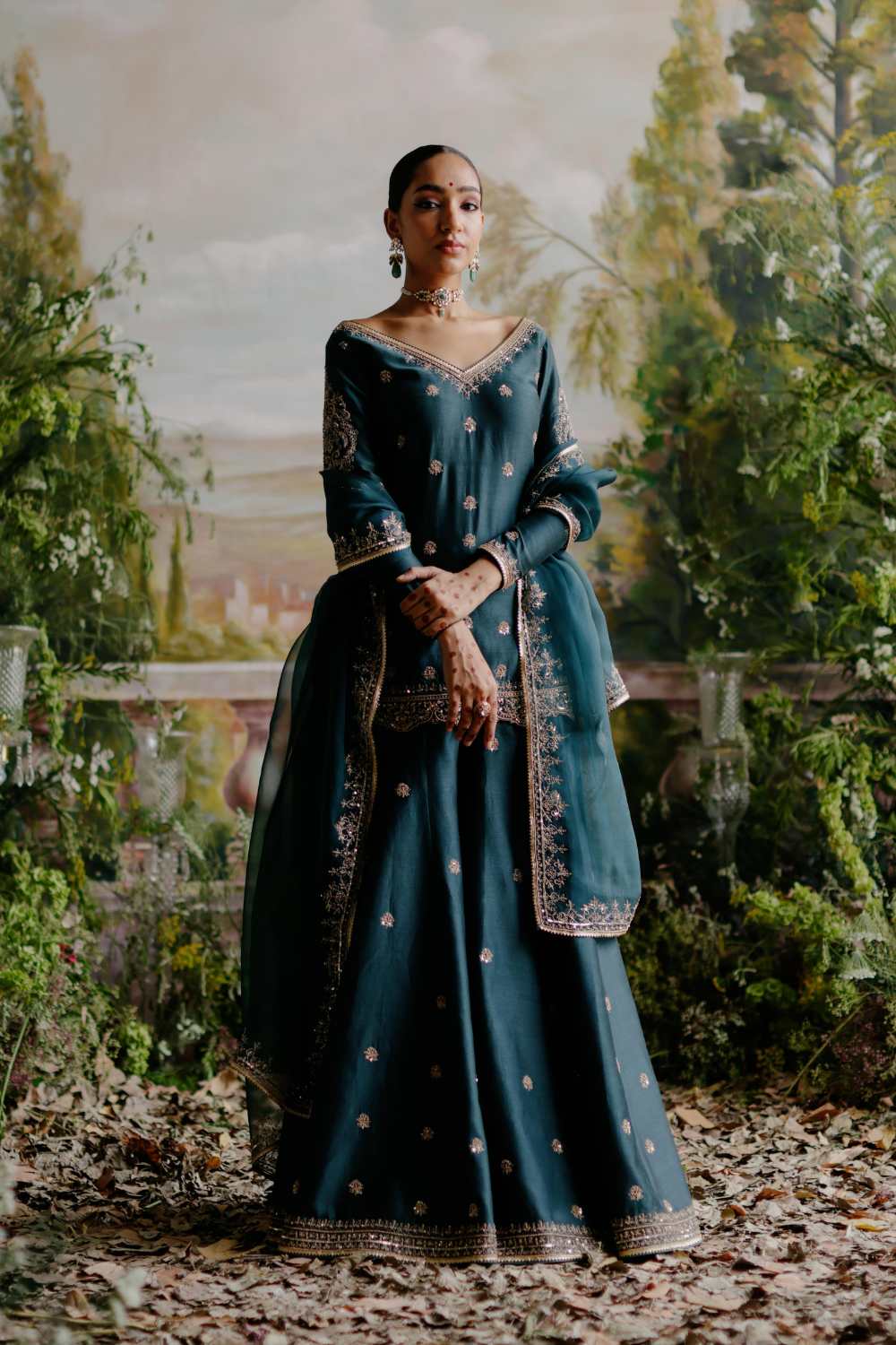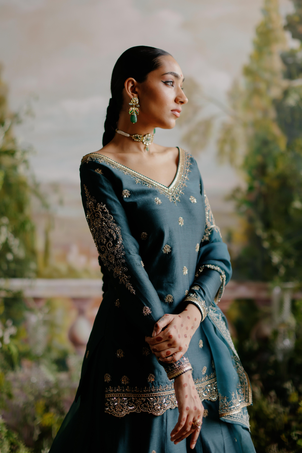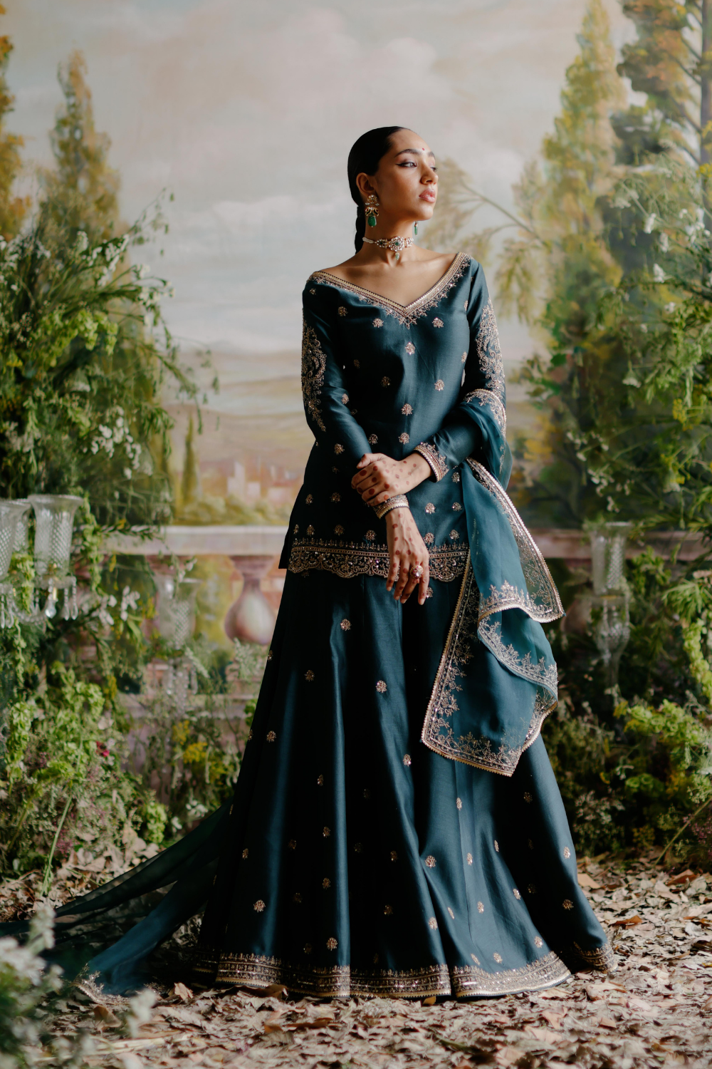 Featuring a dark green Chanderi kurta sharara set paired with an organza base dupatta with antique gold dori and aari embroidery.