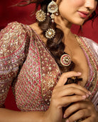 This Kalidar lehenga set in purple silk zari tissue and Jacquard silk Banarasi features Jharokha-inspired panels,elongated paisley embroidery, and intricate embellishments. The ensemble includes a purple tissue embroidered elbow sleeve blouse and dupatta with paisley embroidery and pearl details.
