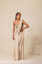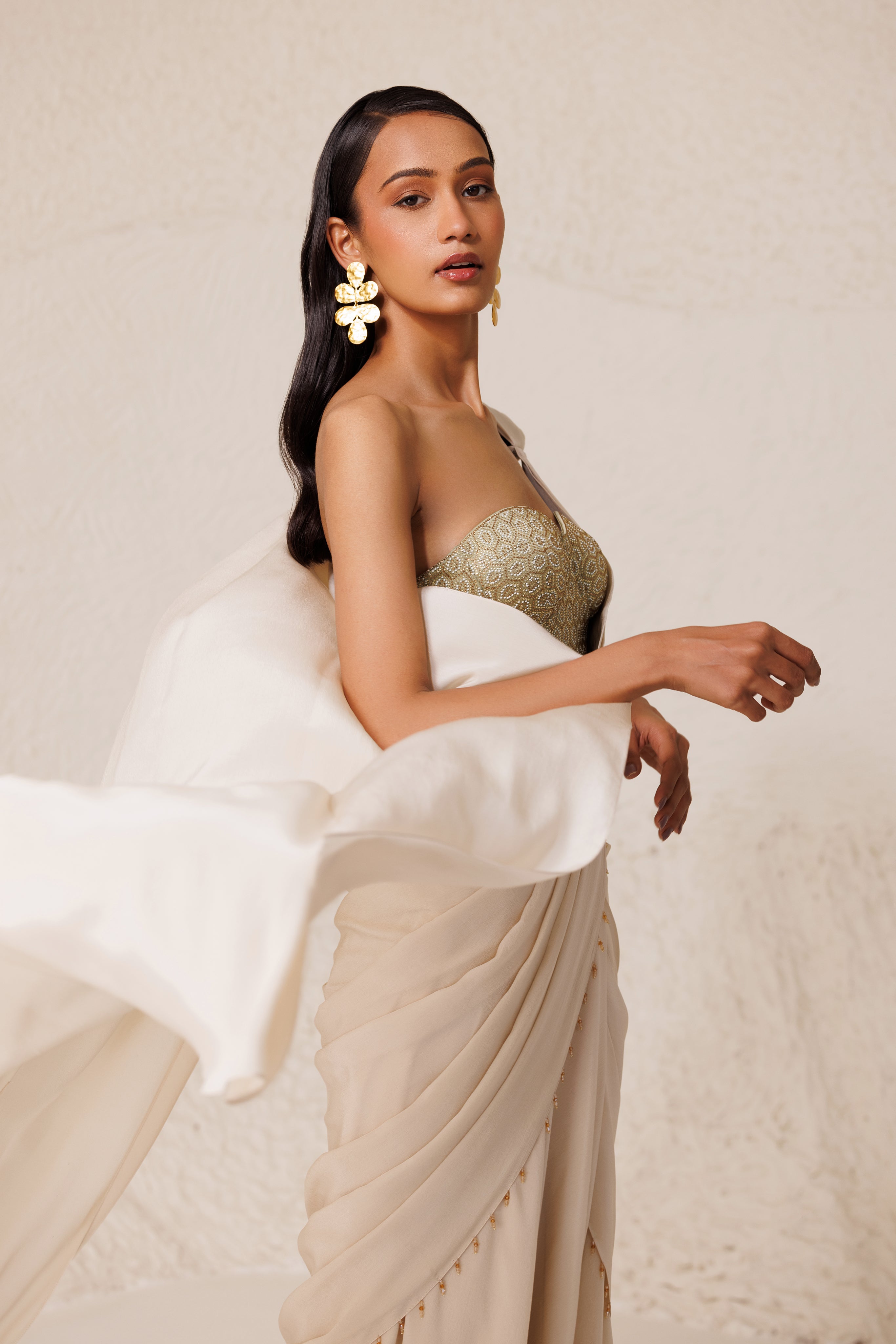 An Ivory godate saree, adorned with crystal embellishments along the edging and paired with a rhinestone bustier, creating an elegant and chic look.