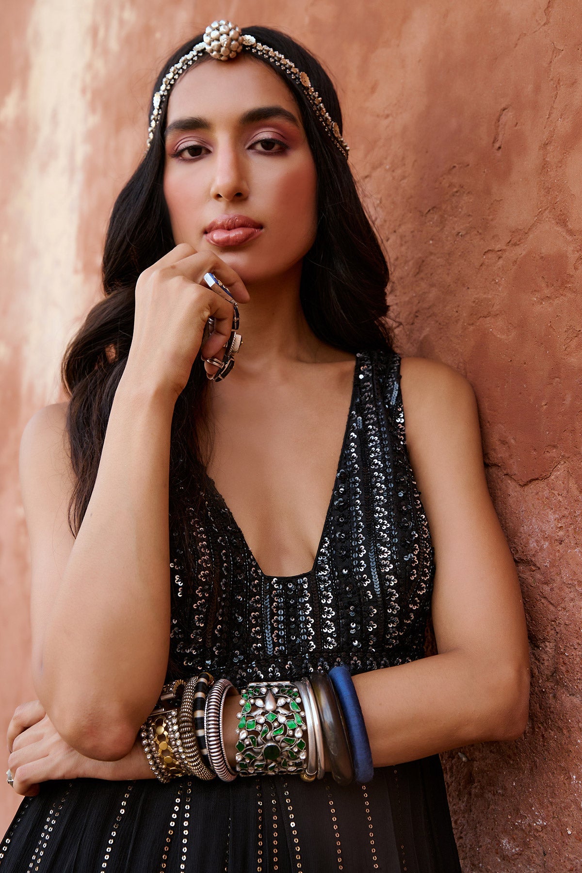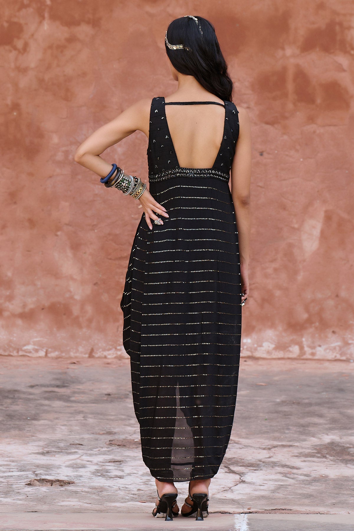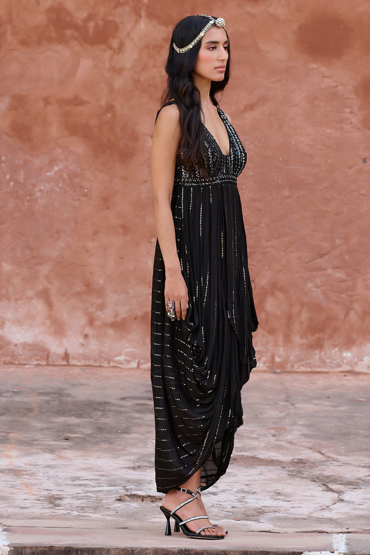 Sequin and glass beads embroidered bodice with georgette cowl.
