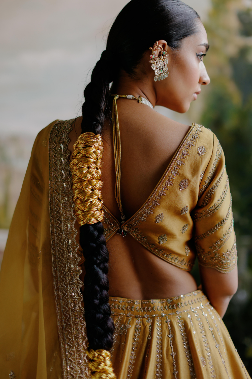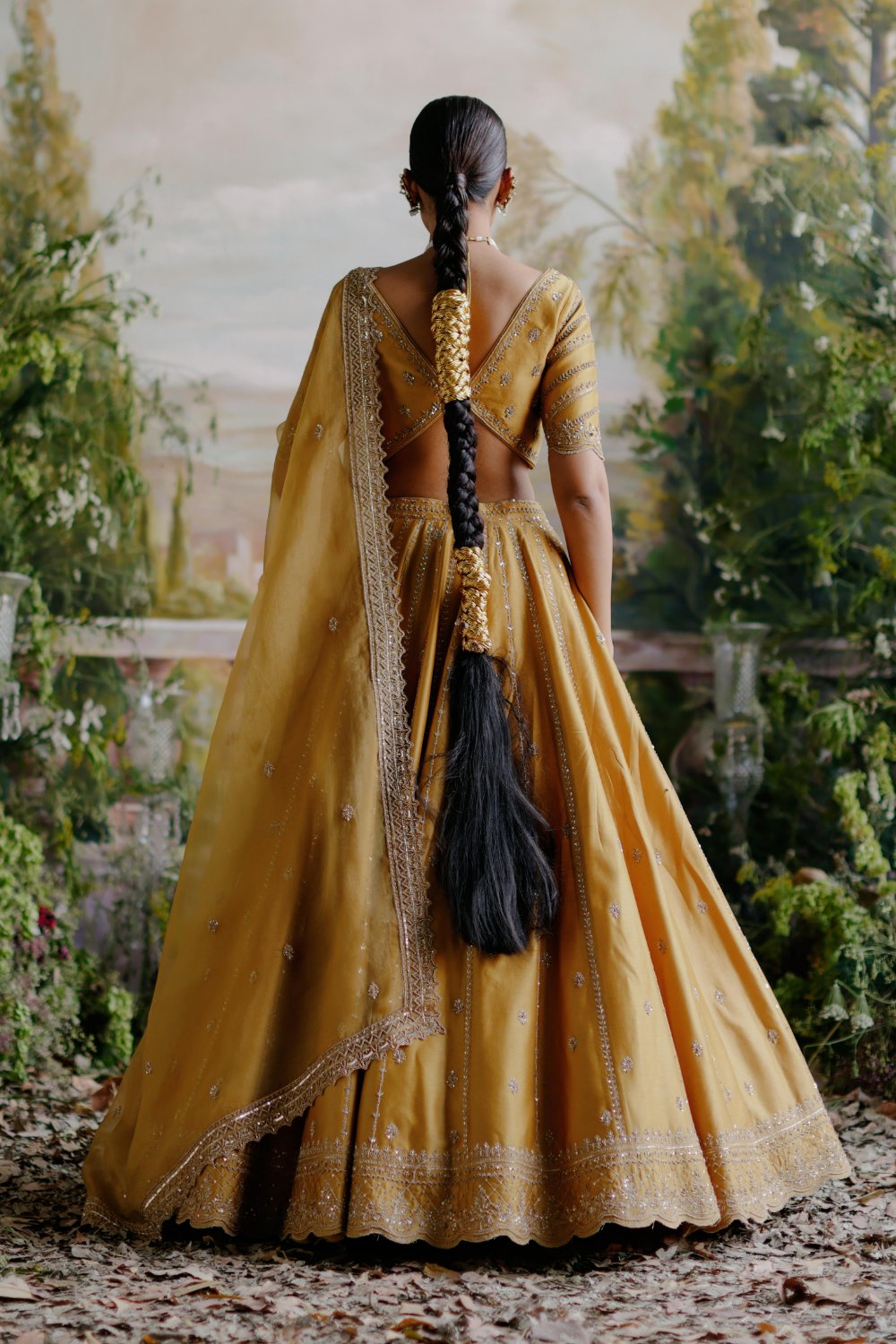 Featuring a Tuscany mustard chanderi lehenga set paired with an organza base dupatta with antique gold dori and embellished hand embroidery.