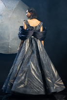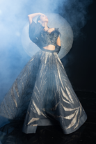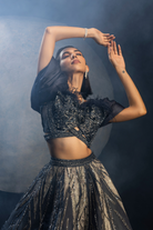 Glazed Midnight Blue top, having feather details, paired with skirt having radiant, rhythmic embroidery.