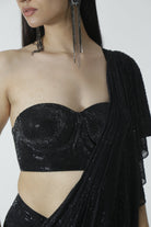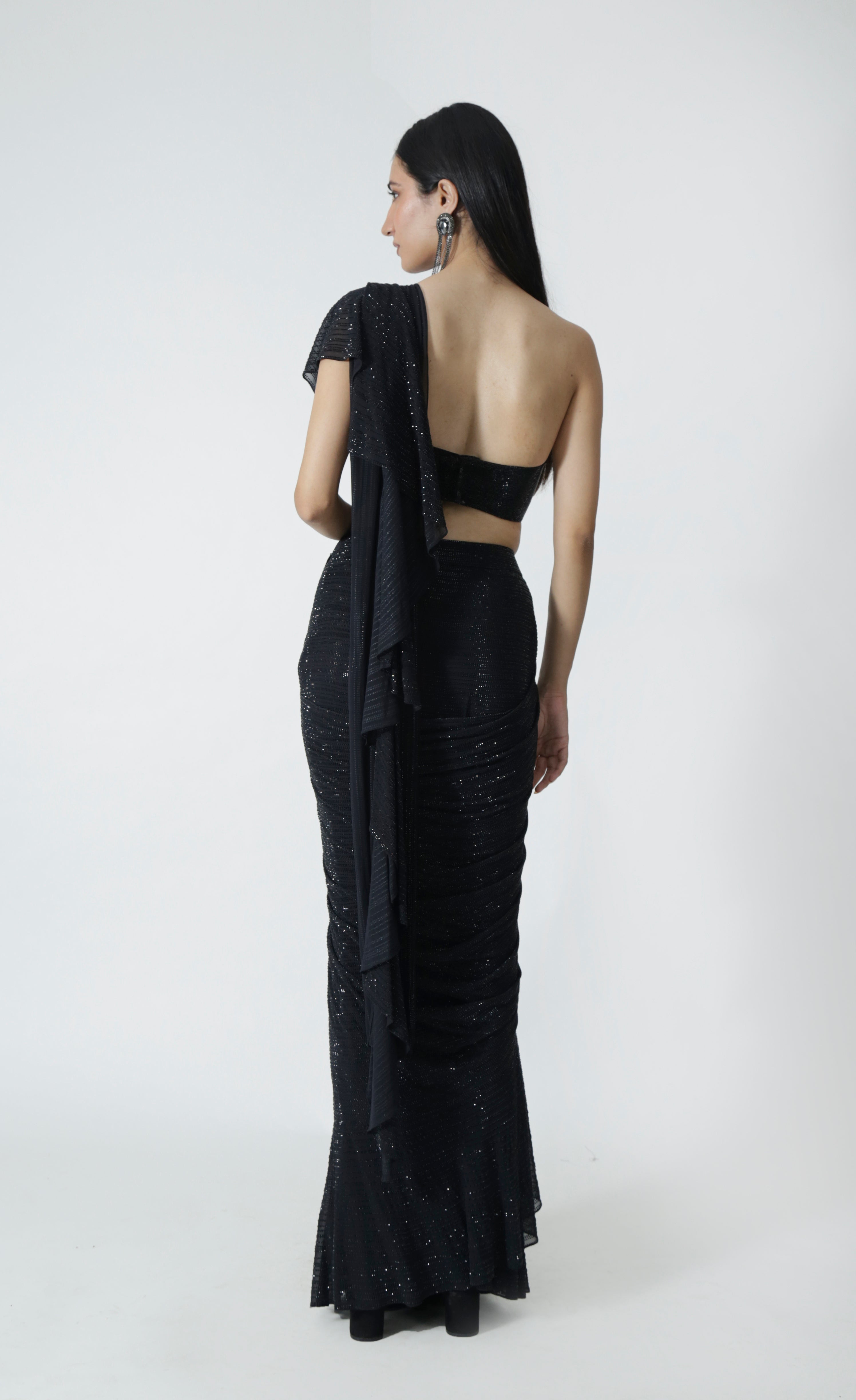 A Black silk georgette pre-draped saree, encrusted with shimmering rhinestones, paired with rhinestone embellished bustier.