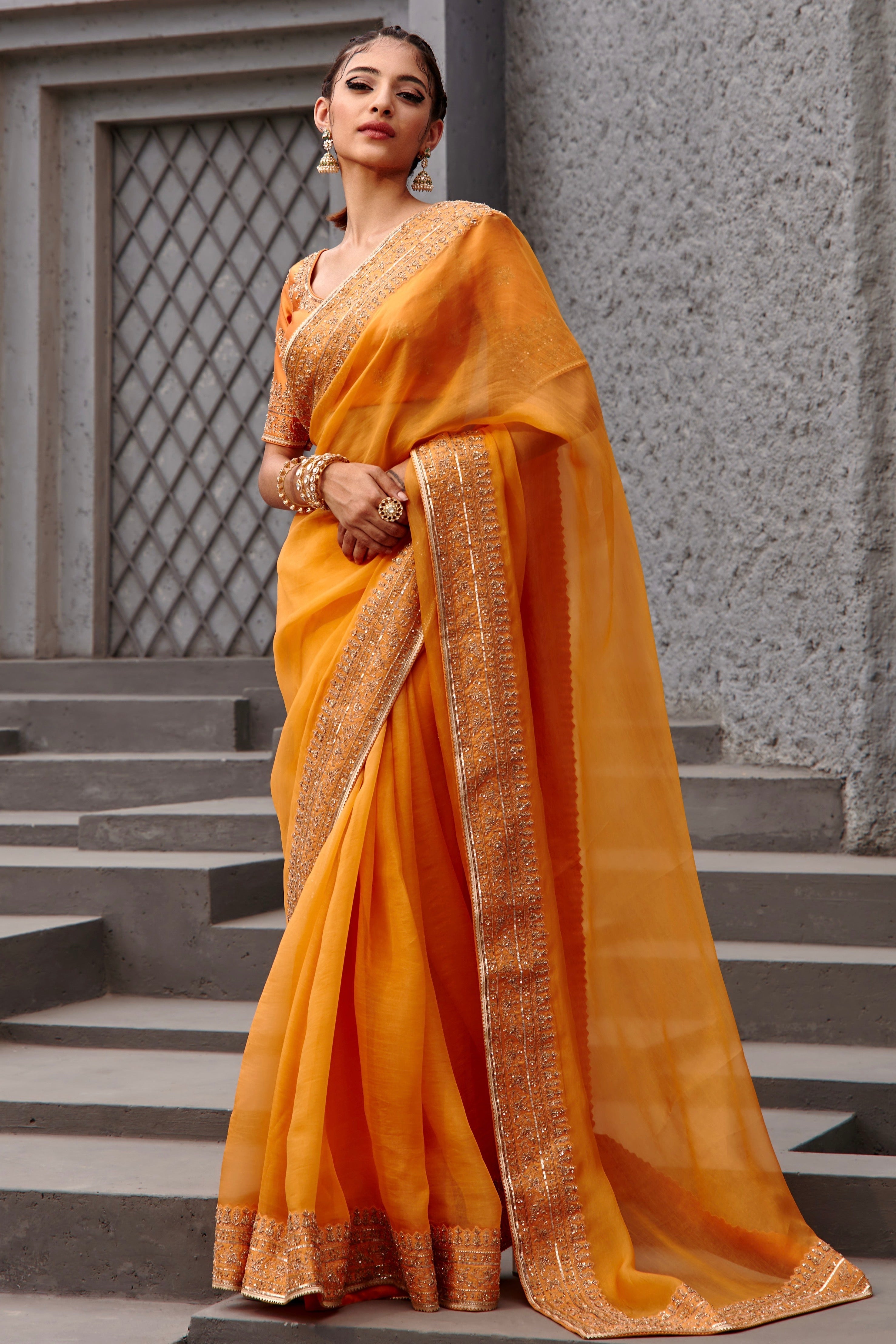 Featuring a tangerine orange organza saree paired with a chiniya silk blouse with gold dori and aari embroidery