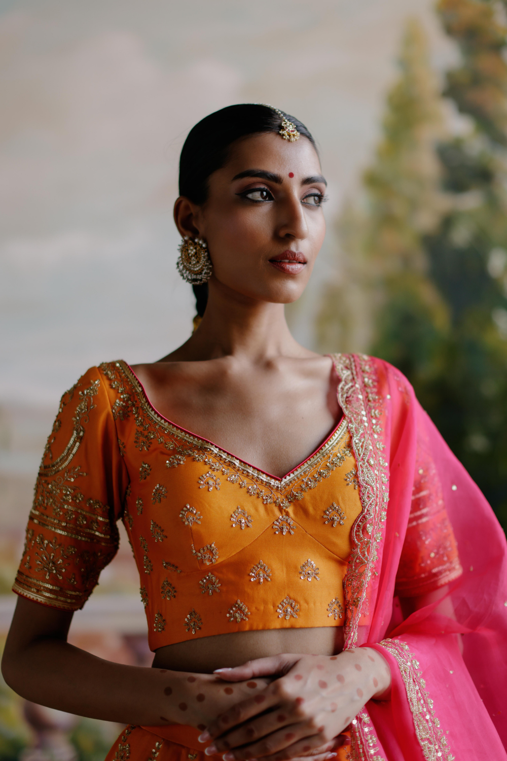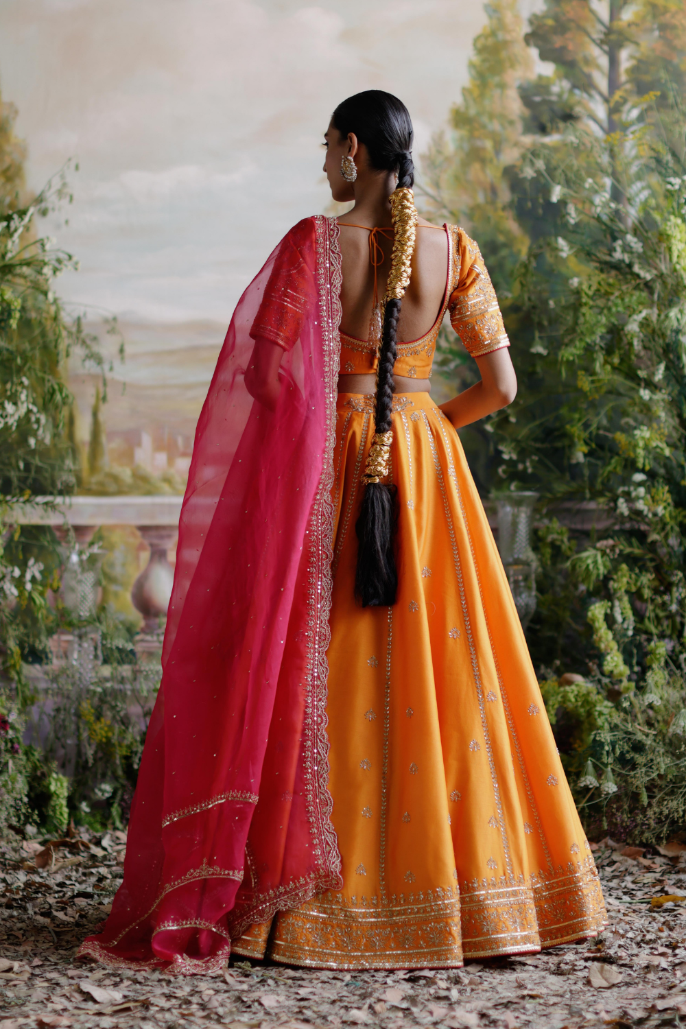 Featuring an orange chanderi lehenga set paired with an organza base dupatta with antique gold dori and embellished hand embroidery.