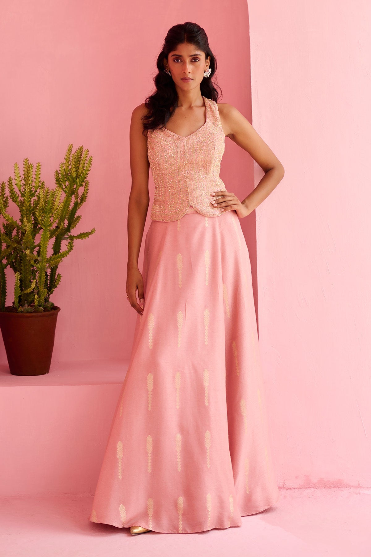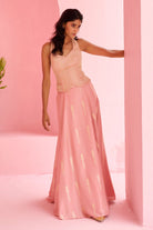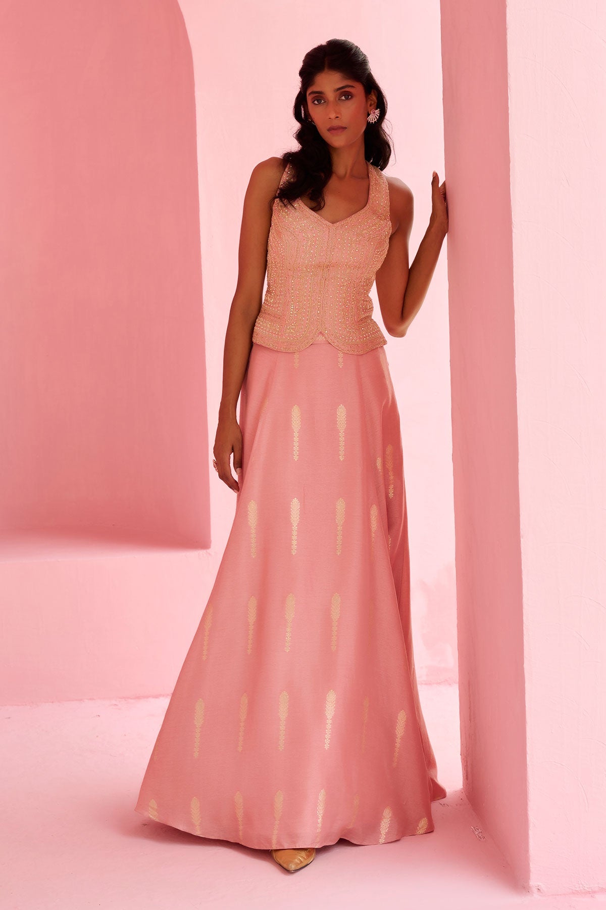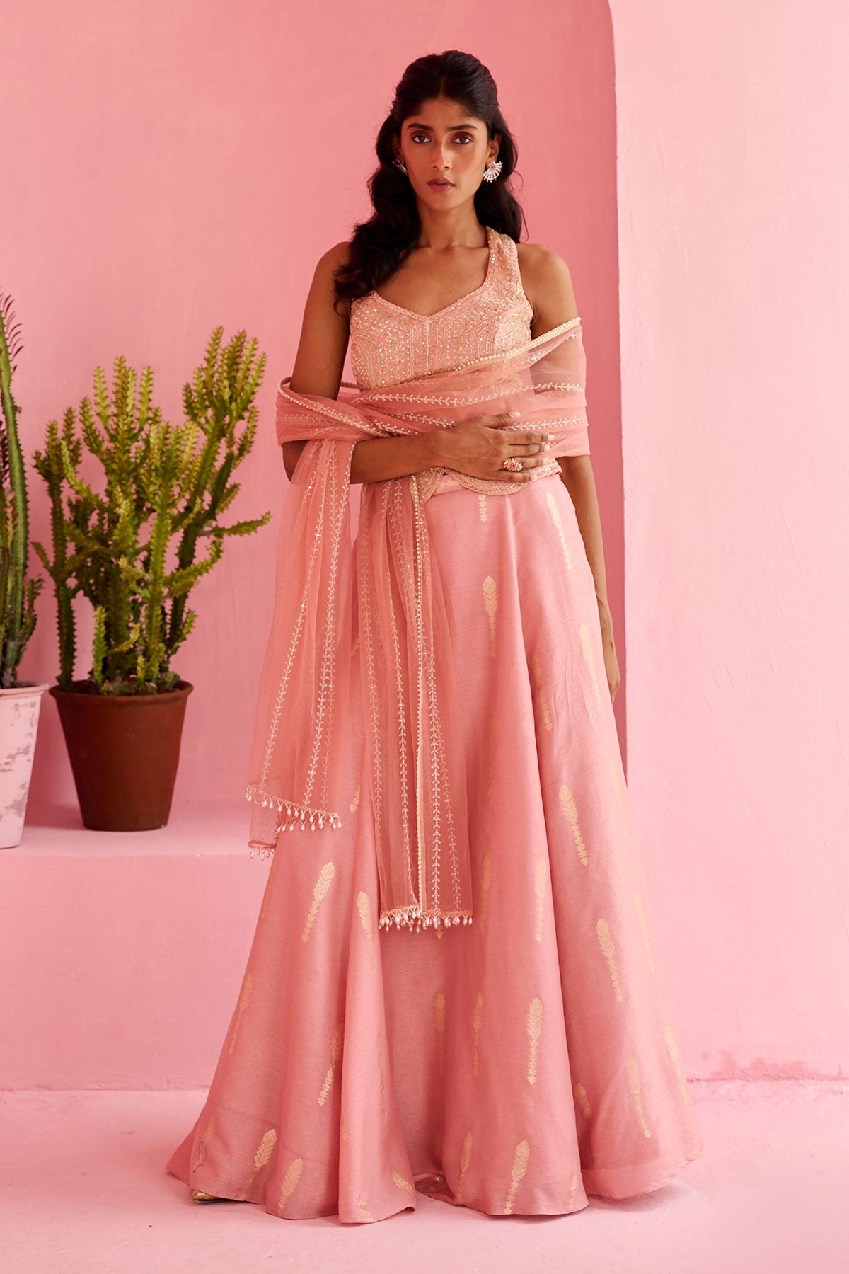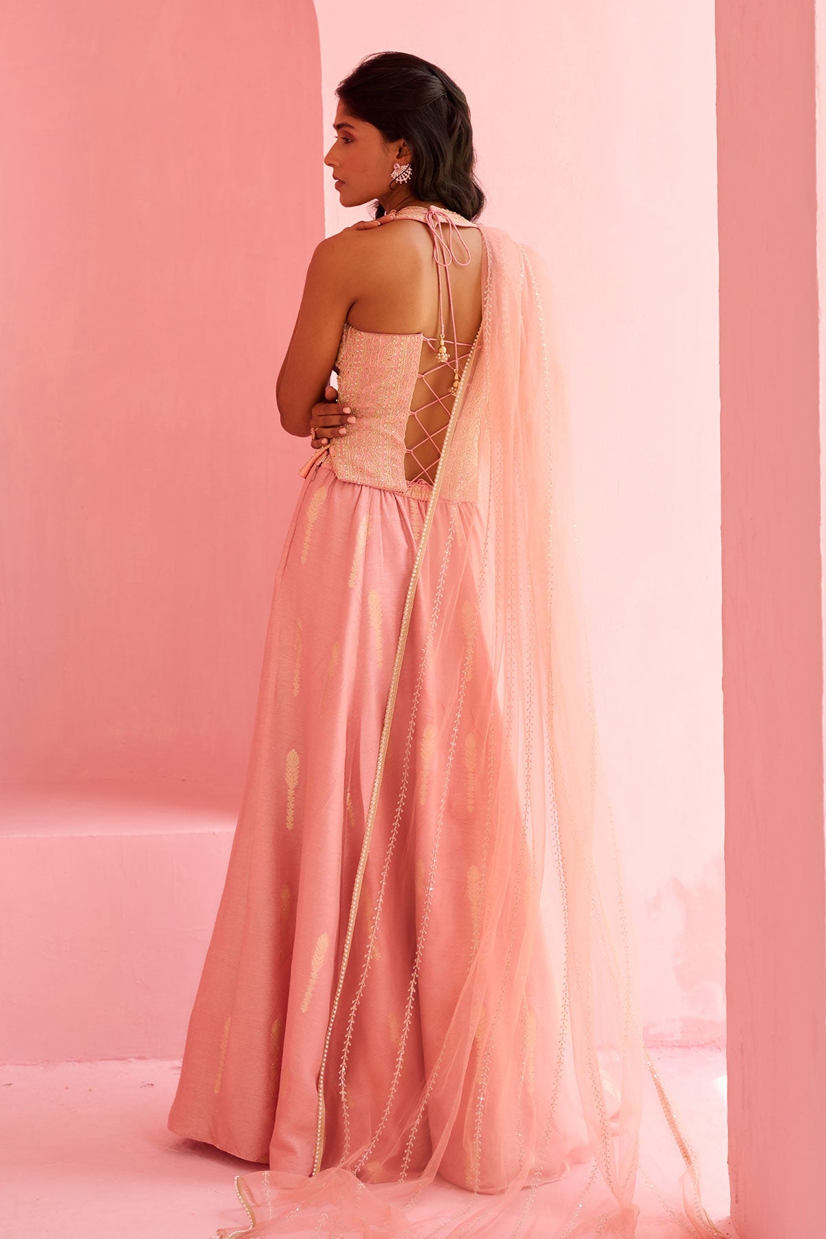 Jamewar Lehenga with woven buttis paired with zari, sequence and zardozi embroidered halter neck blouse and embellished tulle dupatta.
