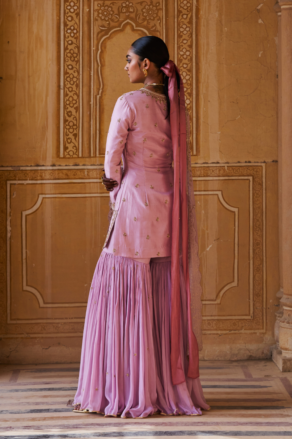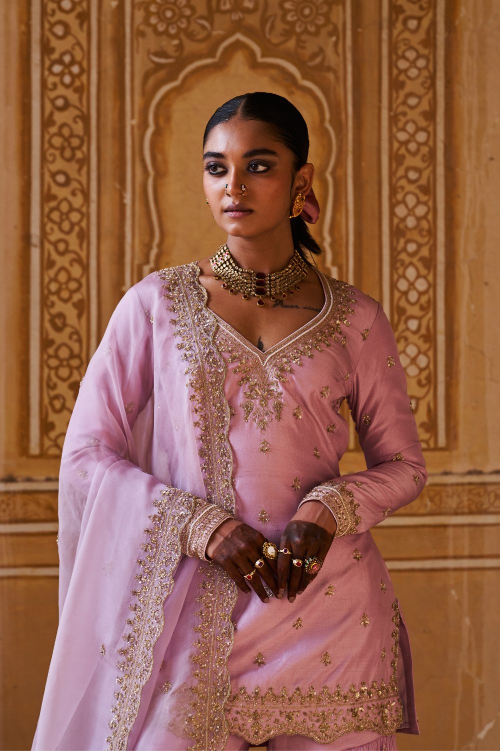 Featuring a lavender dupion silk kurta & chinon gharara set paired with an organza base dupatta with embellished hand embroidery.