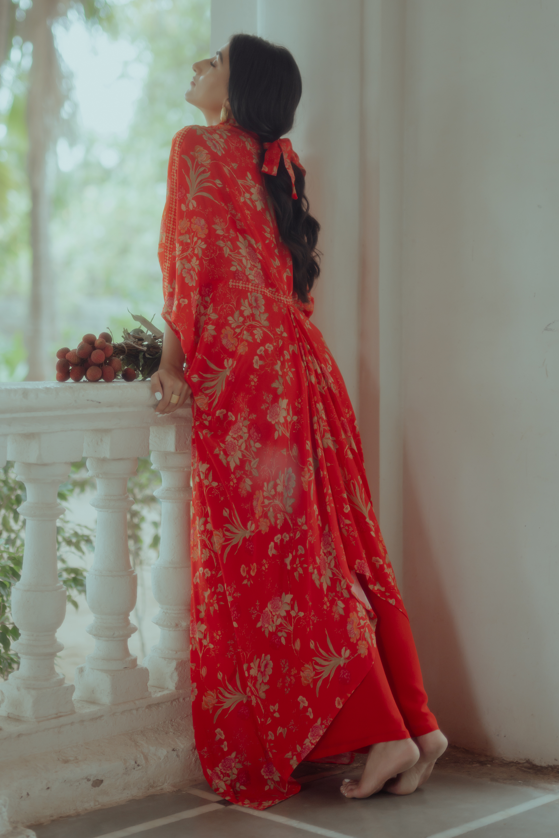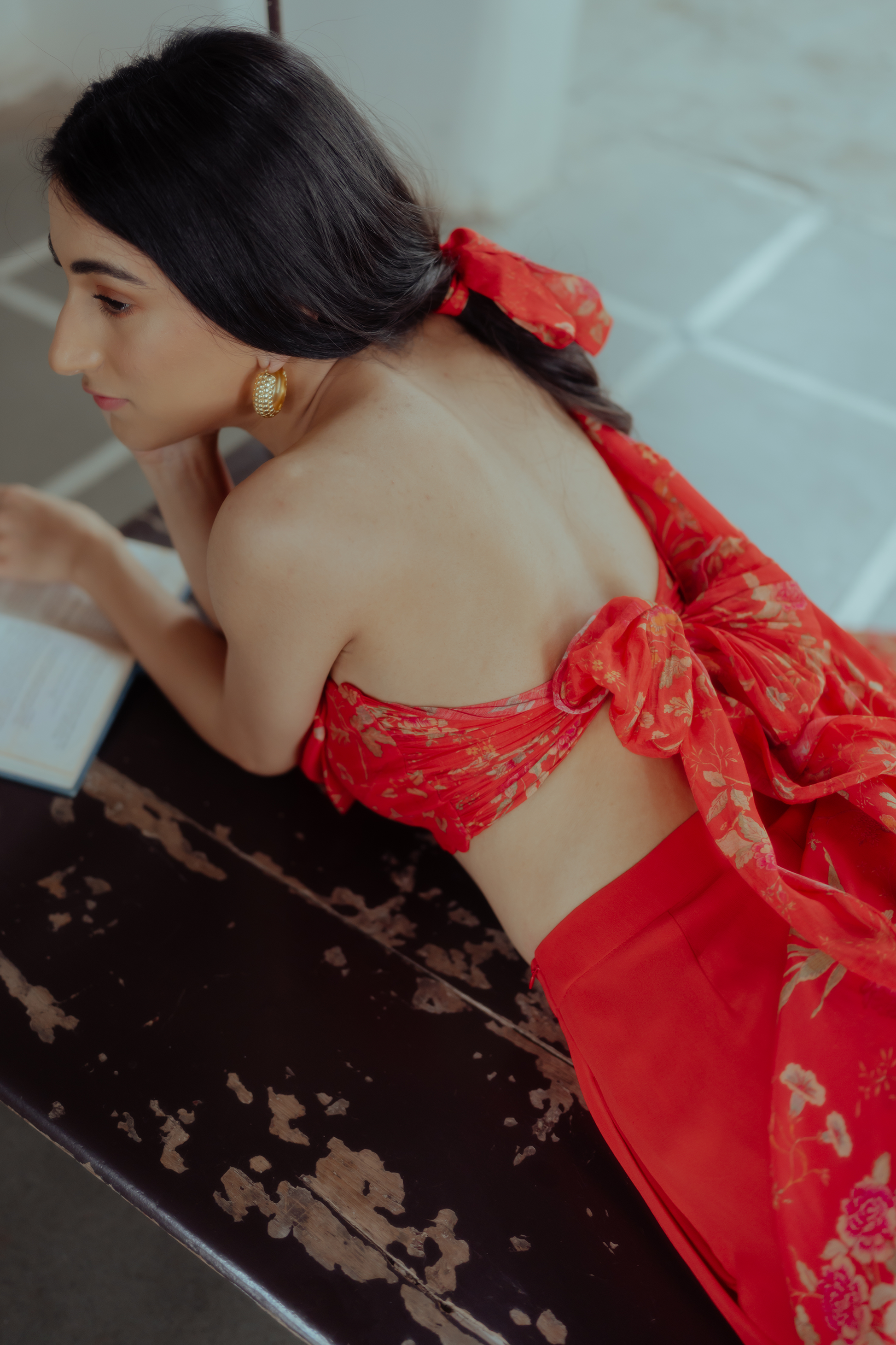A poppy red rose print set of a bandeau, jacket and palazzo, that is super versatile and can be styled in multiple ways.