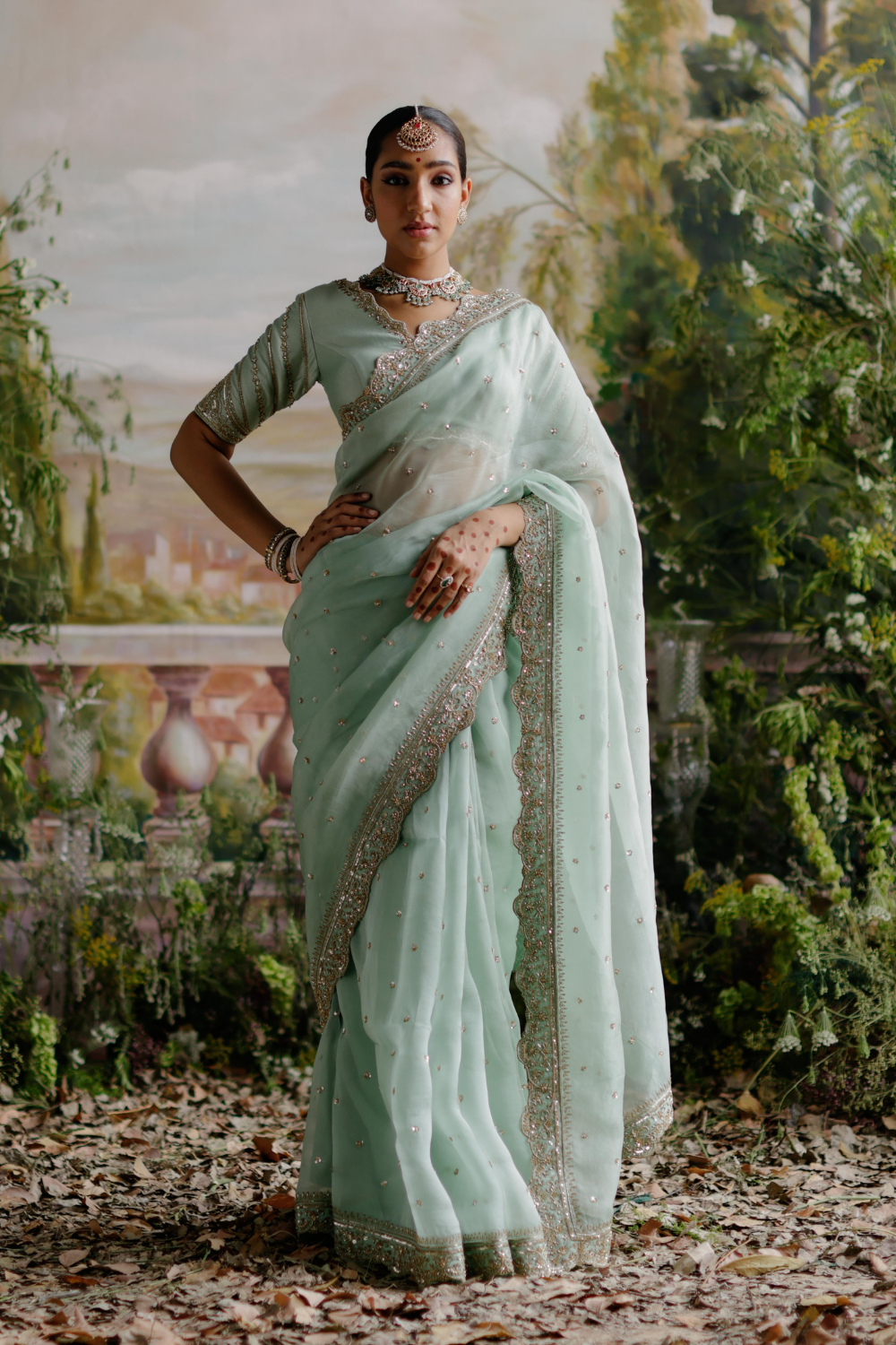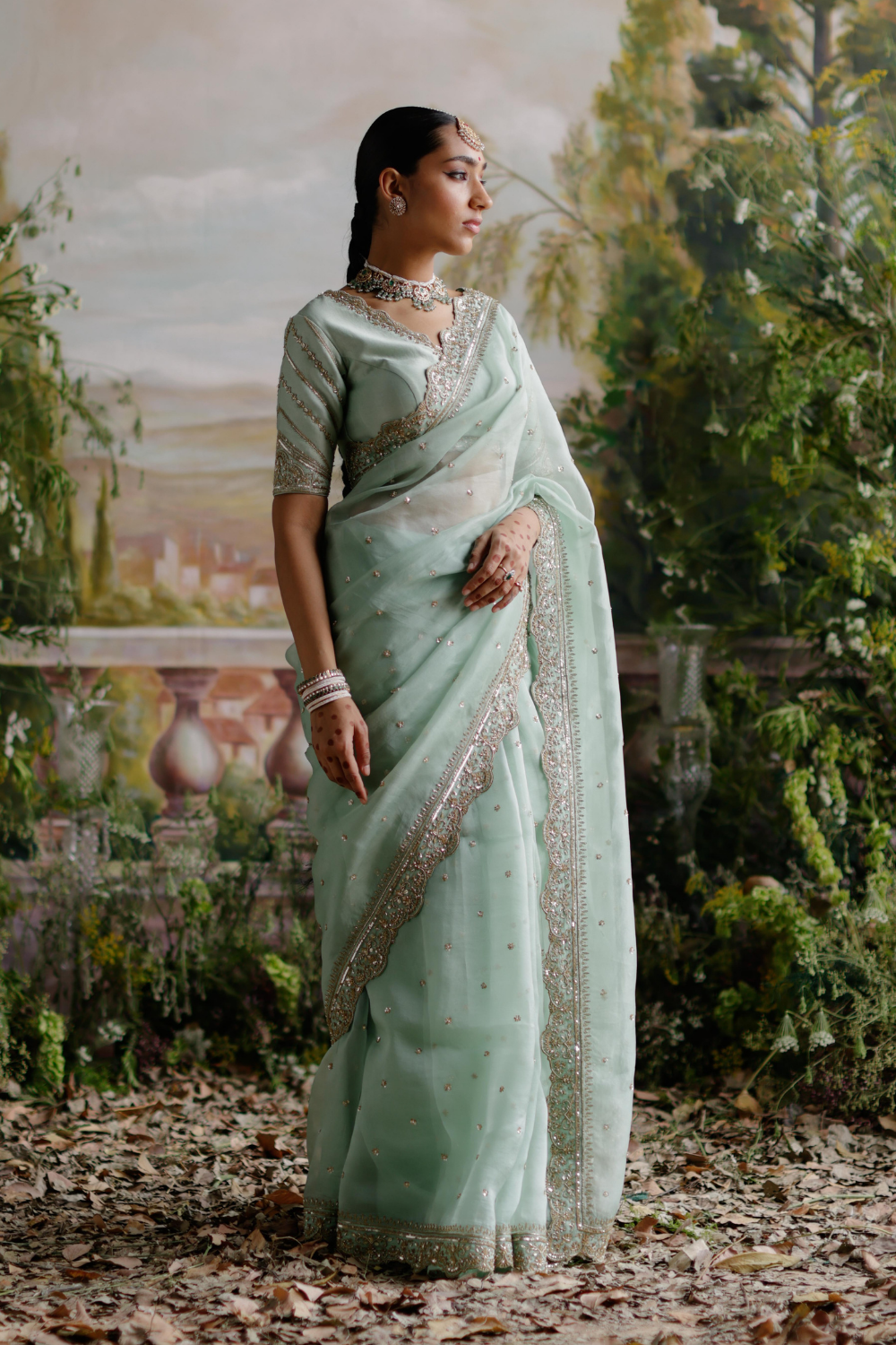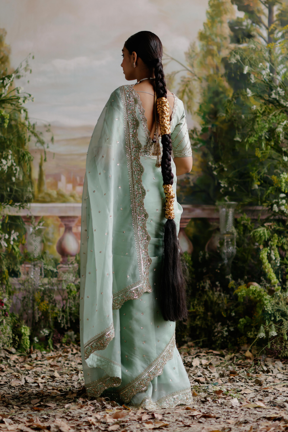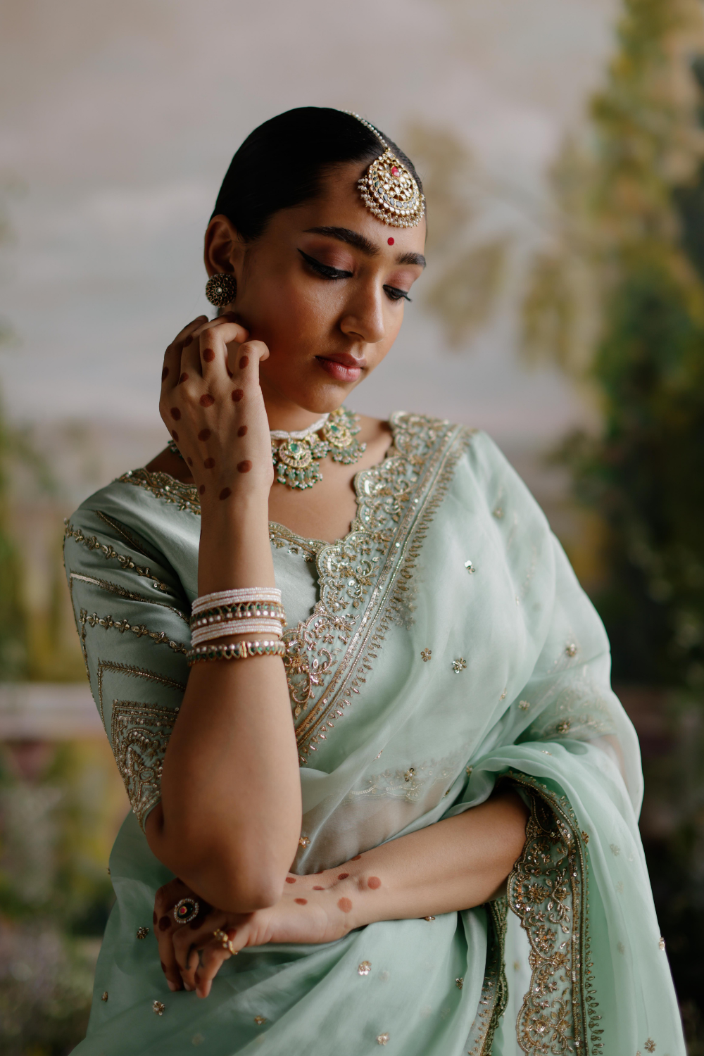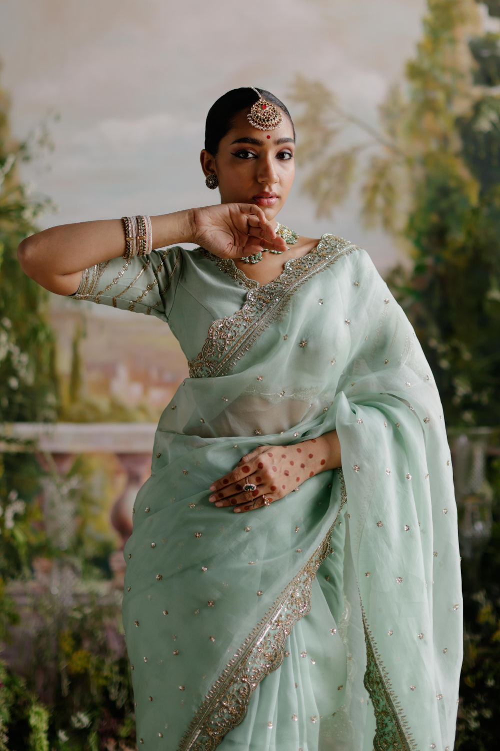 Featuring a sage green organza saree paired with a chanderi silk blouse with antique gold dori, aari and embellished hand work.
