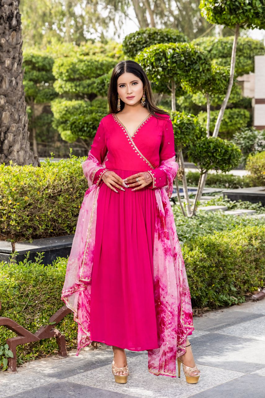 Angana -Rani pink angrakha suit with tie and dye dupatta