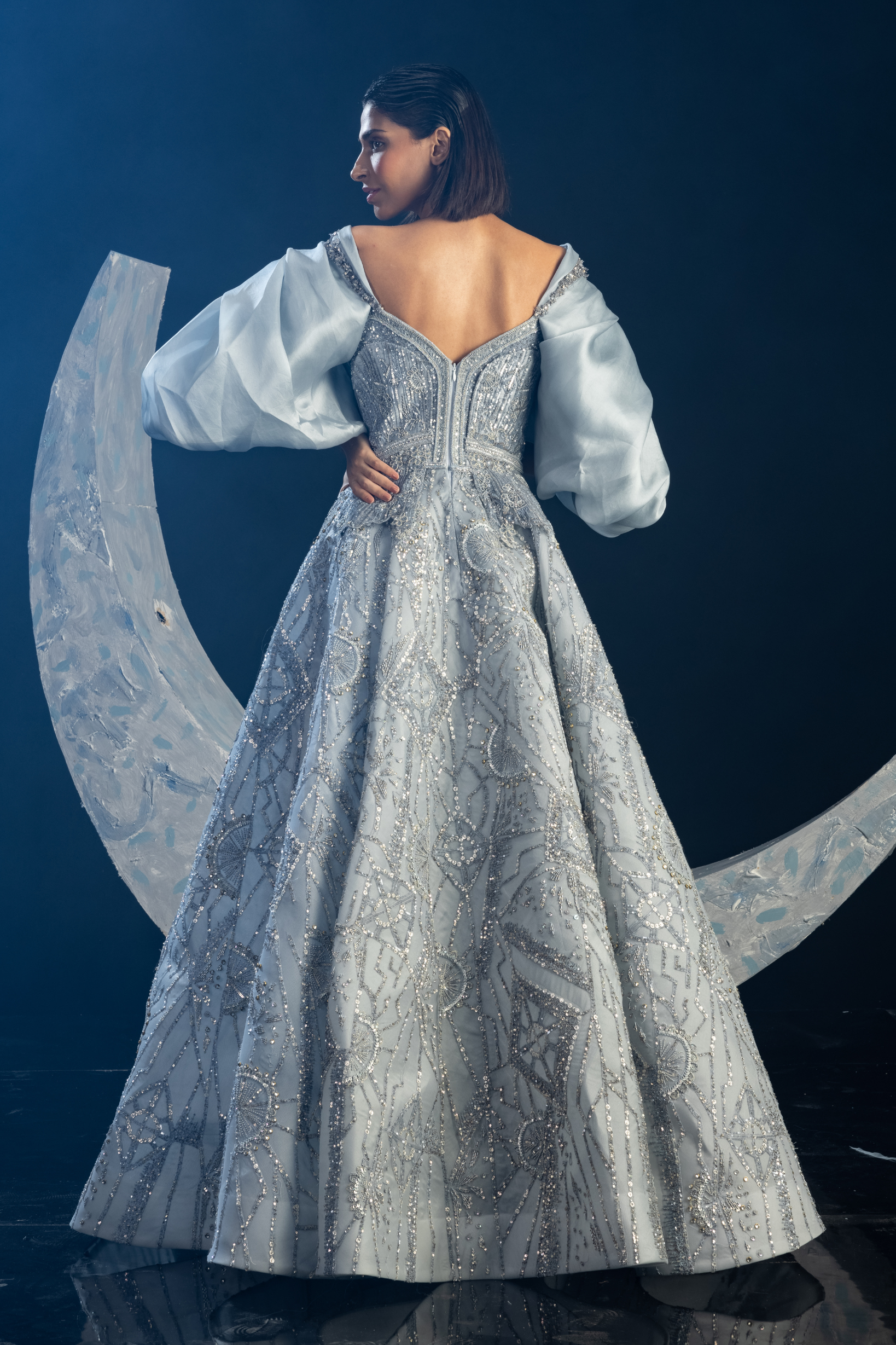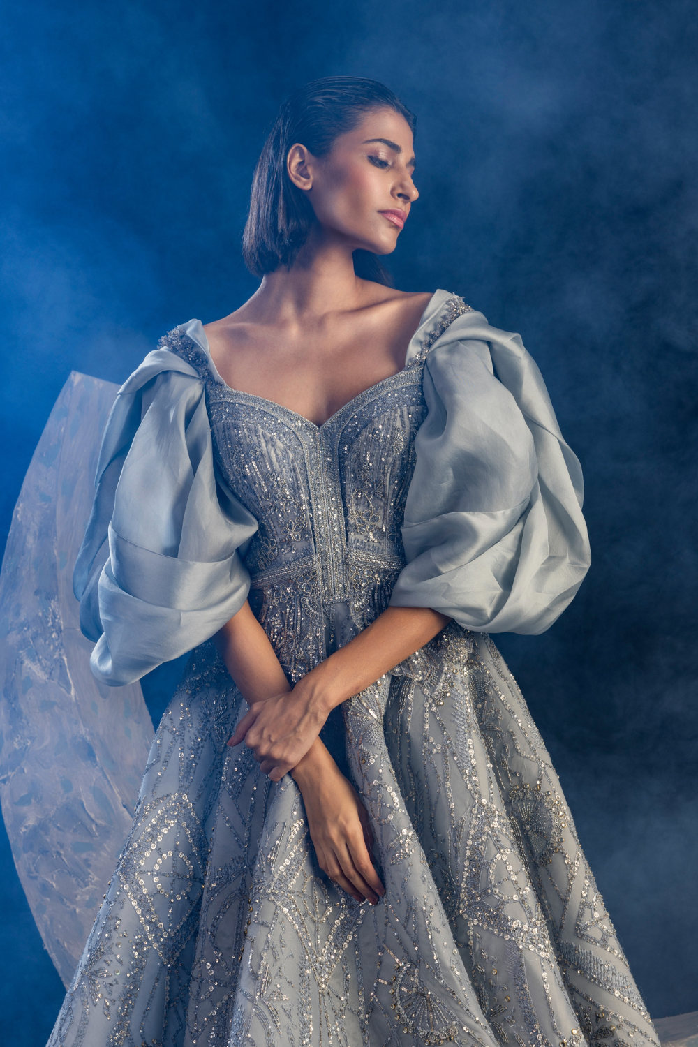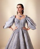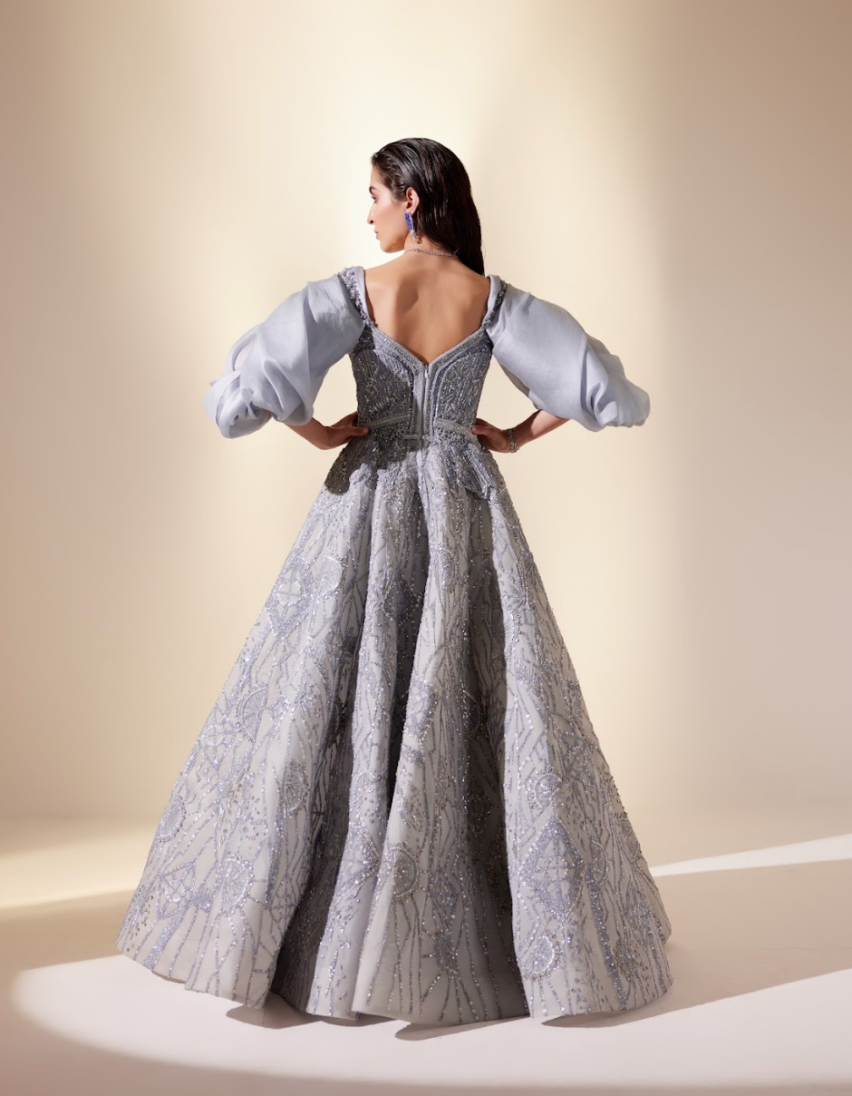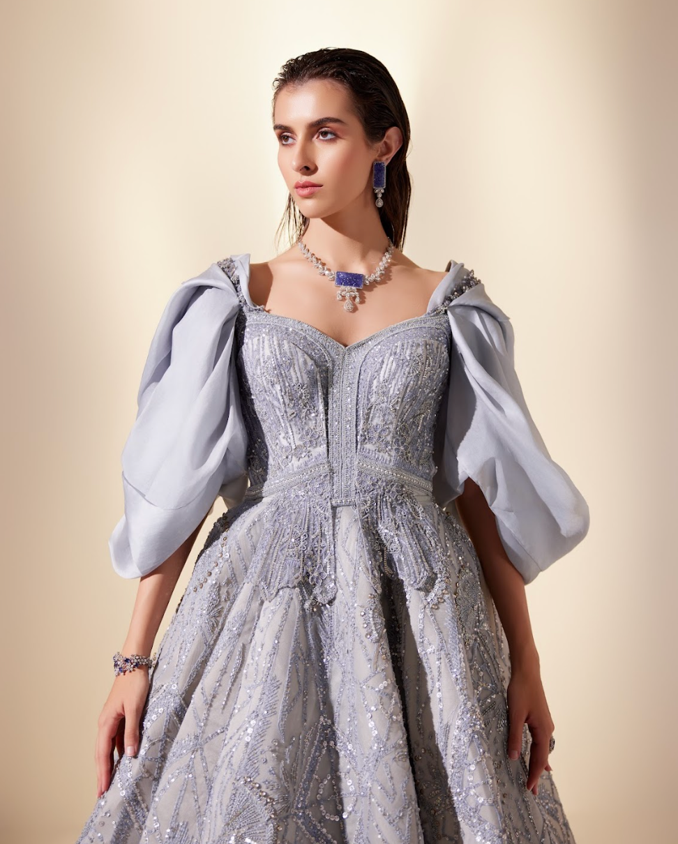 Powder blue gown adorned with gleaming geometric embroidery, having delicately wrapped puffed sleeves.