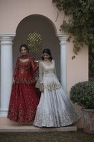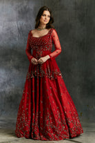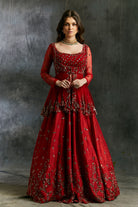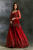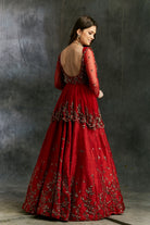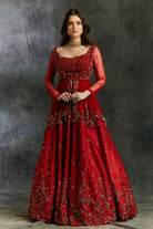 Featuring a Red With Antique Gold Sequence Raw Silk With Peplum Work Blouse Lehenga Set in Raw Silk.