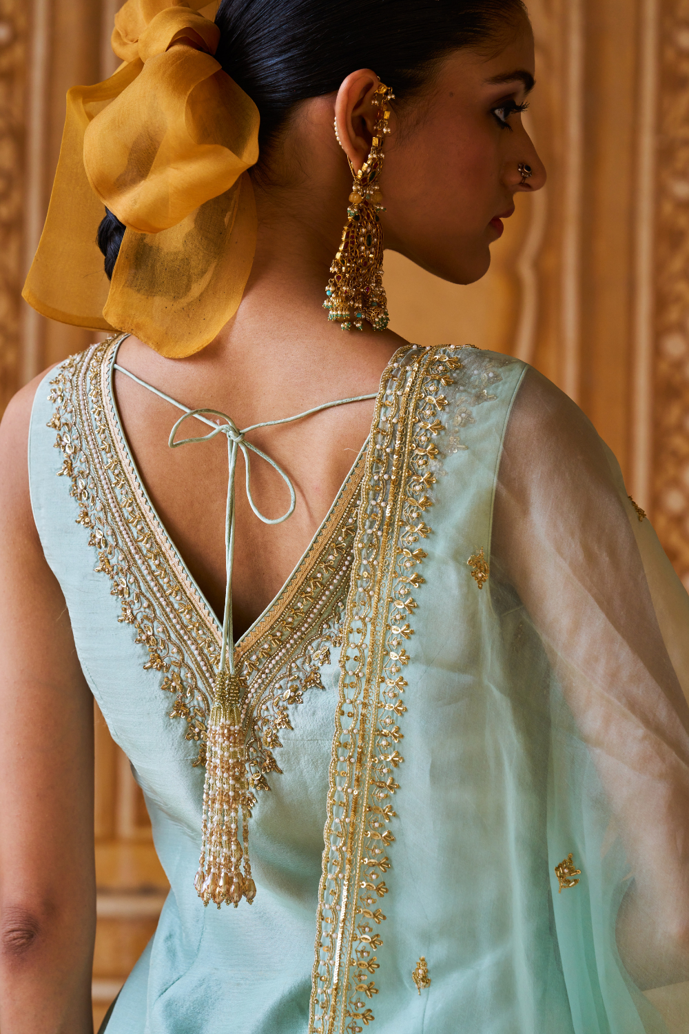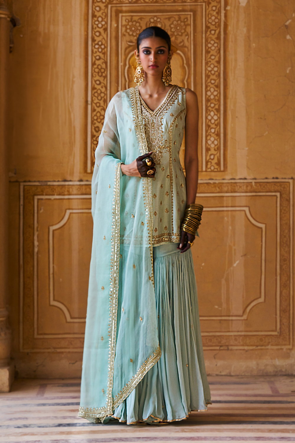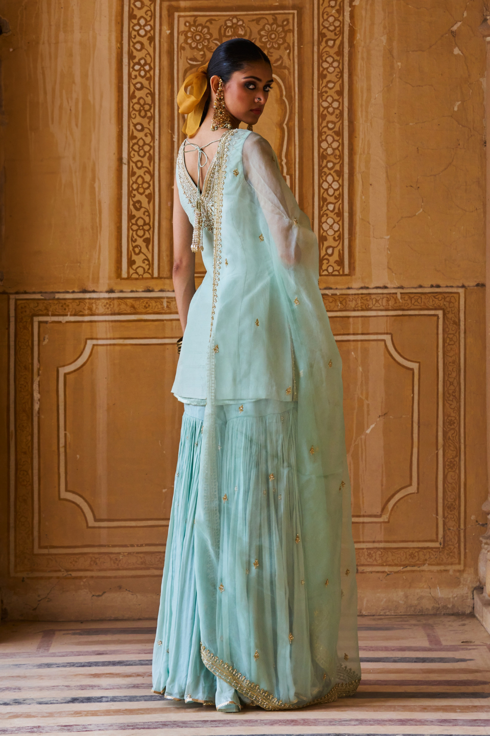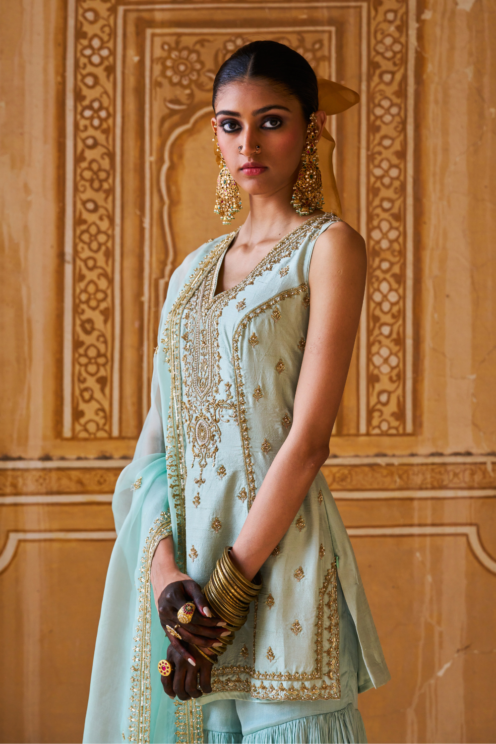 Featuring a light blue chanderi kurta & chinon gharara set paired with an organza base dupatta with embellished hand embroidery.