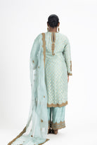Aqua Banarasi Georgette Shirt, Raw Silk Palazzo, With An Organza Odhini Embroidered In Antique Dori, Dabka, And Sequins.