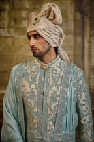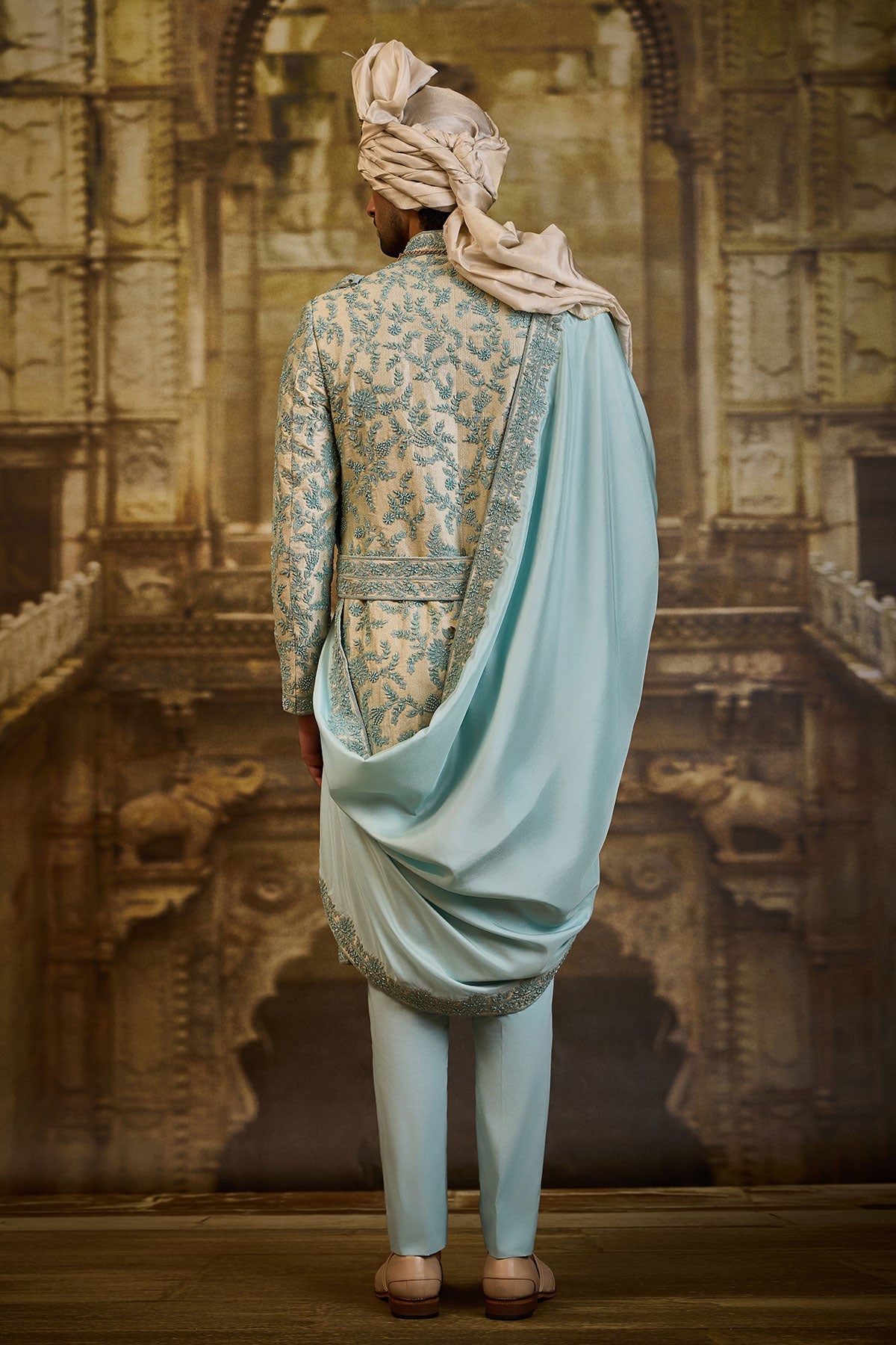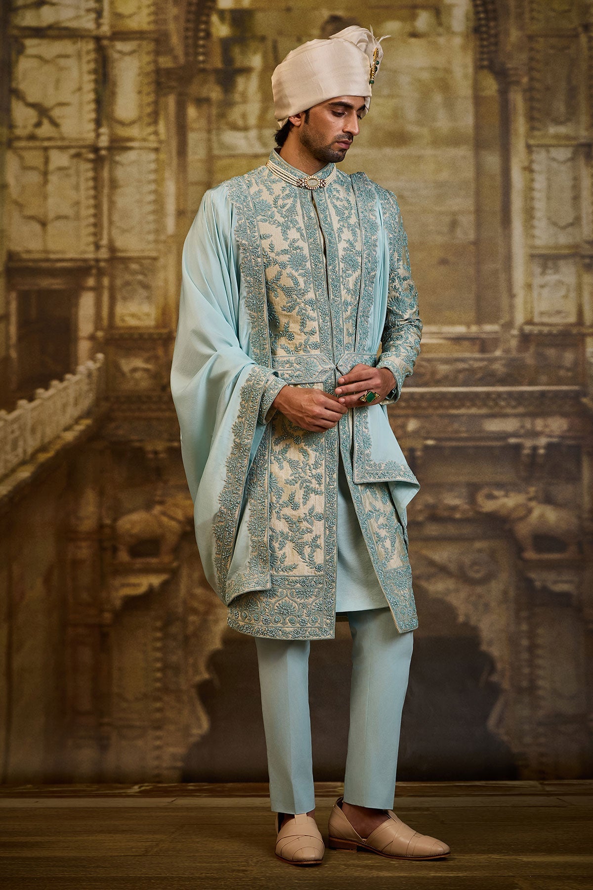 Tissue Brocade Sherwani Embroidered In Sea Blue Dori Highlighted With Tonal Dabka, Beadwork And Crystals. It Comes A Cotton Silk Kurta And Lycra Trousers. It Is Accesorised With A Worked Stole , Belt And Leather Jutis Which Are Optional And Can Be Ordered Separately
