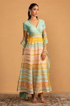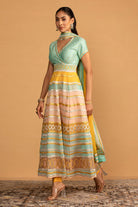 Consist of multi coloured organza and georgette base anarkali with gota patch work. it is paired with chudidar and net dupatta.