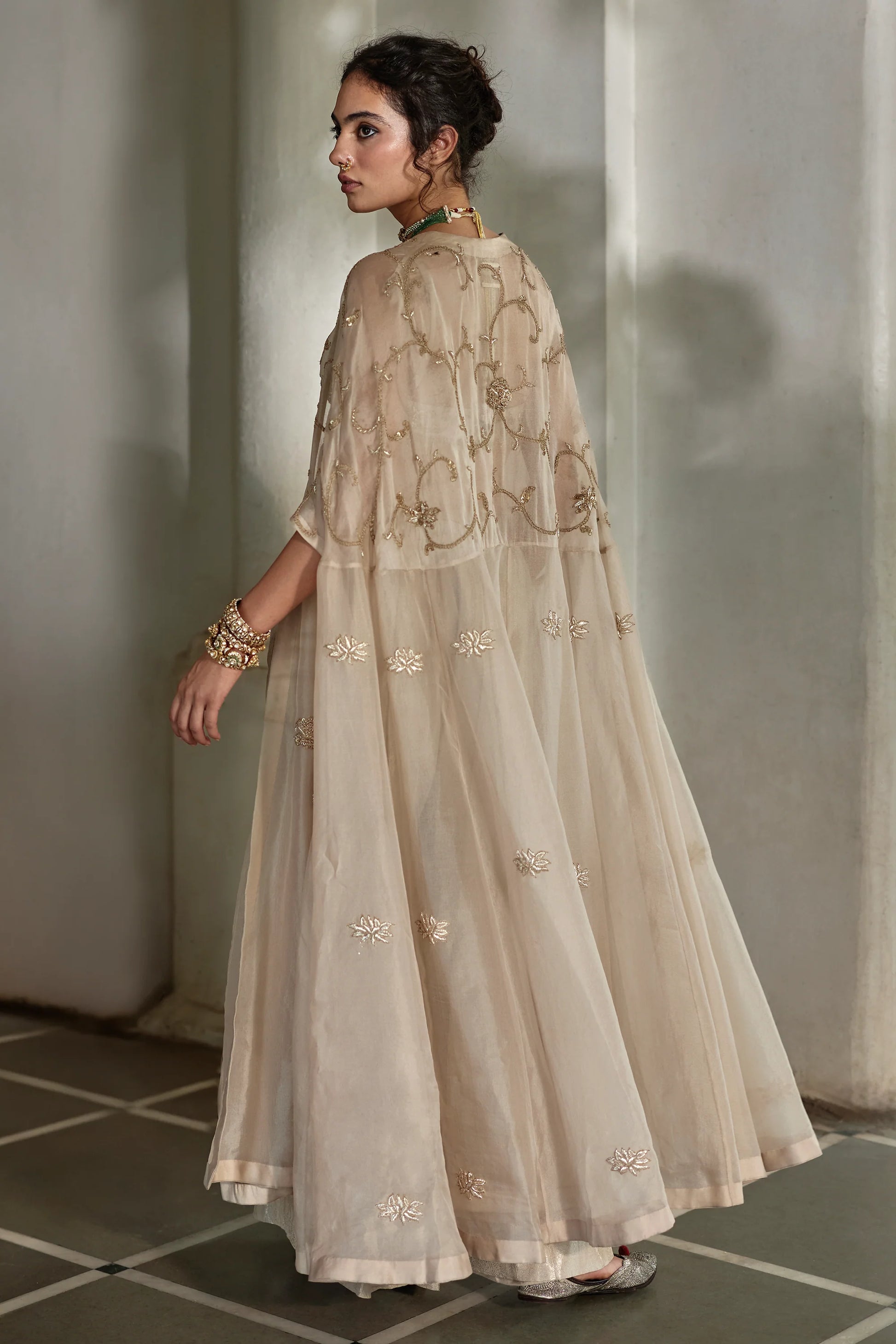 A three-piece ensemble features a blouse adorned with intricate couchni embroidery with delicate waist hangings, paired with luxurious jamavar palazzos that exude regal charm. Completing the look is a pure organza cape, beautifully detailed with couchni and zardosi work that mirrors the blouse, creating a harmonious blend of tradition and contemporary sophistication.