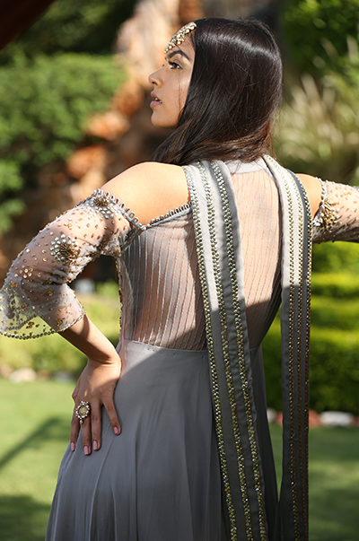 Ash Grey Metallic French Cut Sequins bell sleeves Embellished Gown with embroidered georgette and net dupatta