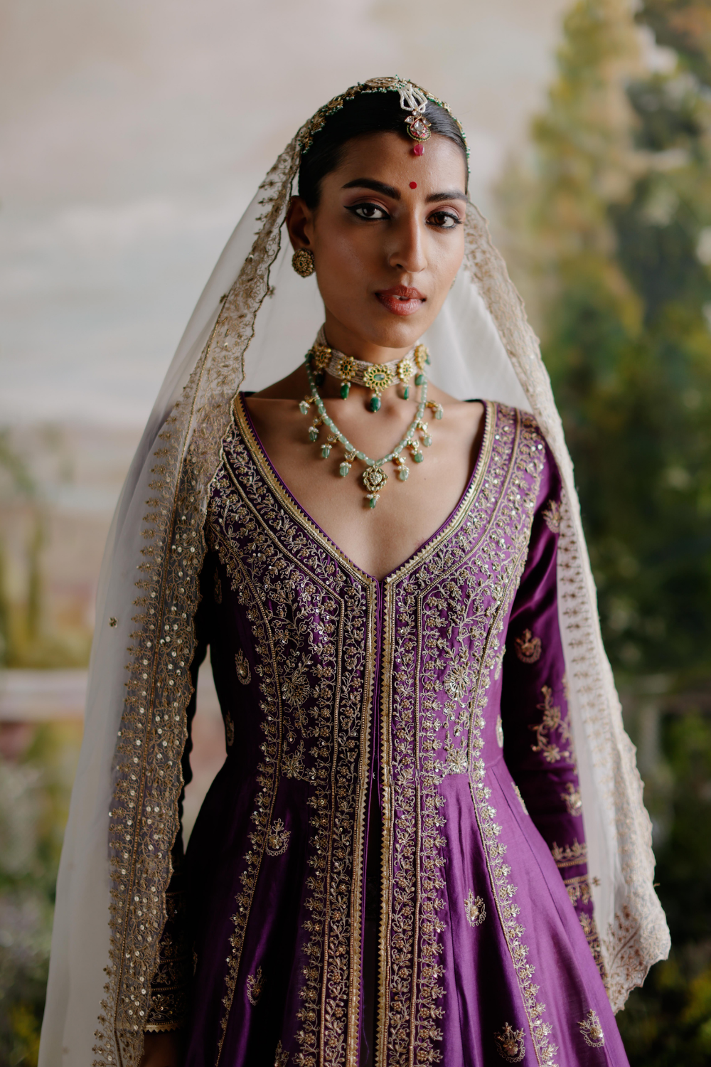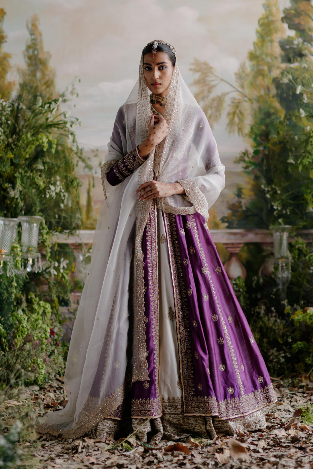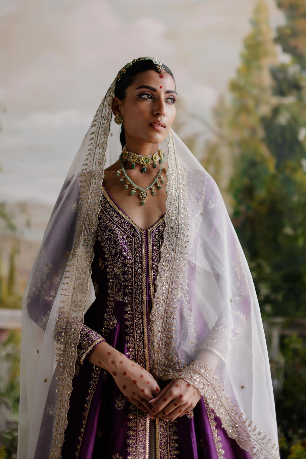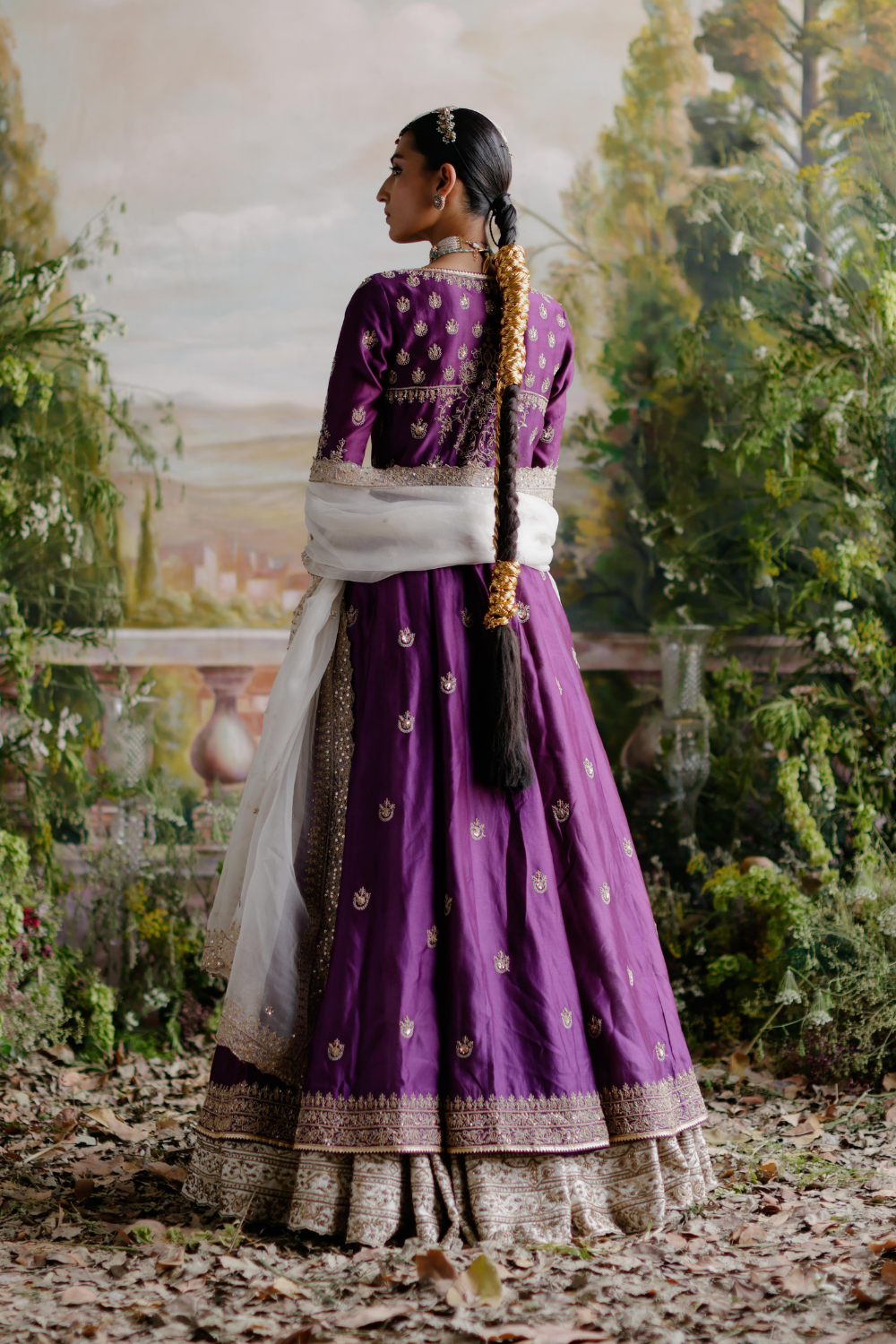 Featuring a purple chanderi jacket paired with a chanderi silk lehenga and organza dupatta with antique gold dori, aari and embellished hand work.