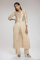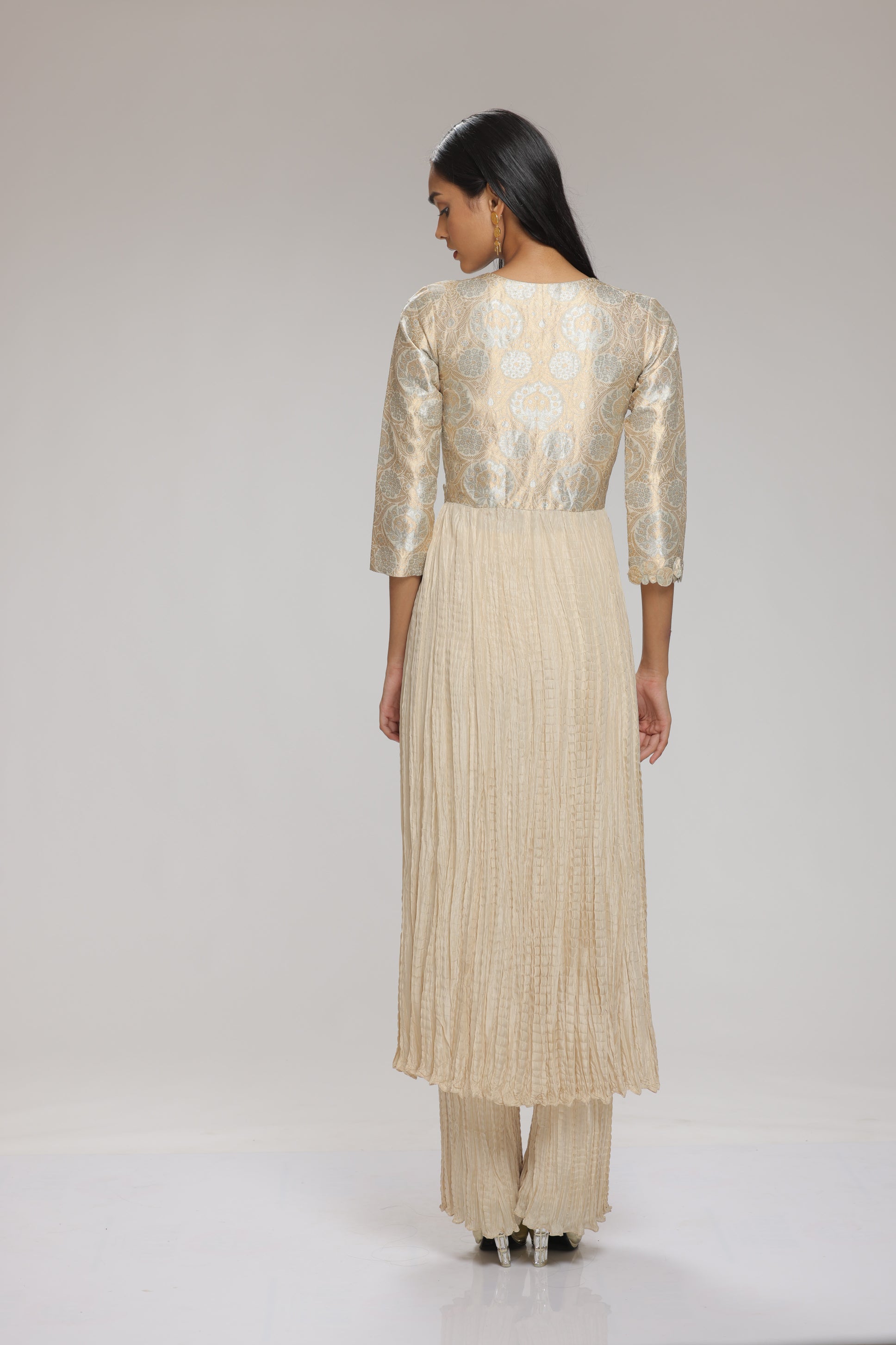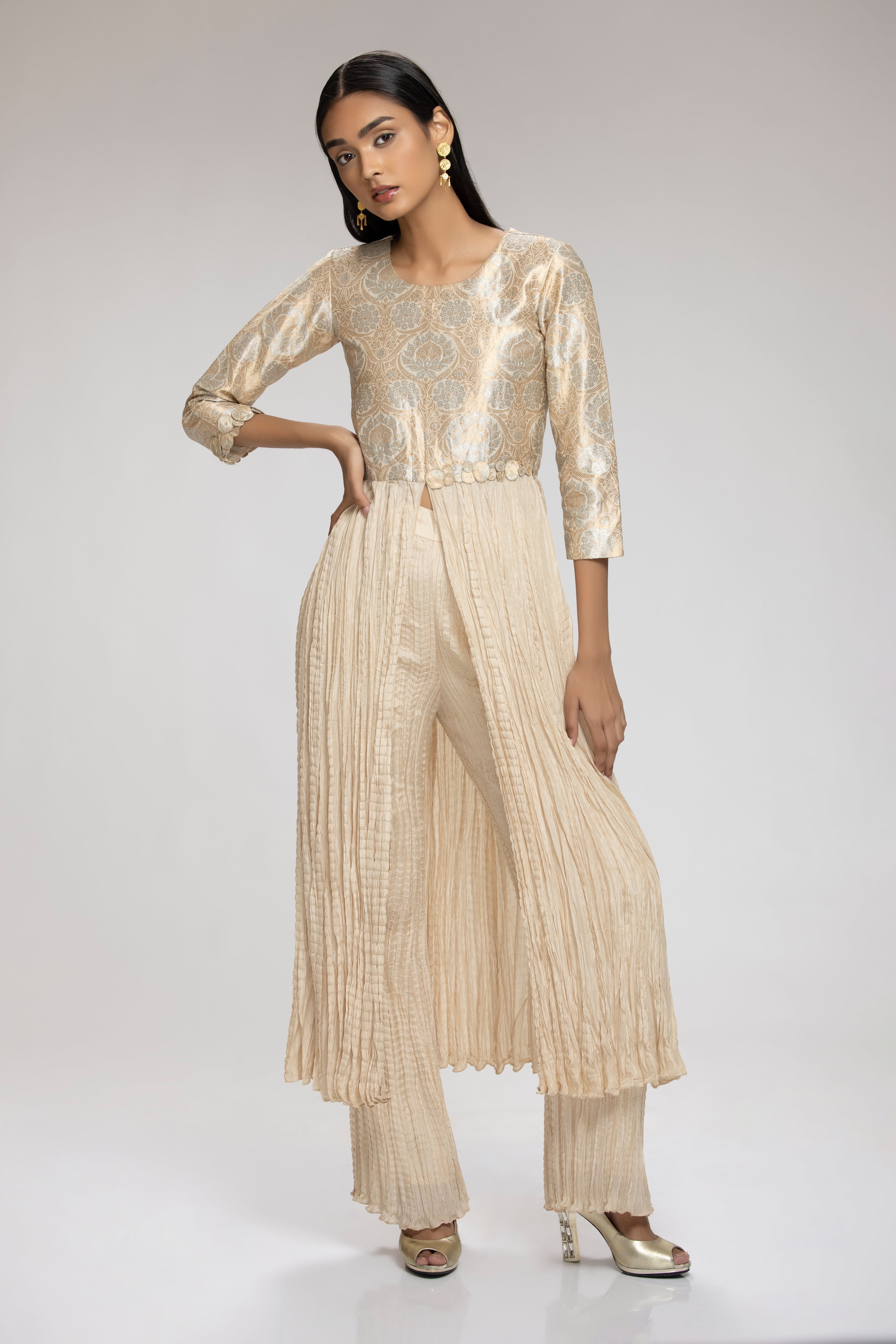 A crinkled Brocade front-open kurta is artfully matched with crinkled Habutai Silk pants. The ensemble is enriched with intricate applique details gracing both the sleeves and bodice.