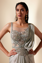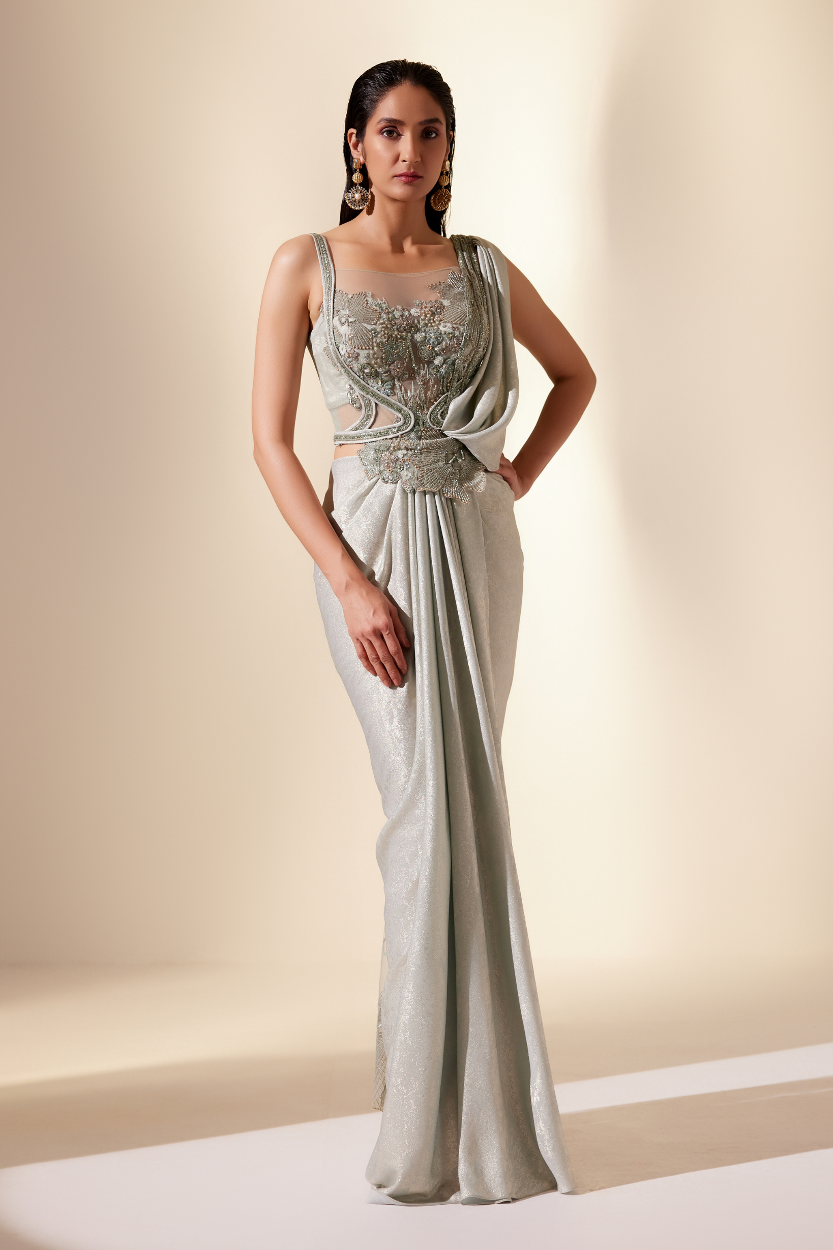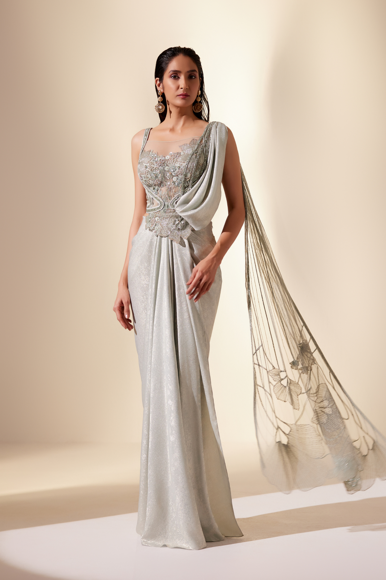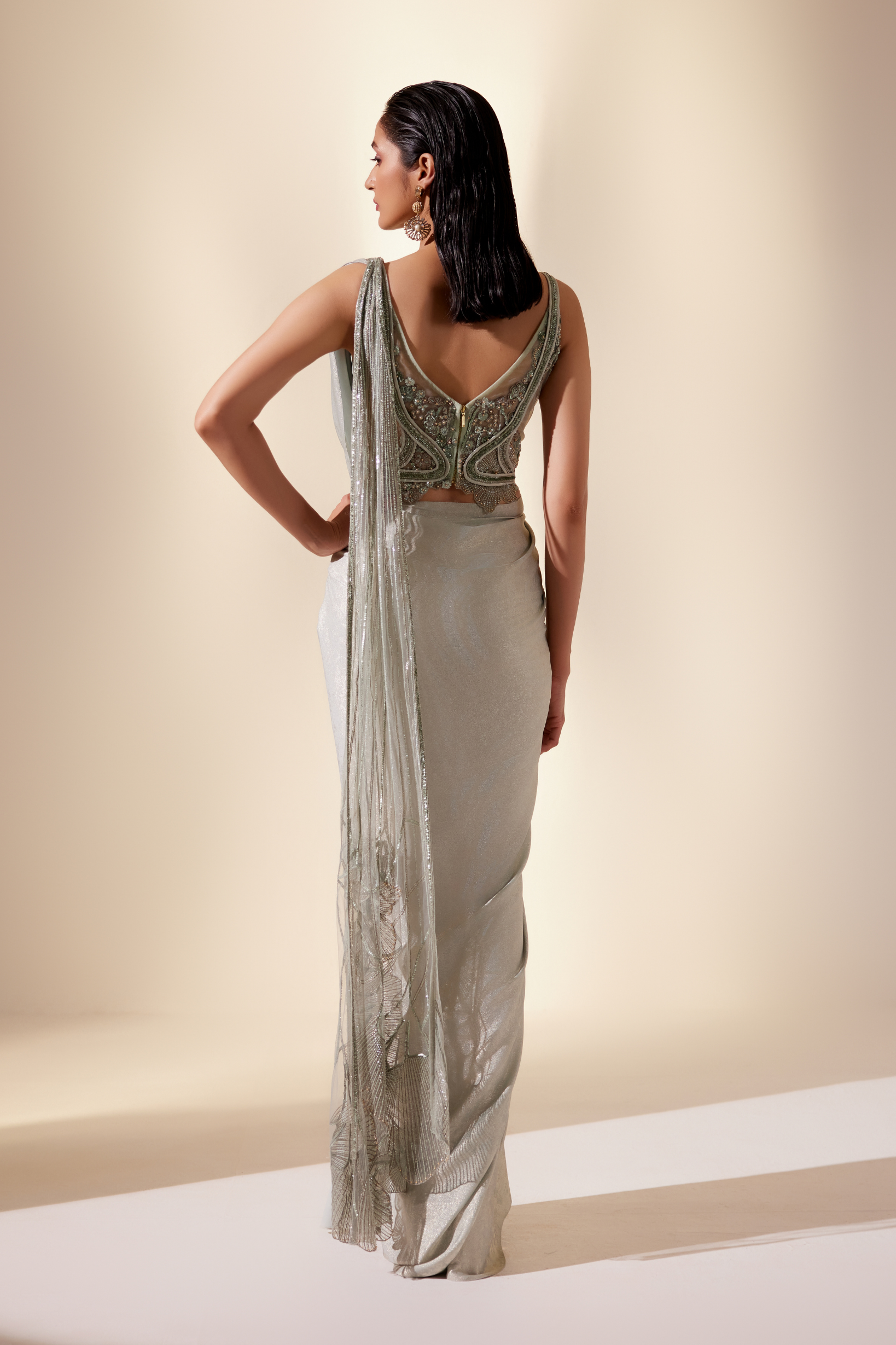 Aurora mint floral saree, a fusion of celestial inspiration and contemporary elegance.
