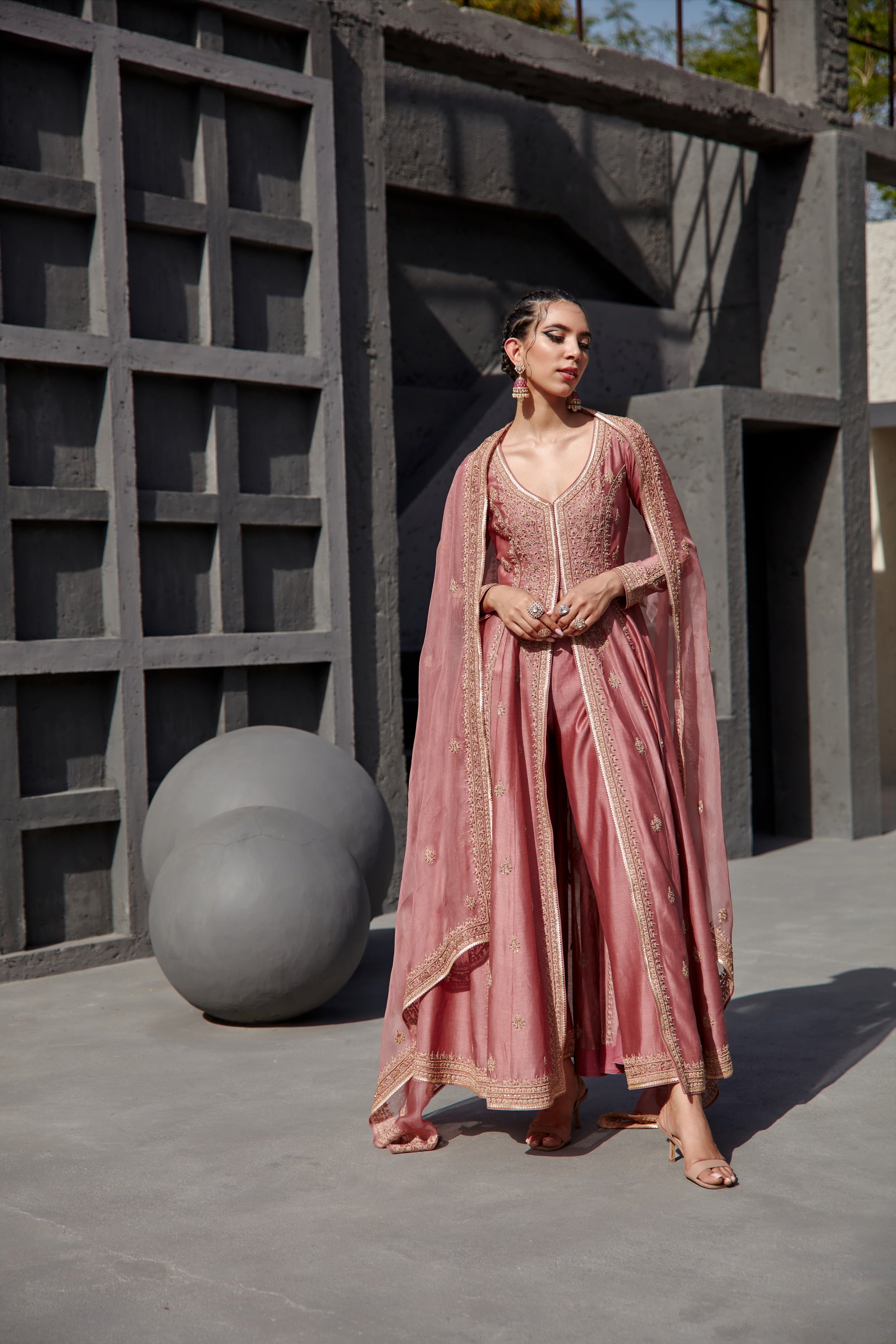Featuring an aurora pink chanderi jacket pant set paired with an organza base dupatta with light gold dori and aari embroidery on it.