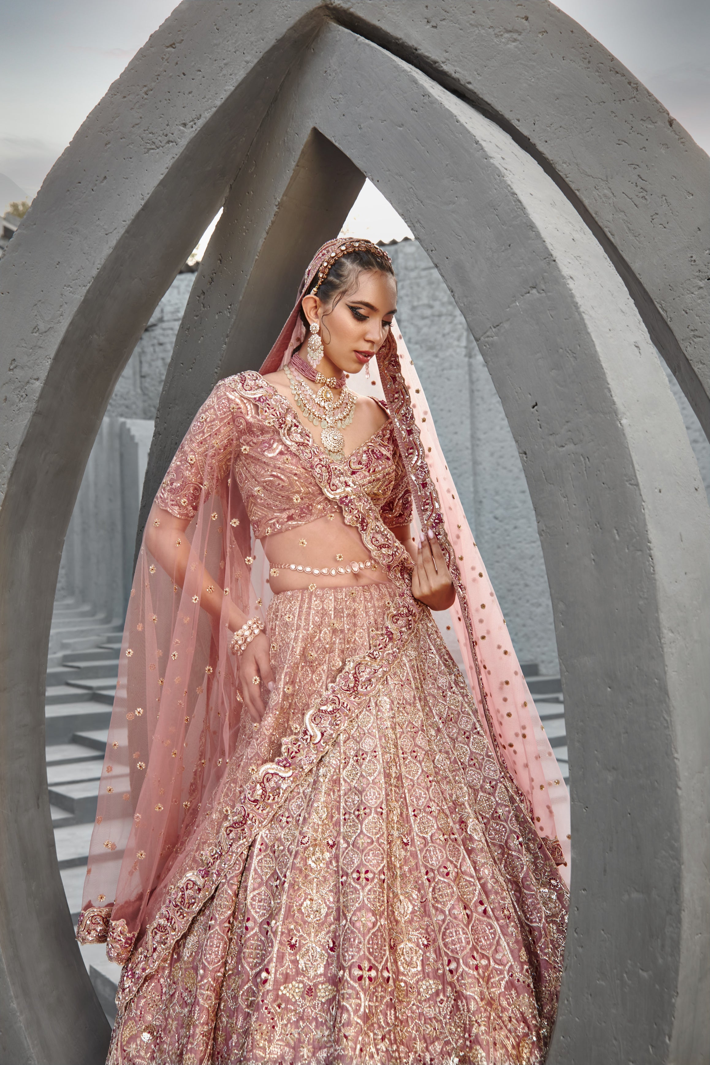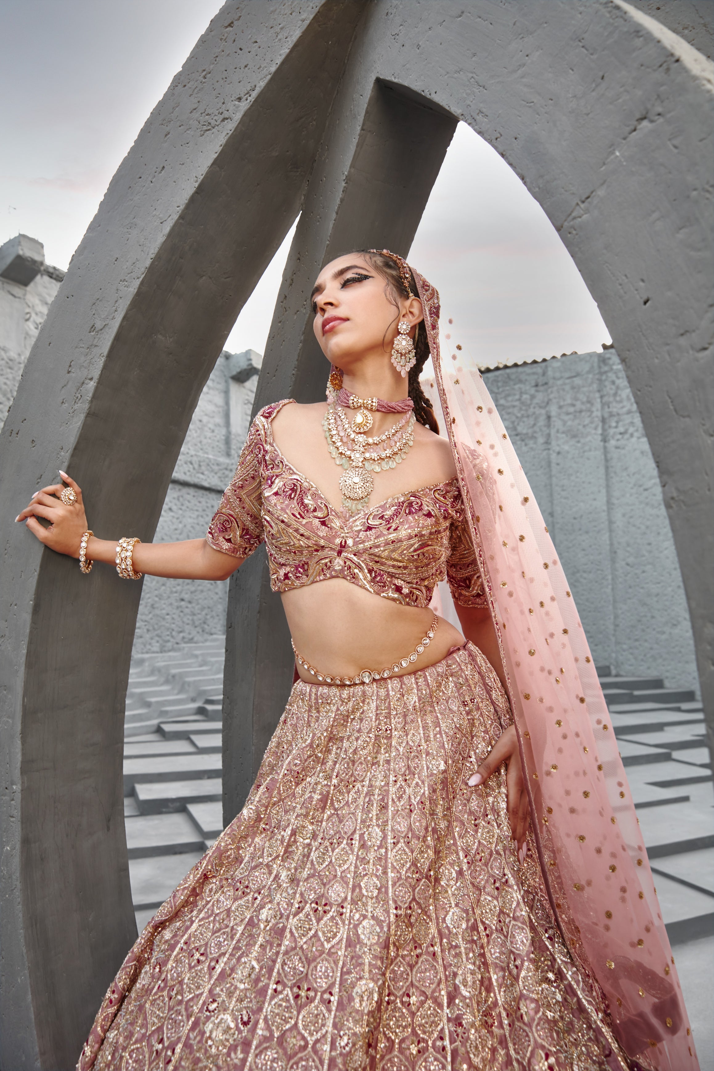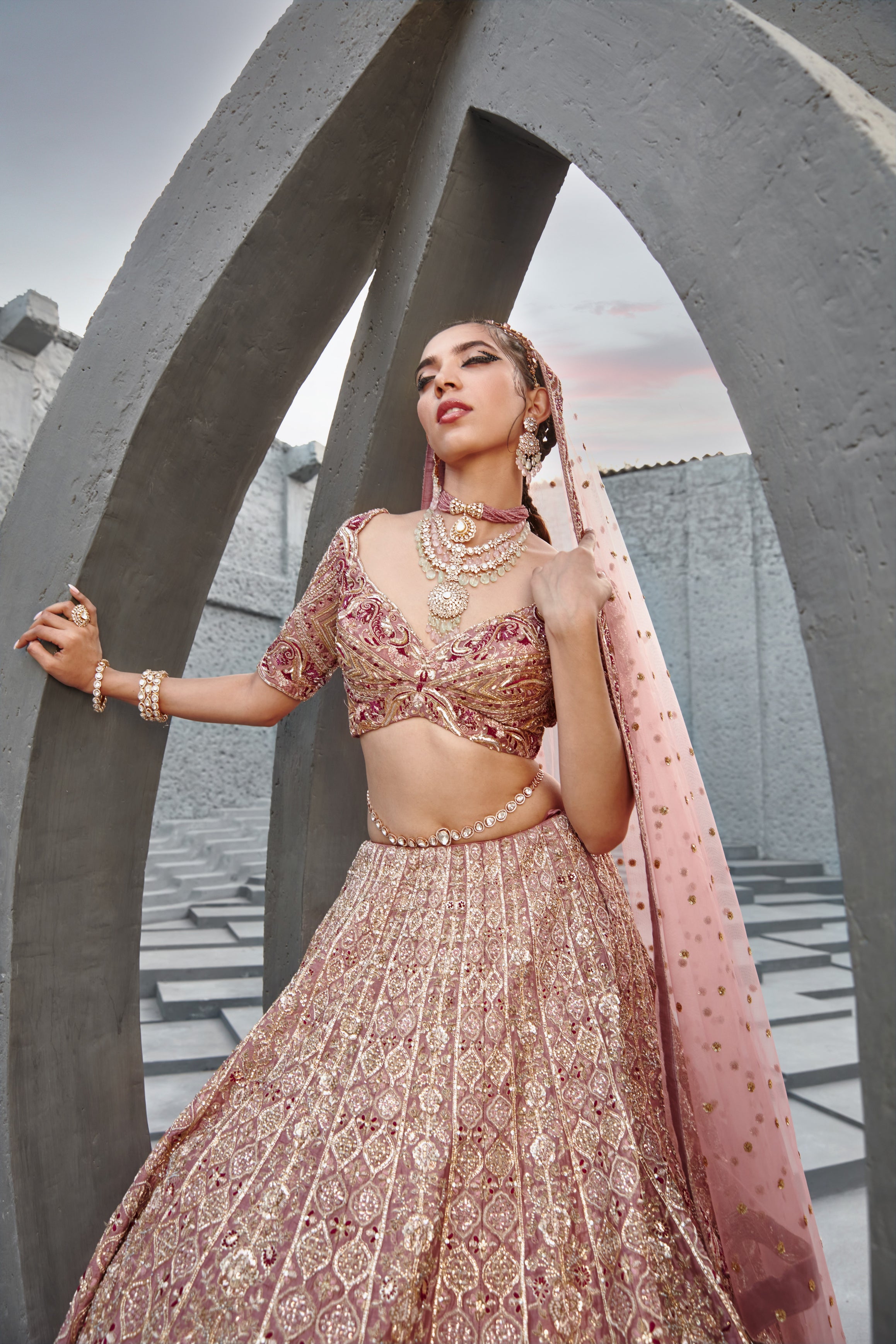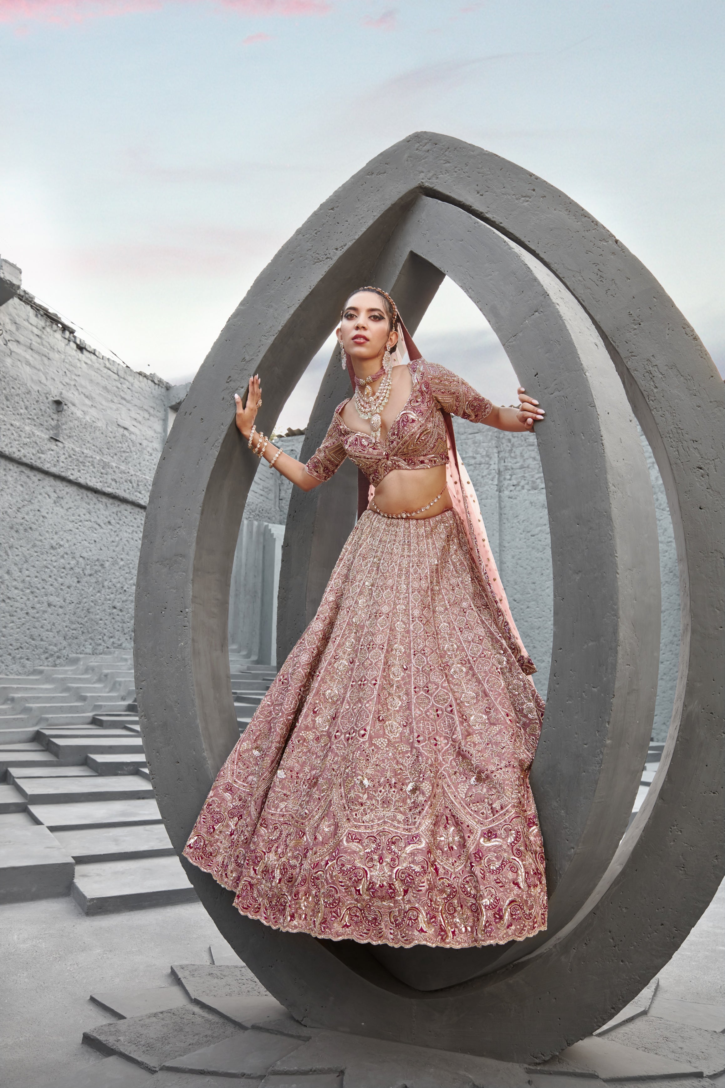Featuring an aurora pink raw silk bridal lehenga set paired with a butterfly net base dupatta with pink wine thread, rose gold zardozi, and aari embroidery.