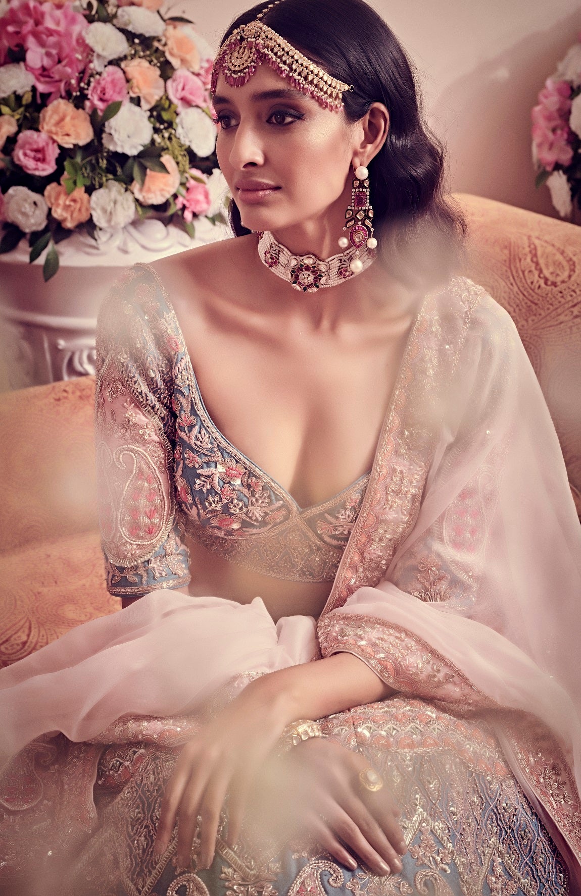 Dayena in avant garde blue hued lehenga.The custom blouse is intricately embellished with light pink raw silk patch work on sleeves. The ensemble is further detailed with vintage embroidery and exquisite thread work spread with a dynamic range of colour palette, paired with double dupatta organza draping to complete the look!