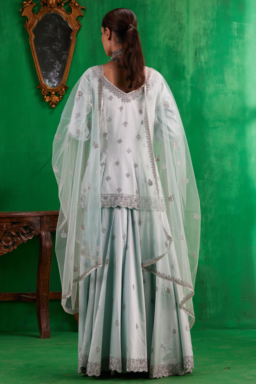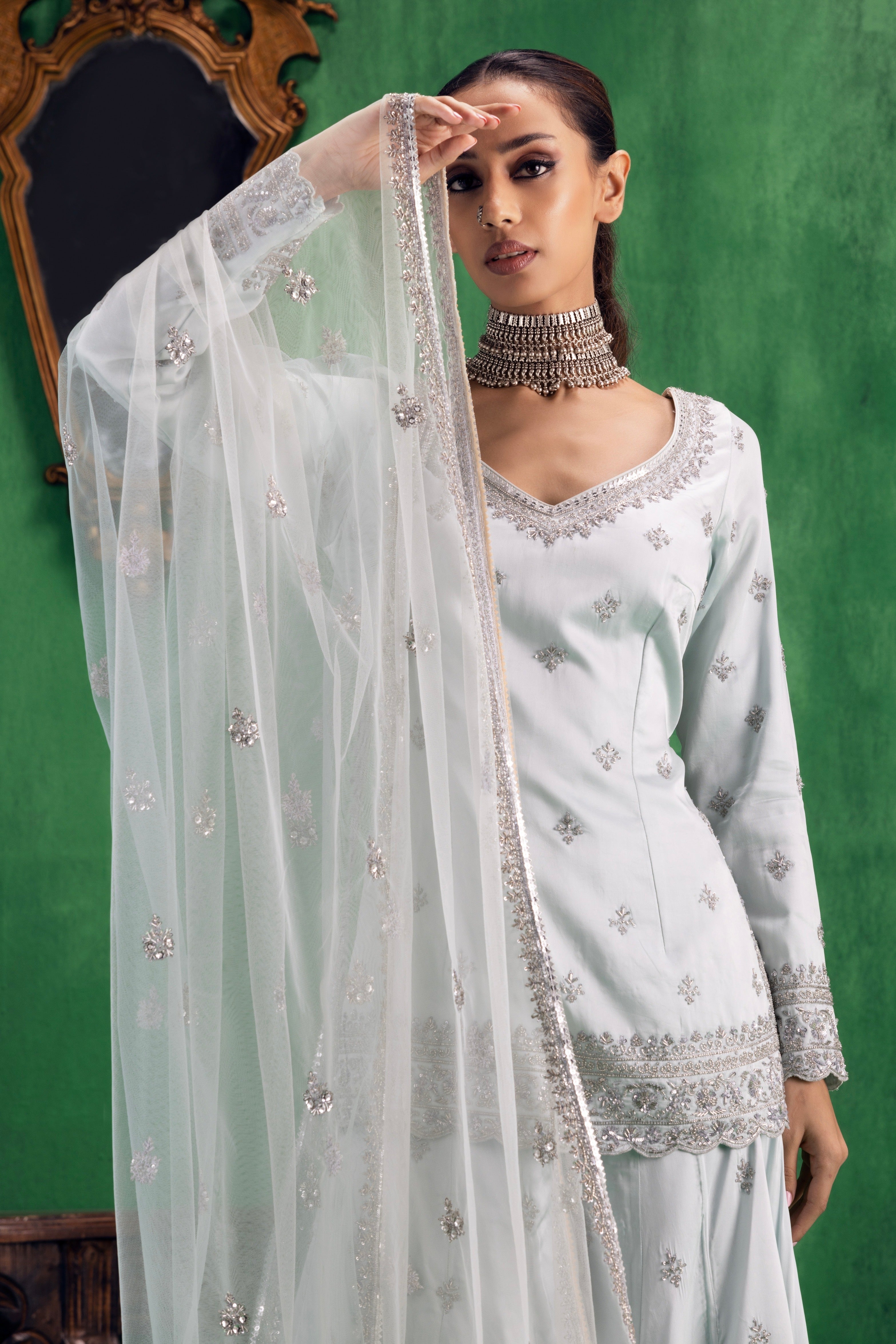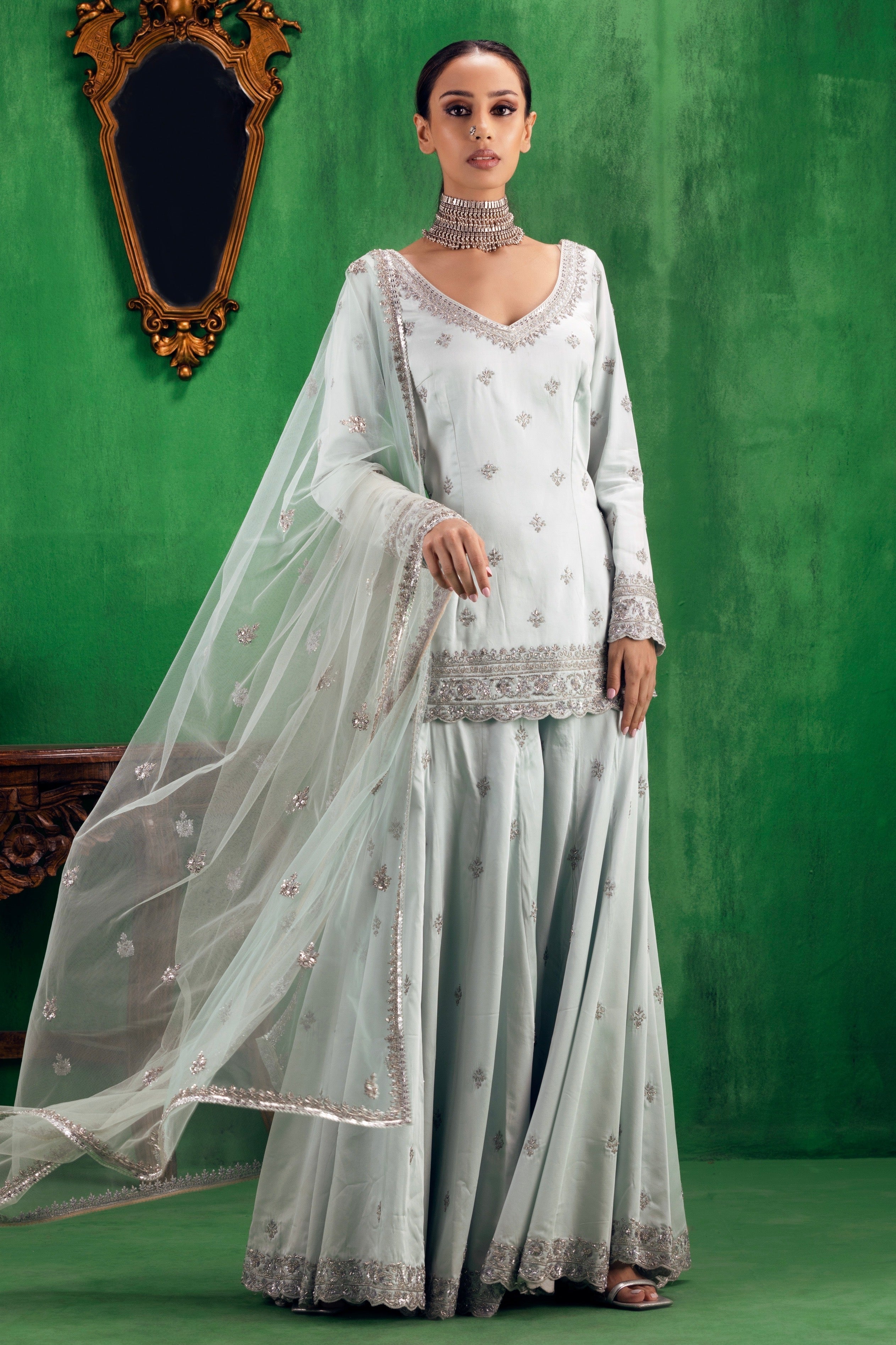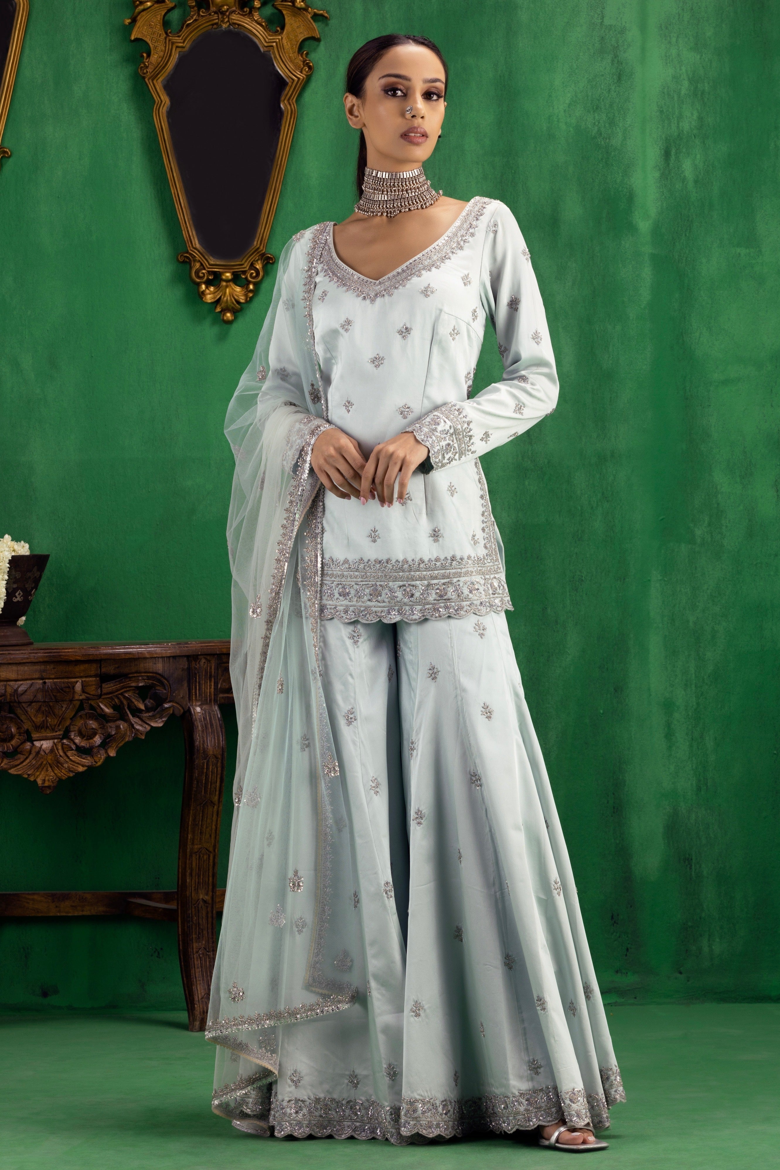 Featuring an ice blue Dupian silk kurta sharara set paired with a butterfly net dupatta with silver dori and aari embroidery