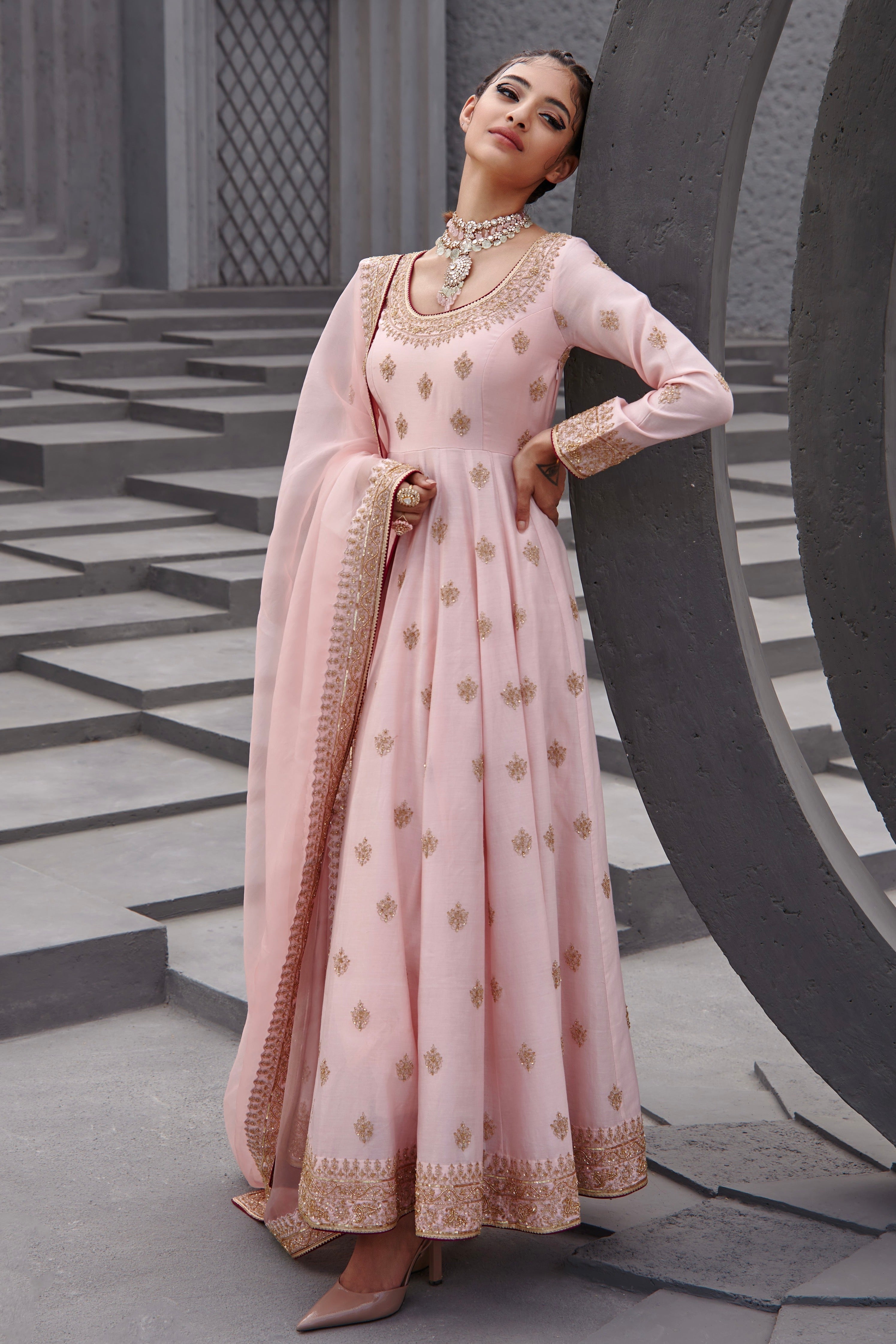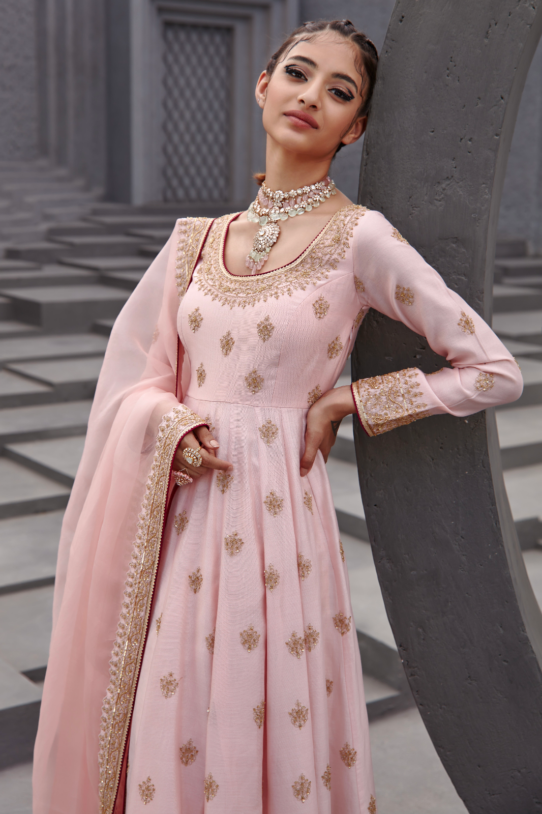 Featuring a pink Chanderi anarkali paired with a cotton silk churidar and an organza dupatta with gold dori and aari embroidery