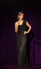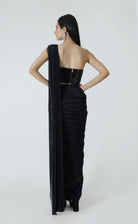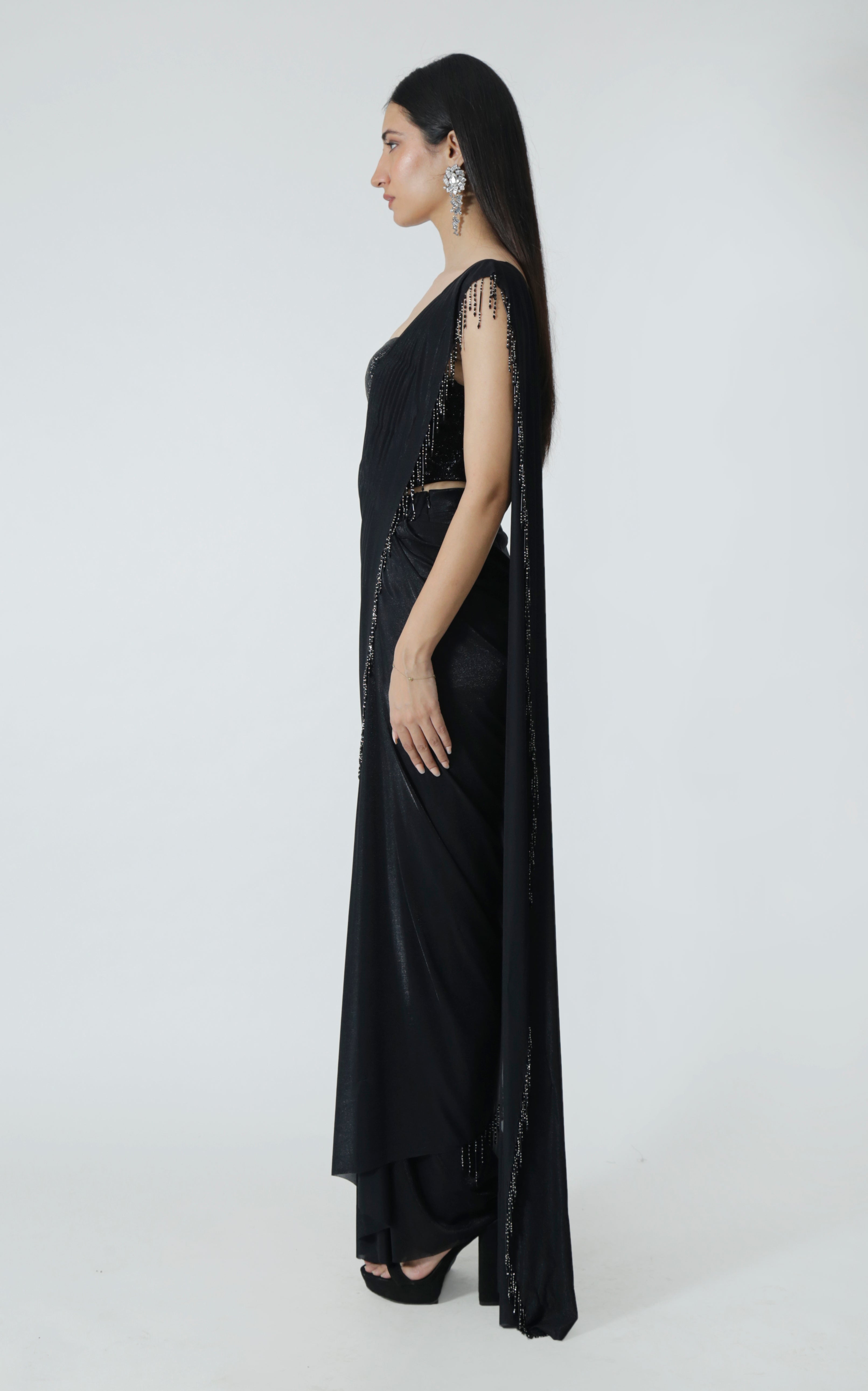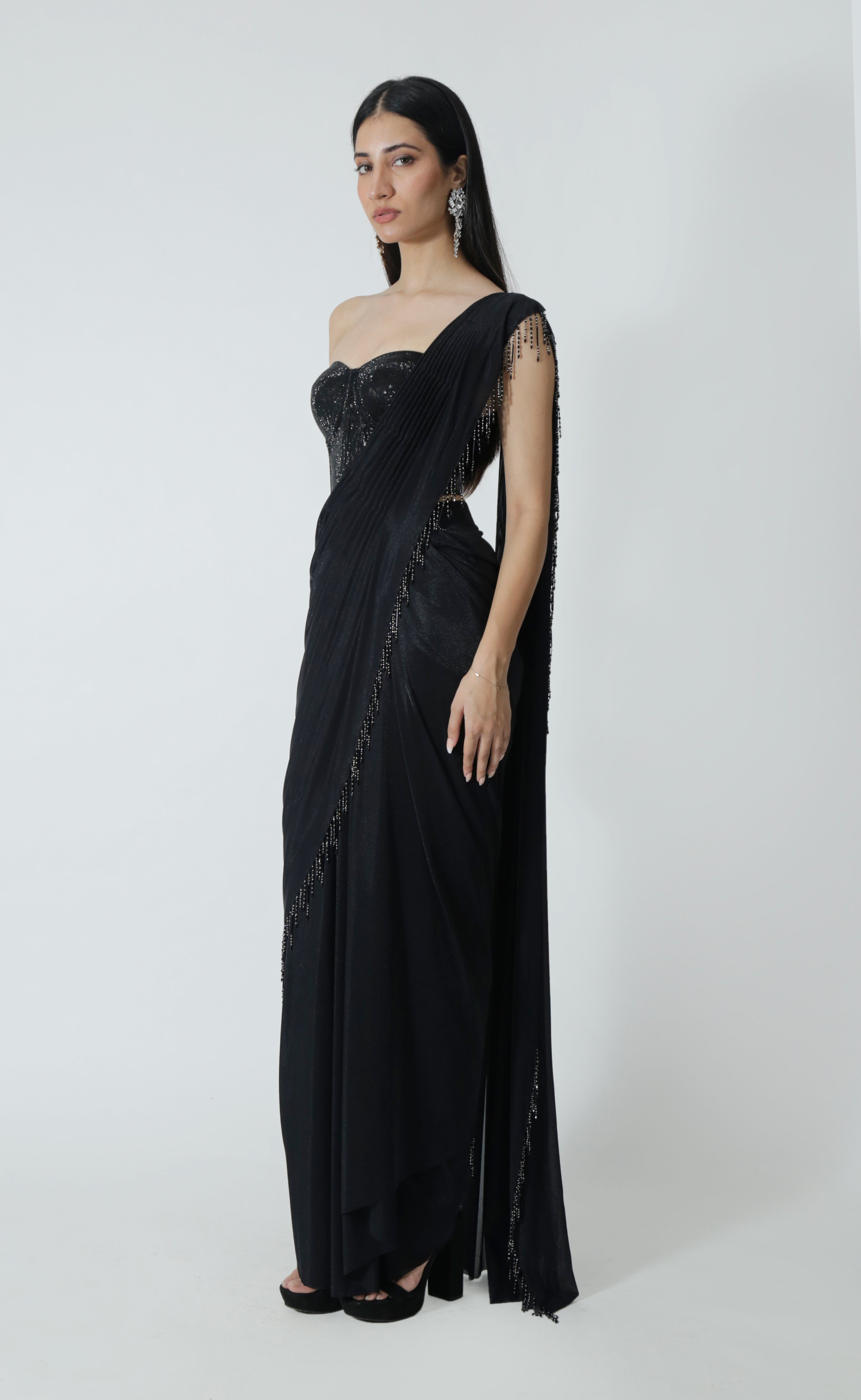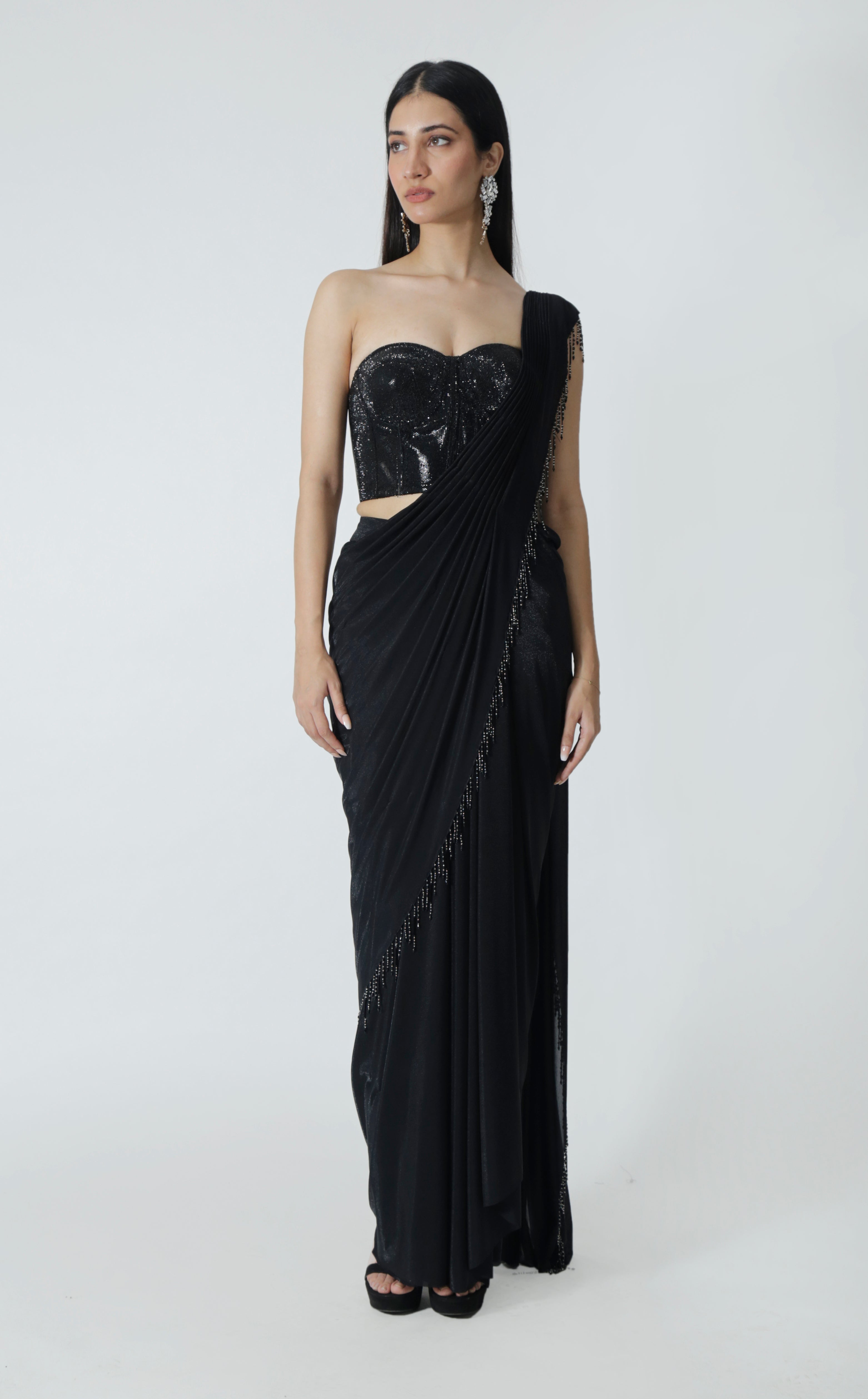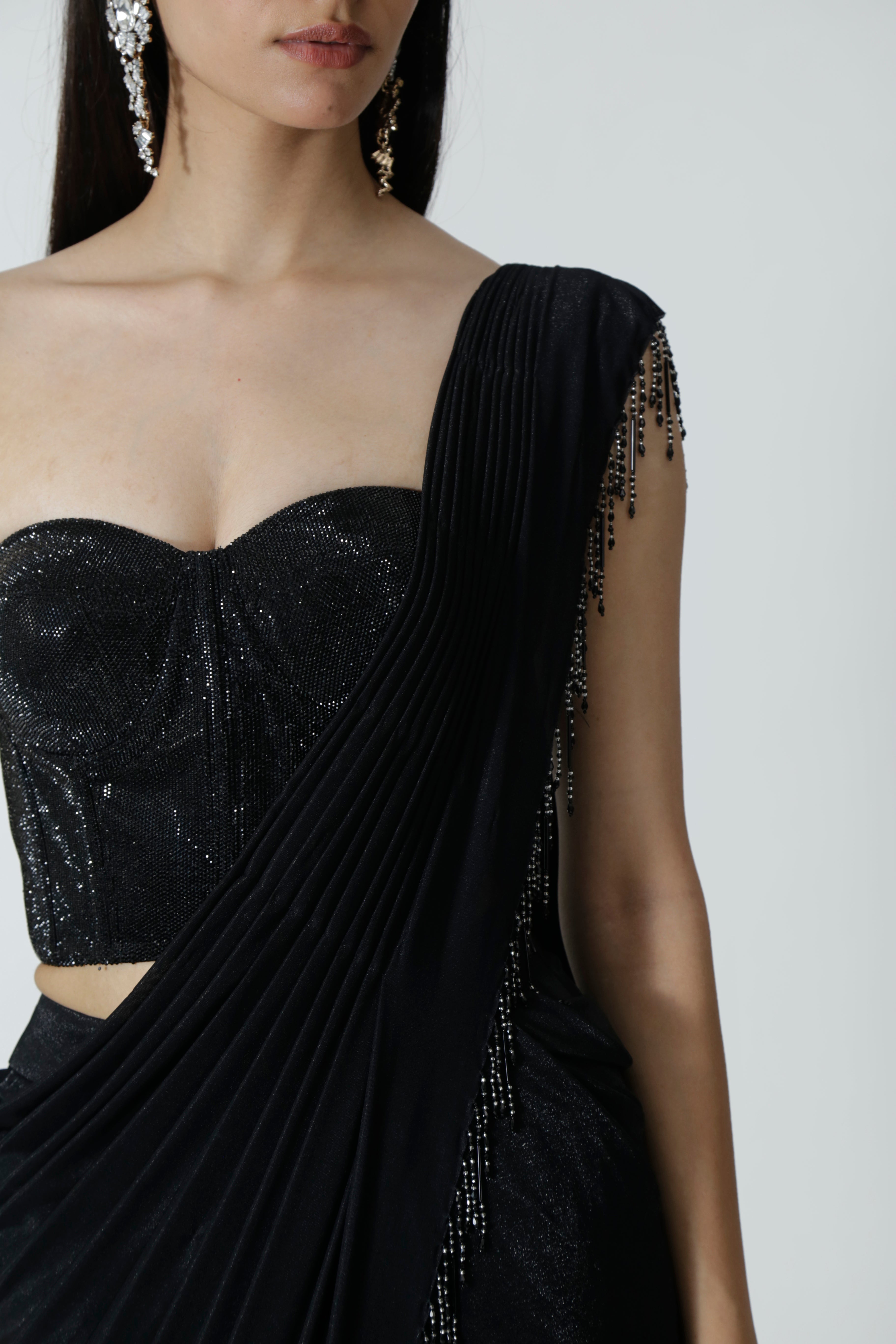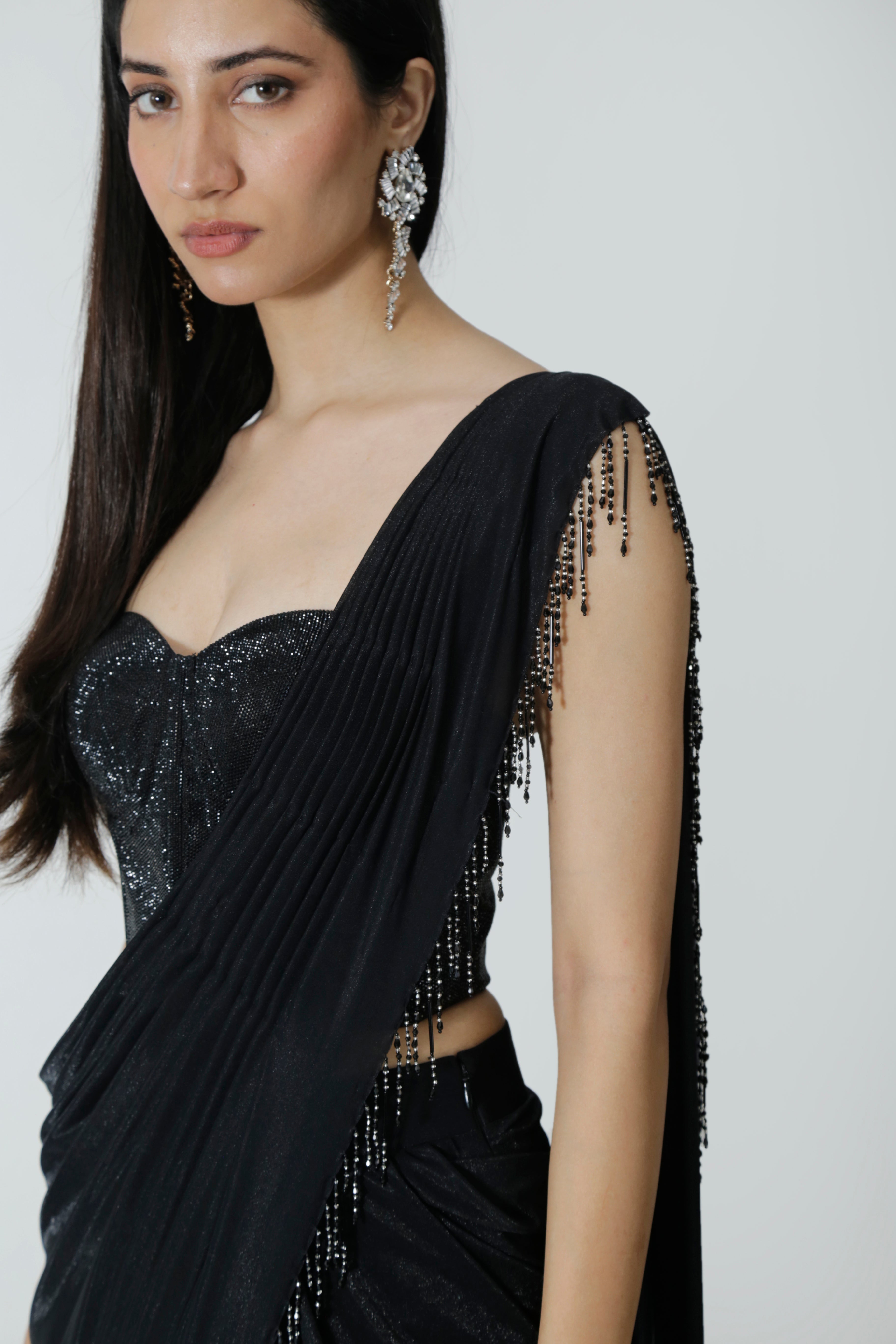 A Black pre-draped lycra saree, adorned with tassels, paired with a dazzling rhinestones encrusted corset.