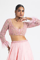 Baby Pink Embroidered Georgette Lehenga And Dupatta With A Long-Sleeved Nude Choli Embroidered In Contrast Resham, Beads, Sequins, And Crystals, Finished With Feathers.